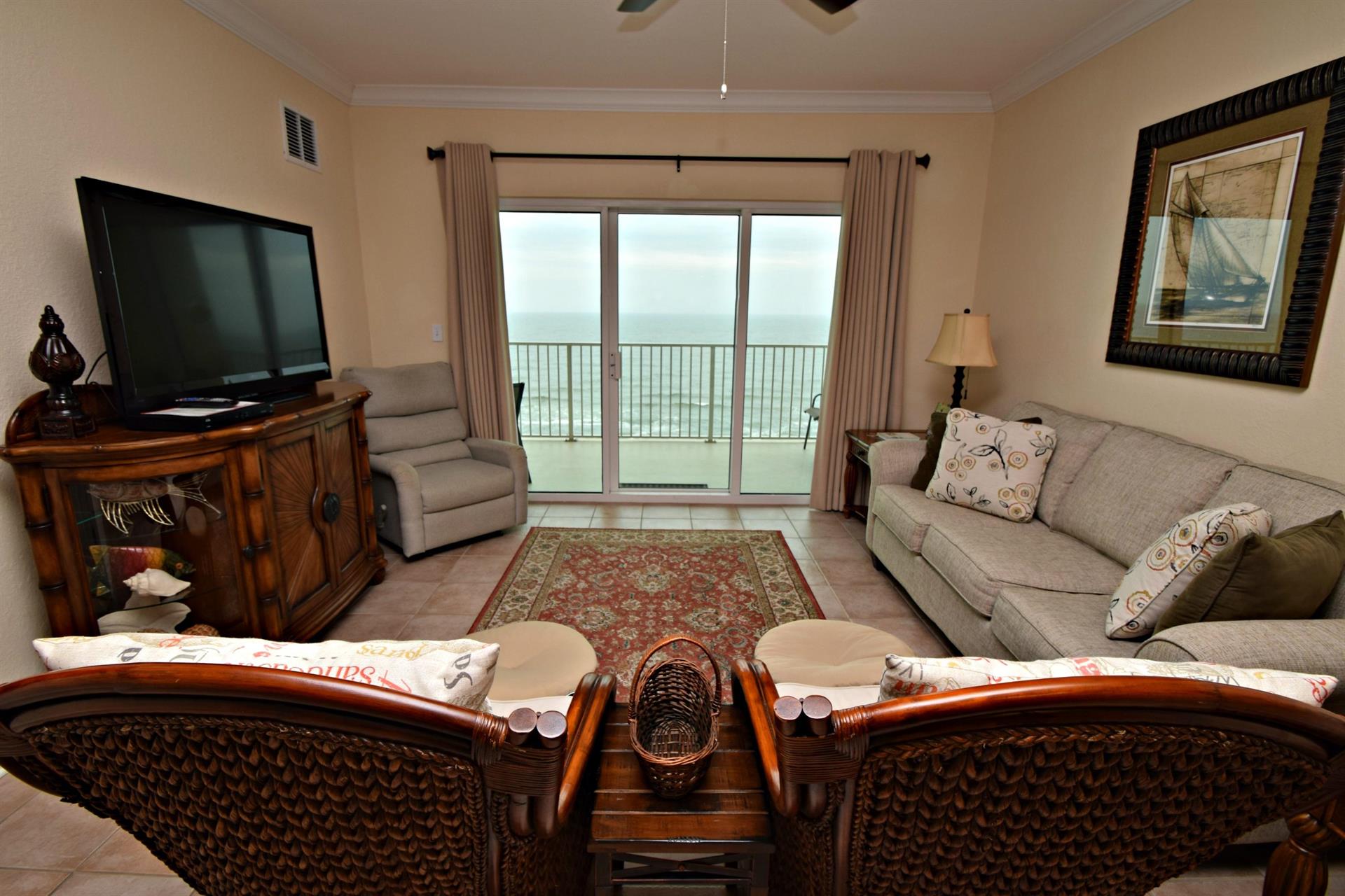 living room opens up to a large balcony overlooking the beach and Gulf of