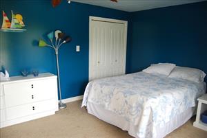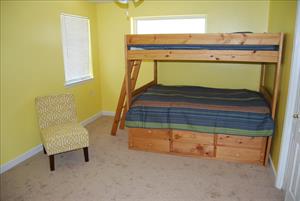 bedroom has a queen bed and the third bedroom has a bunk bed with two full