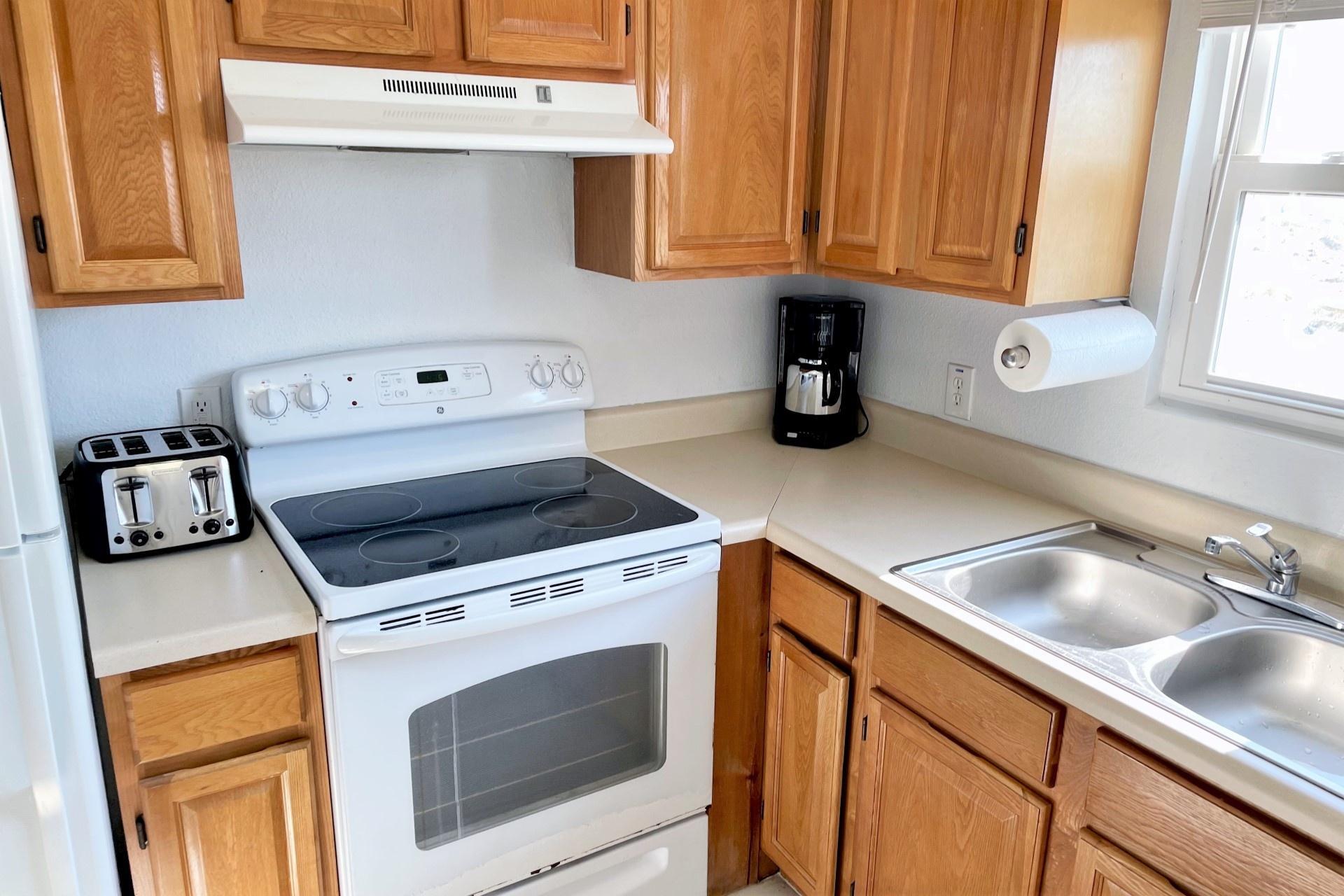 The kitchen is well-equipped with quality appliances and stocked with all