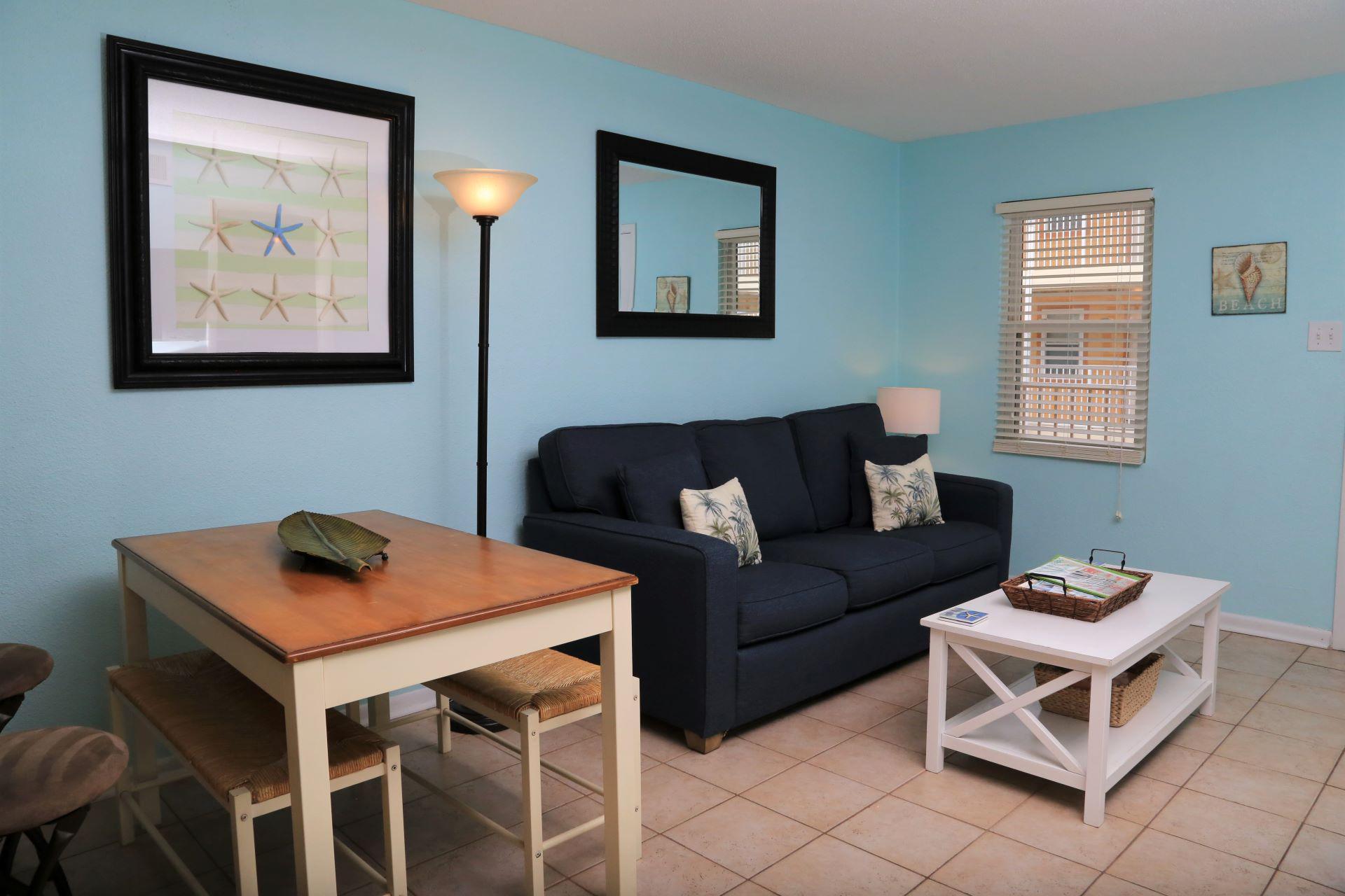 recently upgraded sleeper sofa in living room. The bright, coastal hued walls