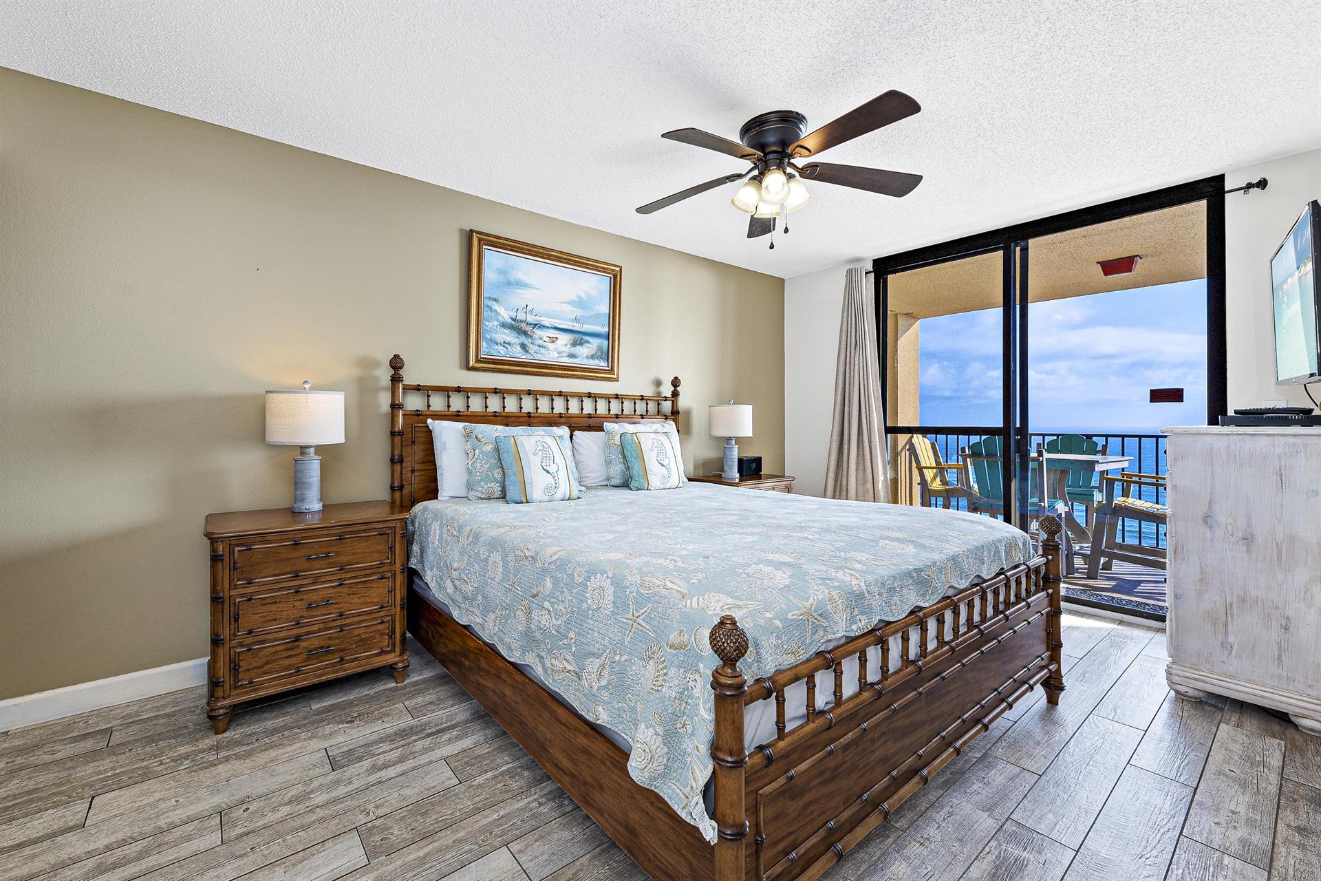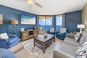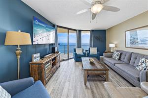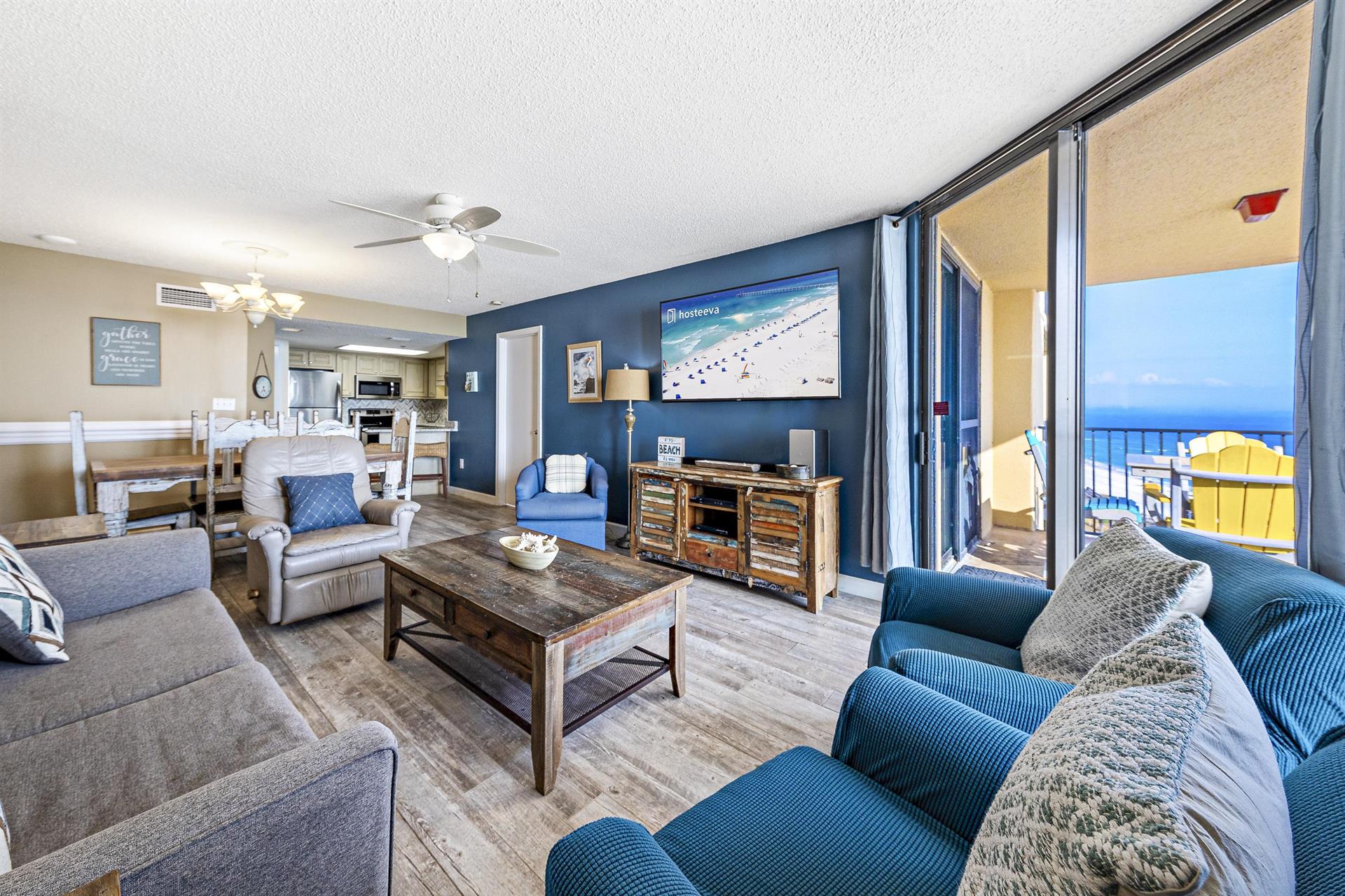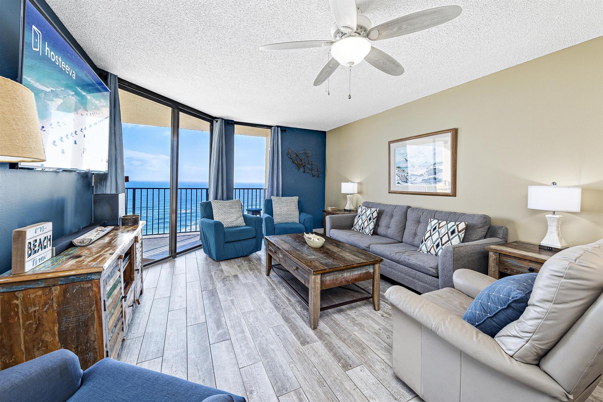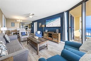 This family-friendly condo has a fully equipped kitchen and a great living room with large floor-to-ceiling windows looking out to sea. The living room and master room doors open to the beach-view balcony with a seating area perfect to start your day with a cup of coffee or tea and to enjoy the awesome view.