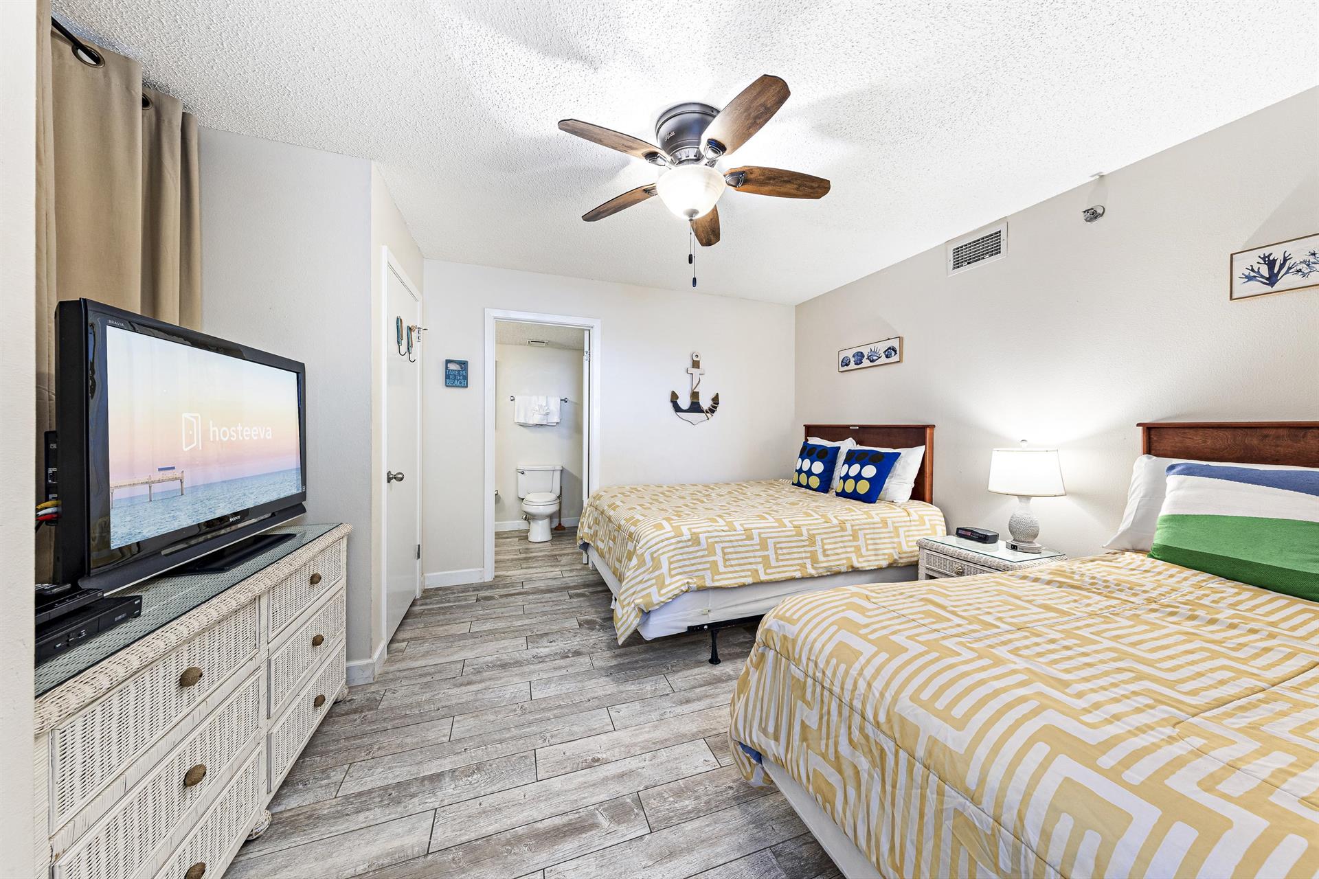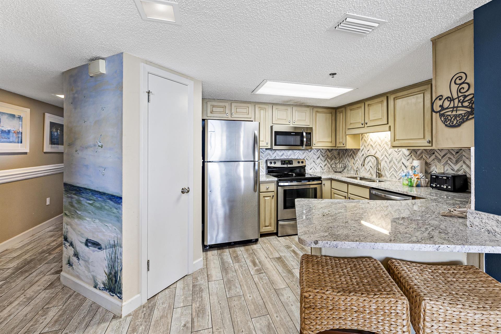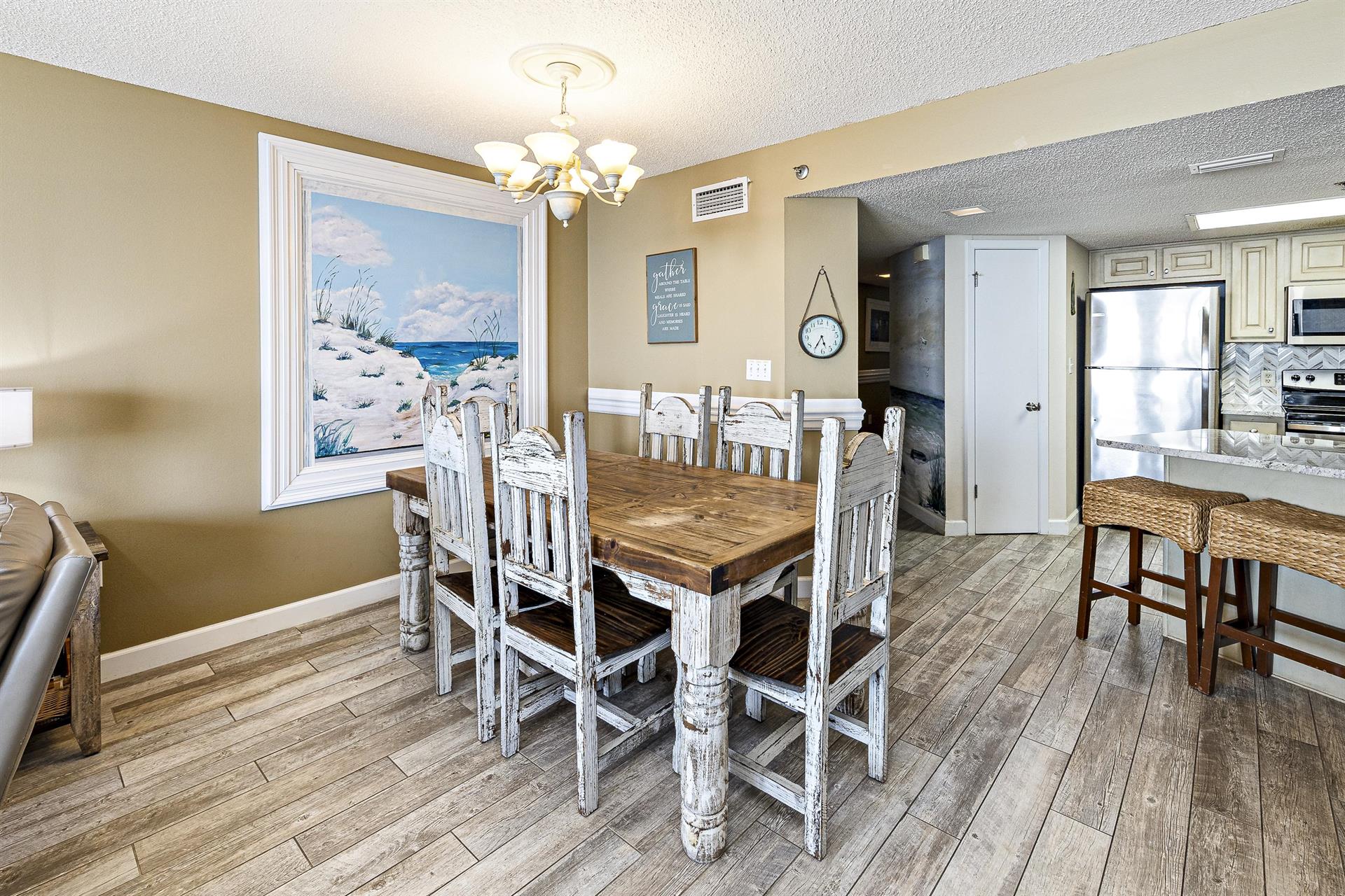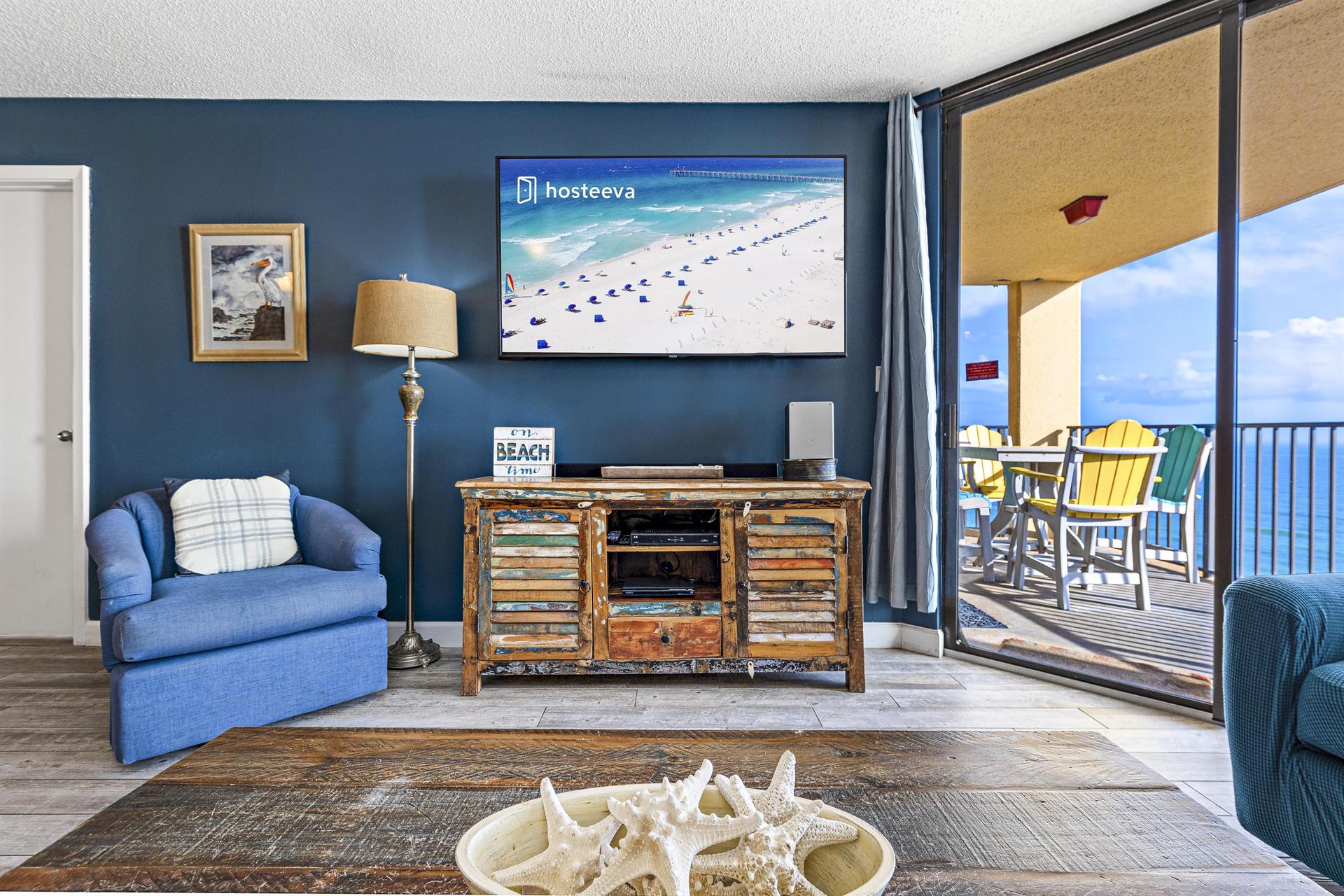 This family-friendly condo has a fully equipped kitchen and a great living room with large floor-to-ceiling windows looking out to sea. The living room and master room doors open to the beach-view balcony with a seating area perfect to start your day with a cup of coffee or tea and to enjoy the awesome view.