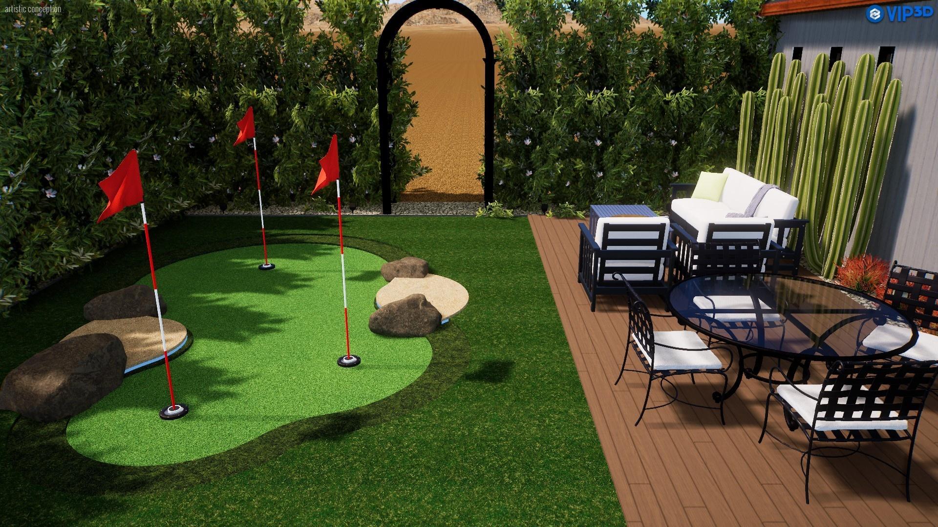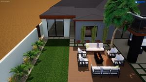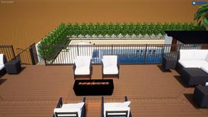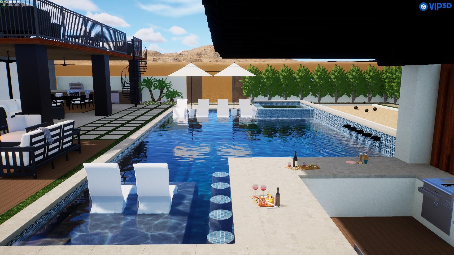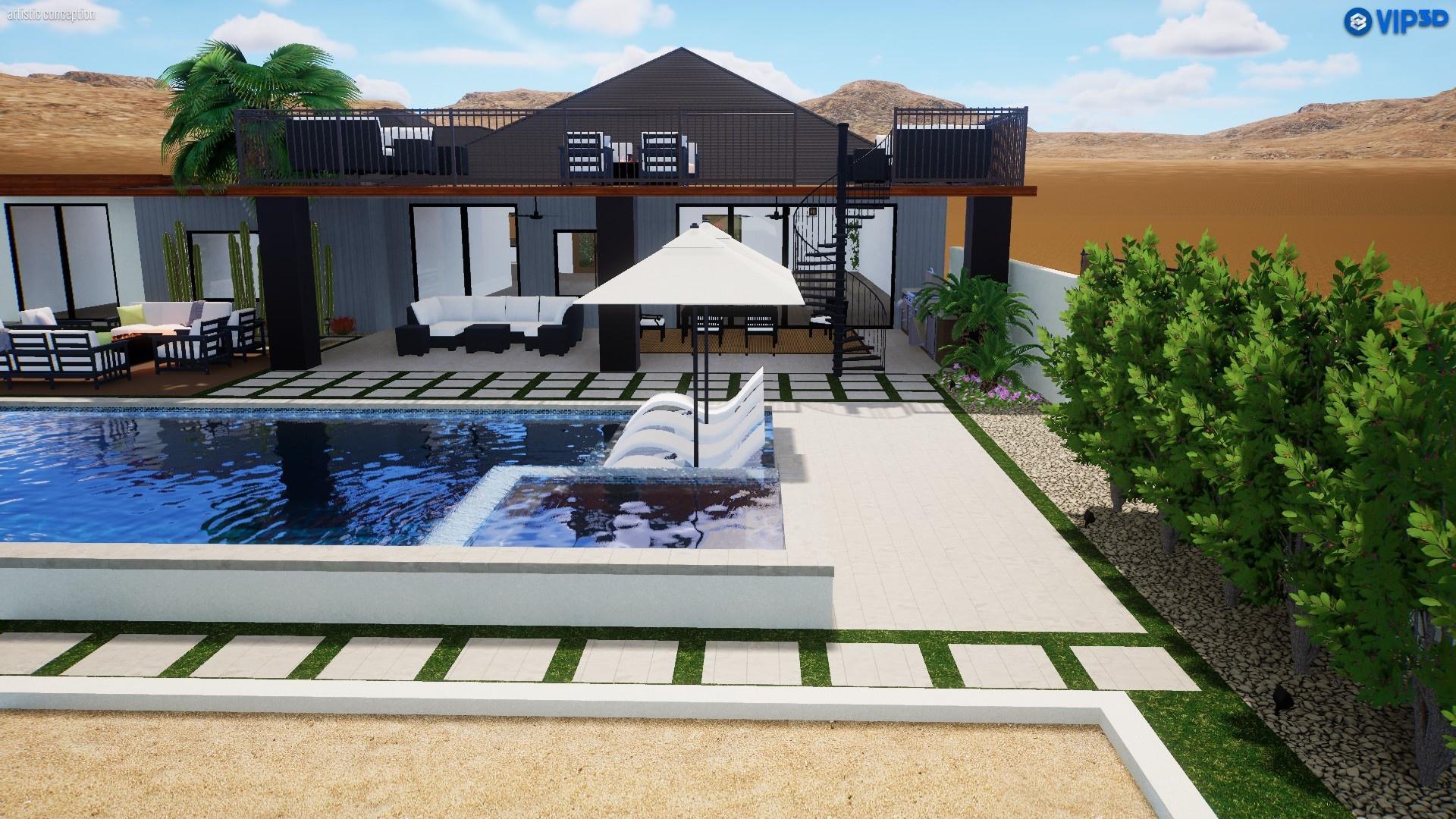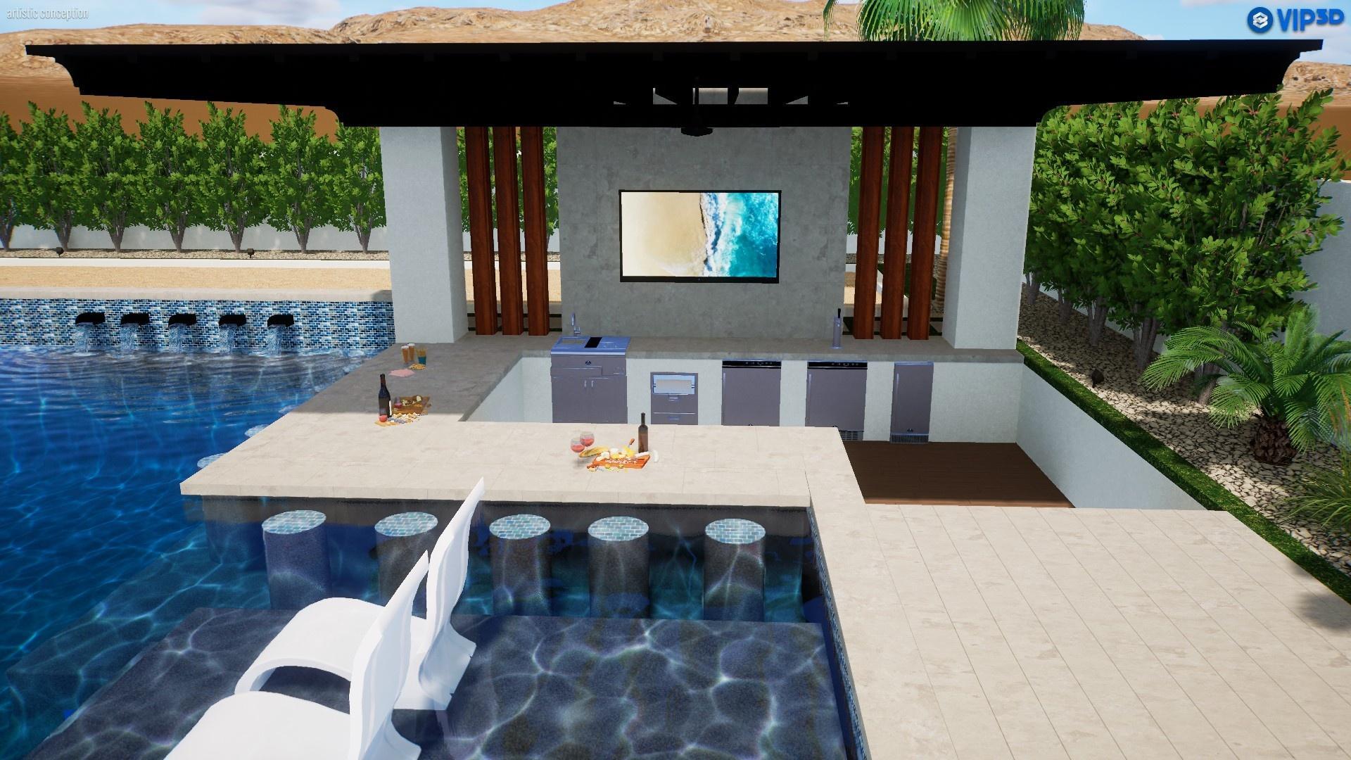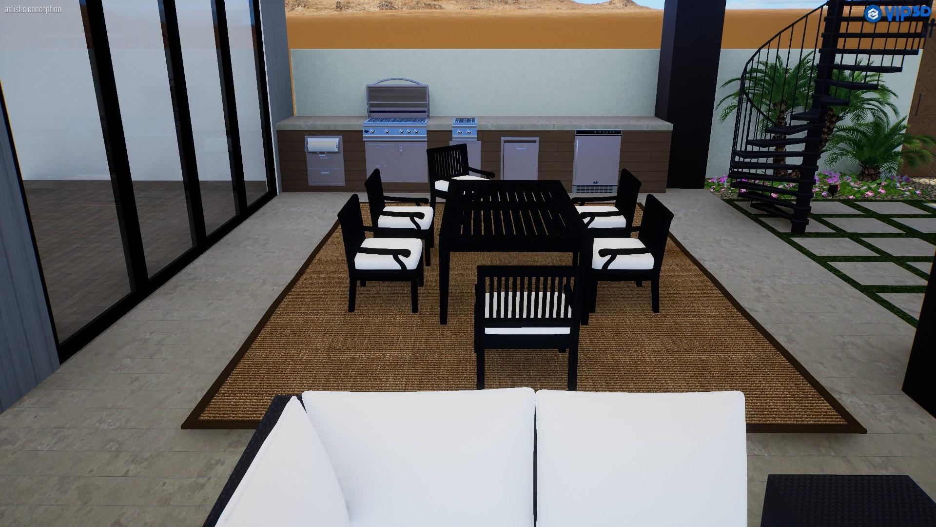 the outdoor grill and cooking area, a more private sofa seating underneath a