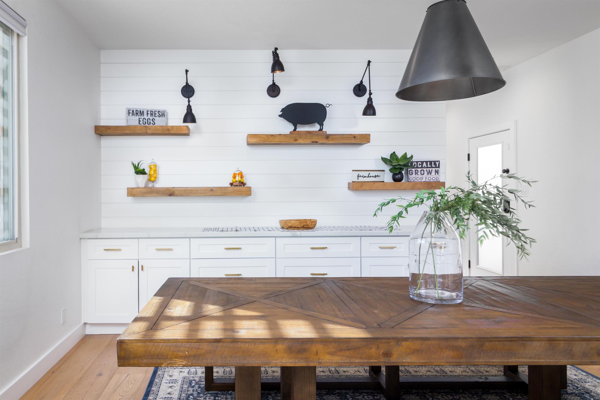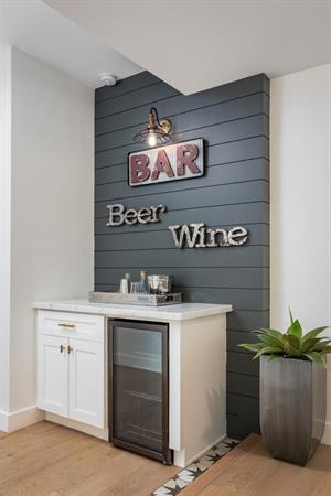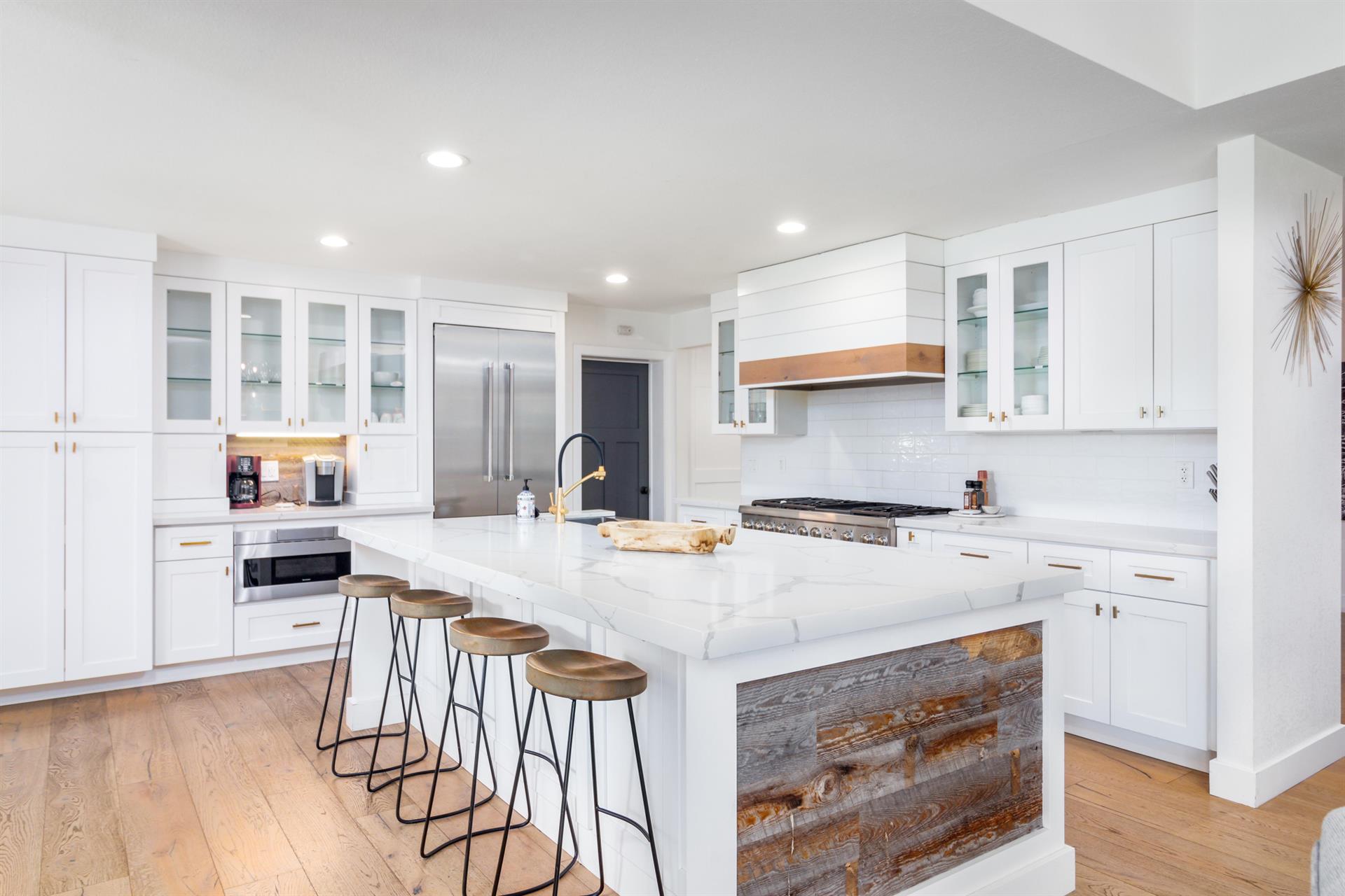 entire group. Bright quartz countertops and subway tiles complement the rustic