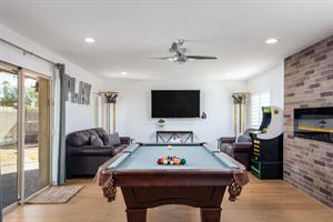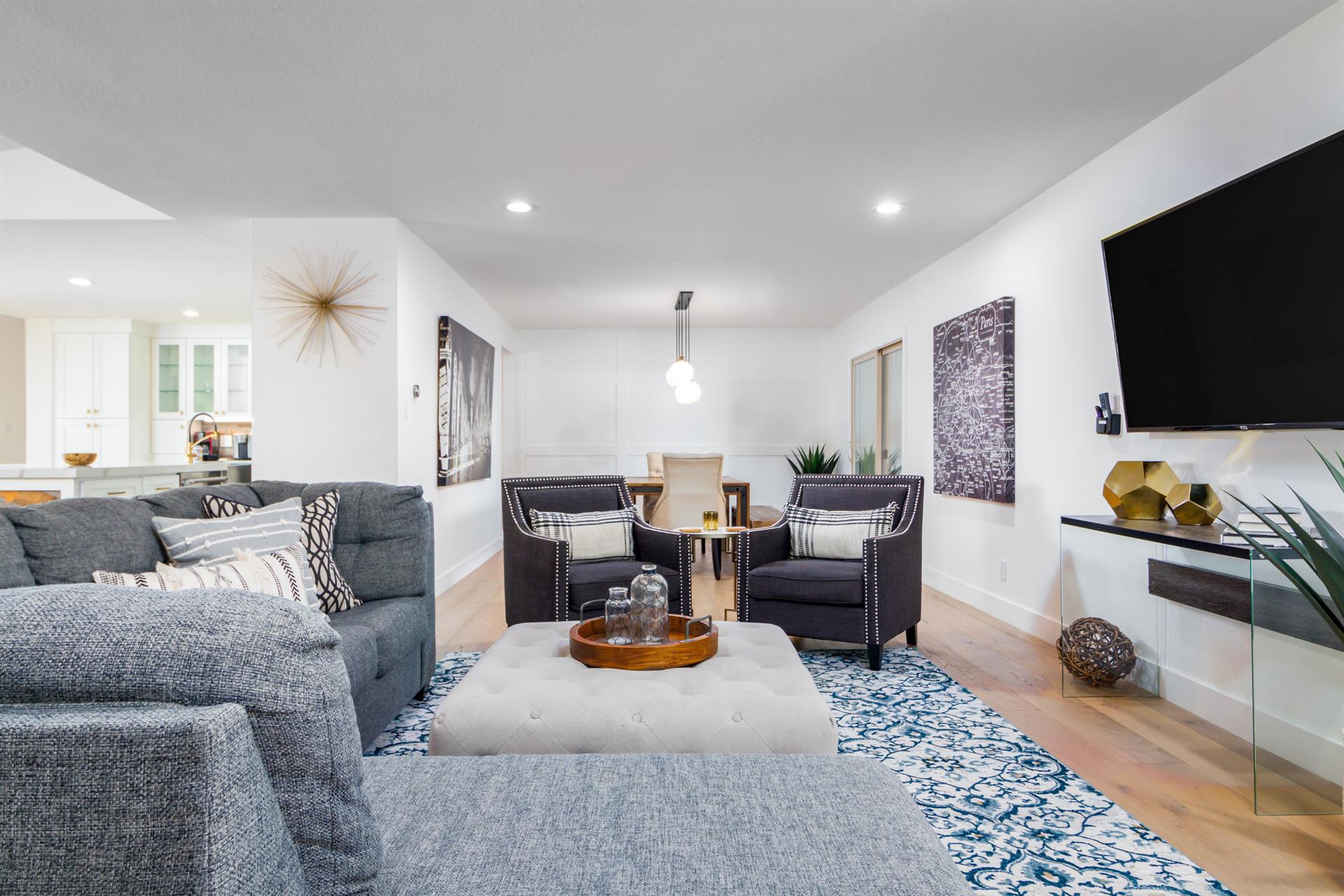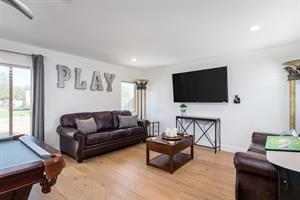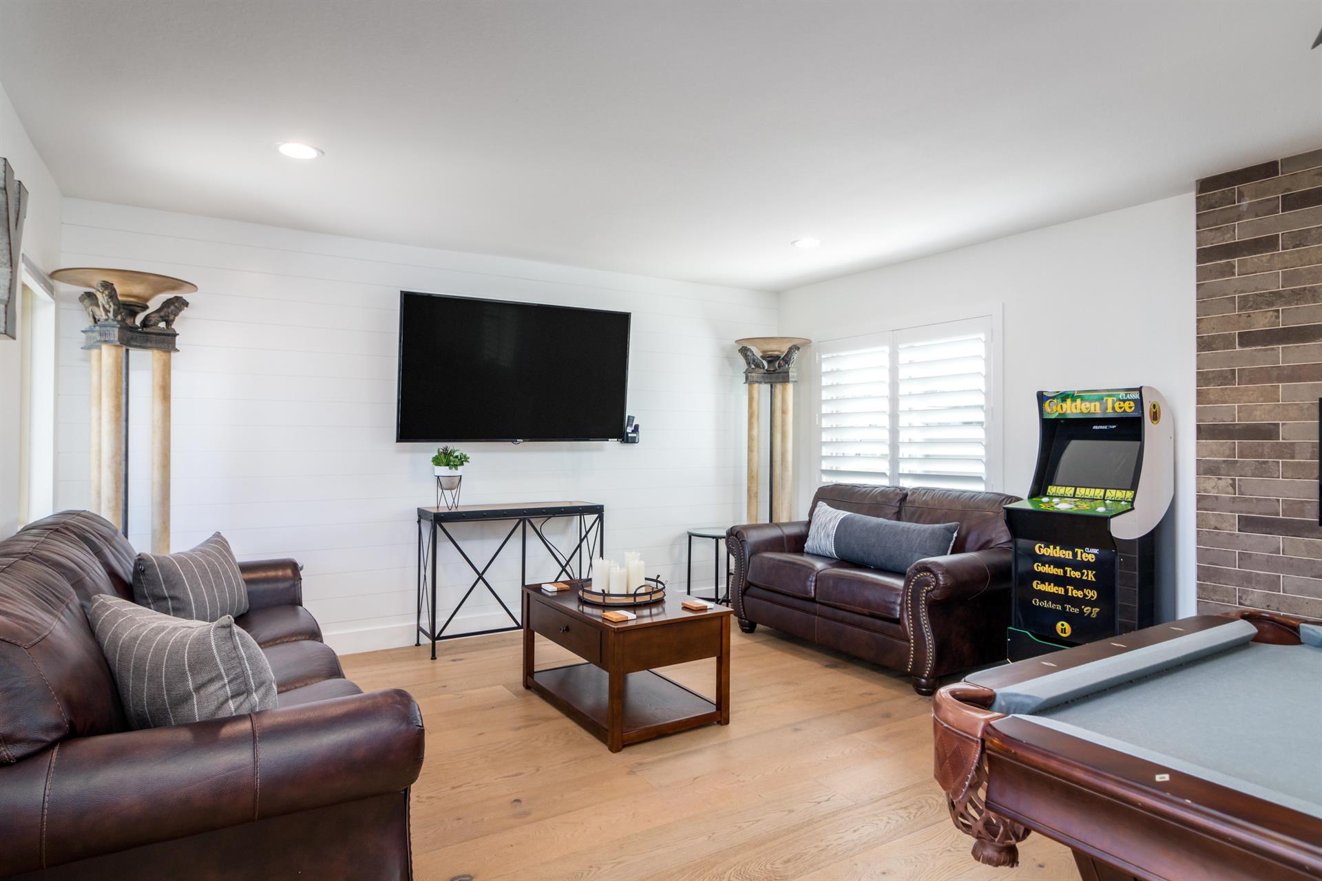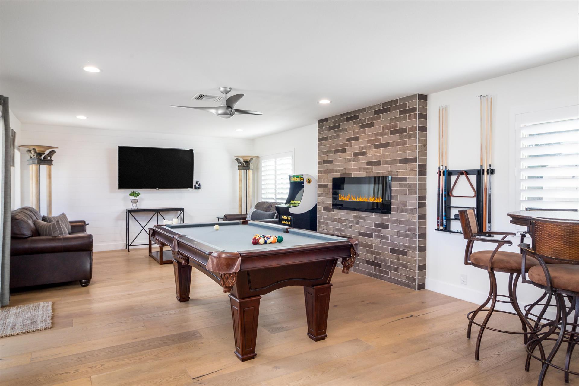 spaces throughout the living room, game room, and modern nooks. Hardwood