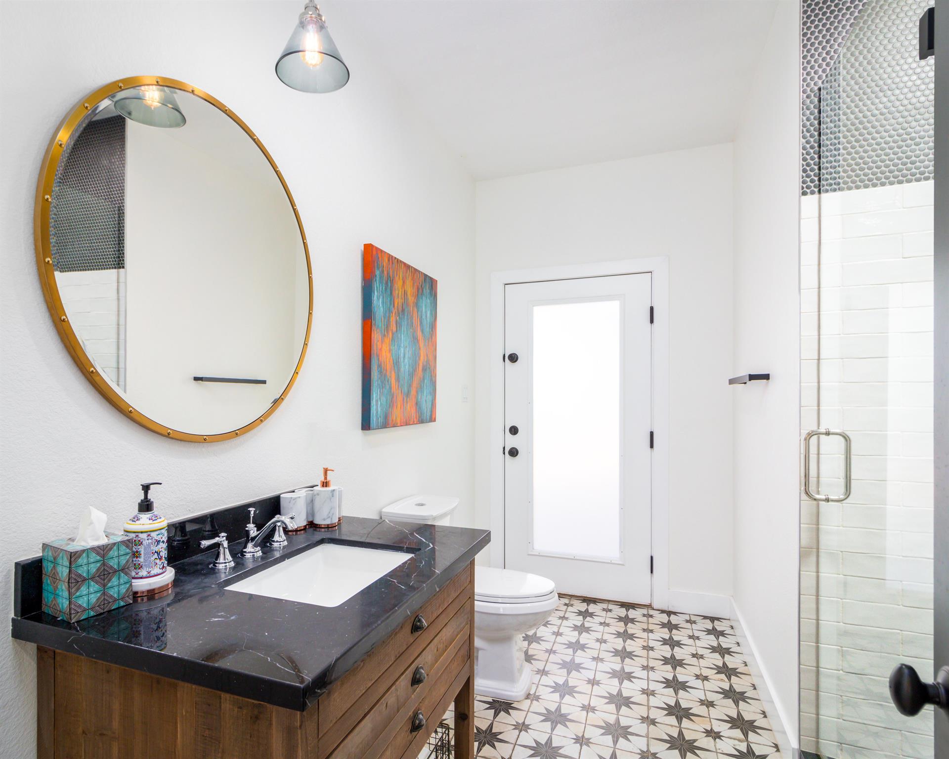 immediately notice the modern grey and white tiles leading to your Jack and
