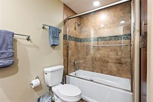 Ensuite tile shower with separate door to hallway from bathroom. 50” Roku