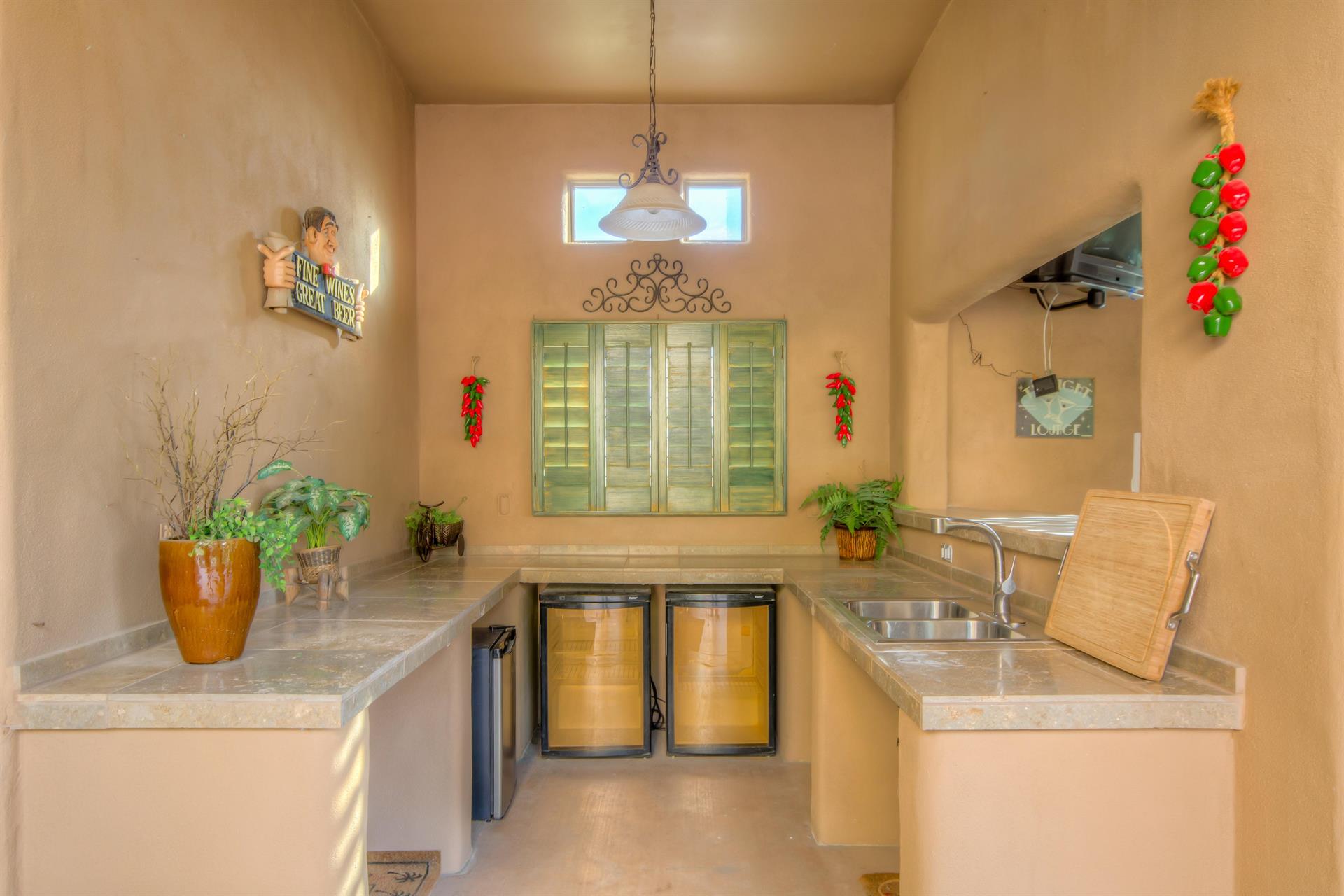 · Outdoor kitchen with sink, refrigerator, & ample counter space