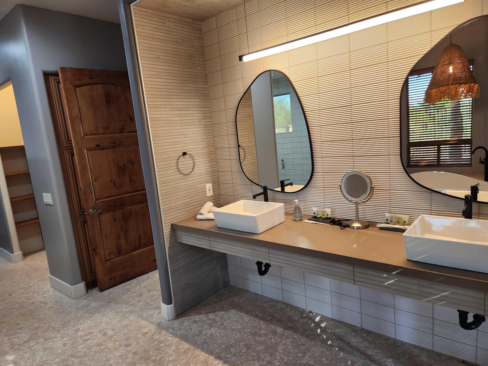 · Jack and Jill sinks atop neutral tile counters