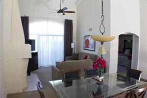 The Seville Villa's open floor plan highlights wood beams, vaulted ceilings, and plenty of sunlight in the great room as well as the outdoor enjoyment of a private patio. With 1100 sq. ft. of living space on one level, this villa sleeps six people with a king bed, two twin beds, and a queen sleeper sofa. Whether you're preparing a meal for family and friends or a romantic dinner for two, the fully equipped kitchen includes everything you need. This villa also features a washer/dryer and wood-burning fireplace, while the master bath includes a whirlpool tub with a separate shower.