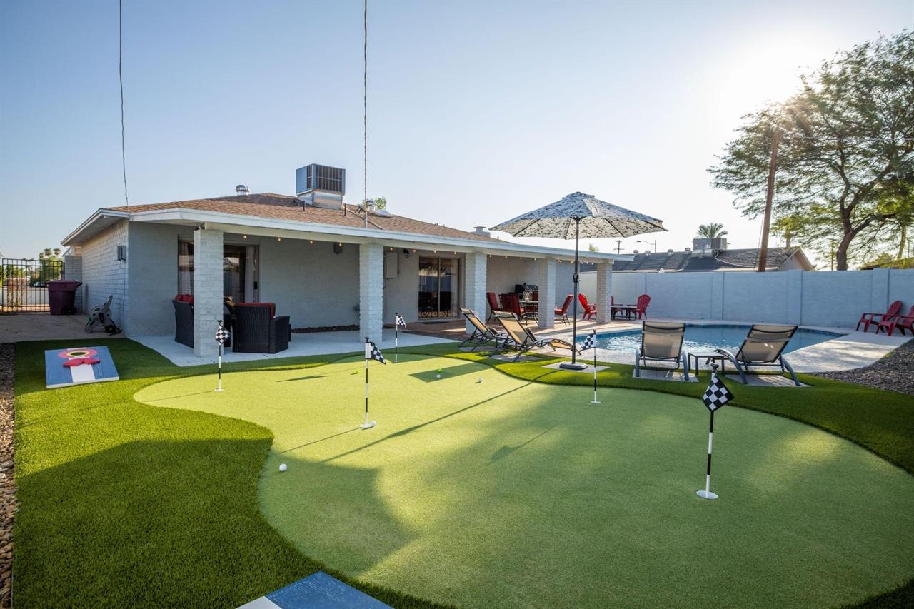 sparkling private pool, BBQ grill, putting green and outdoor dining.