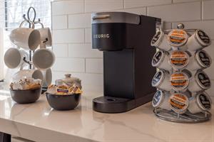 Keurig coffee maker, w/ K-Cups supplied, tea kettle, cooking basics