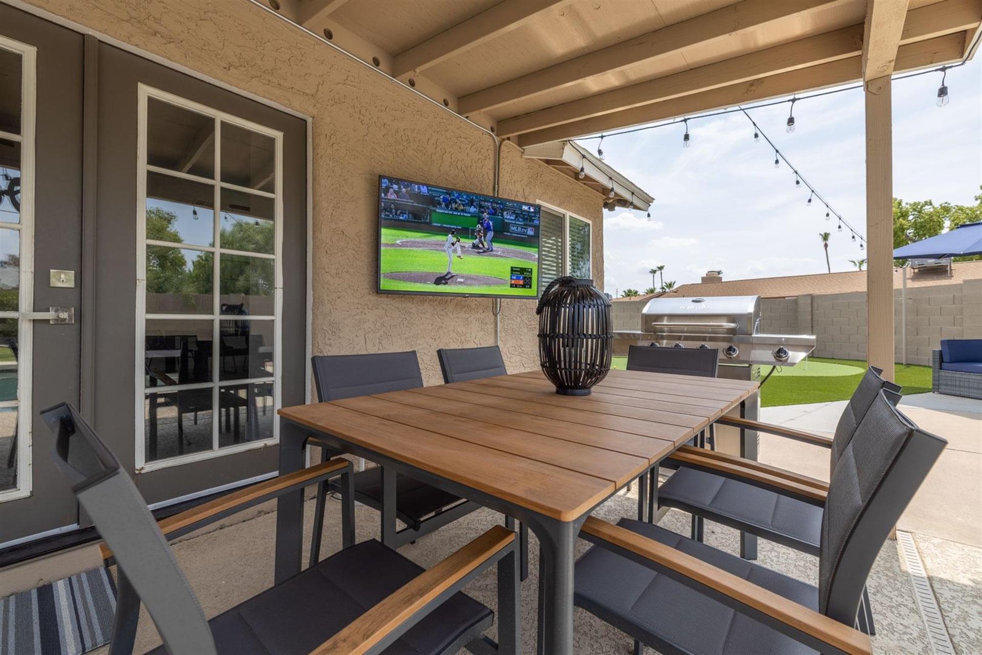with dining table & TV, outdoor seating area, pool lounge chairs, string