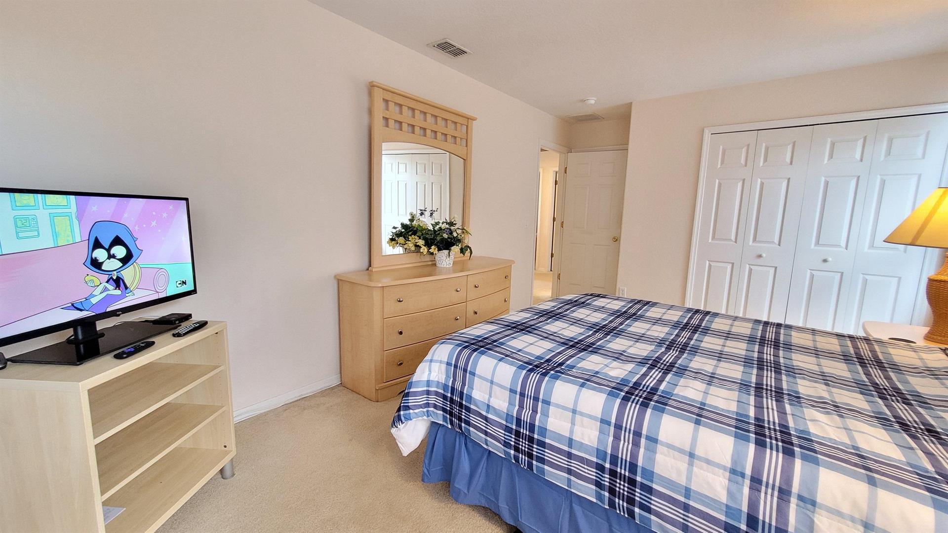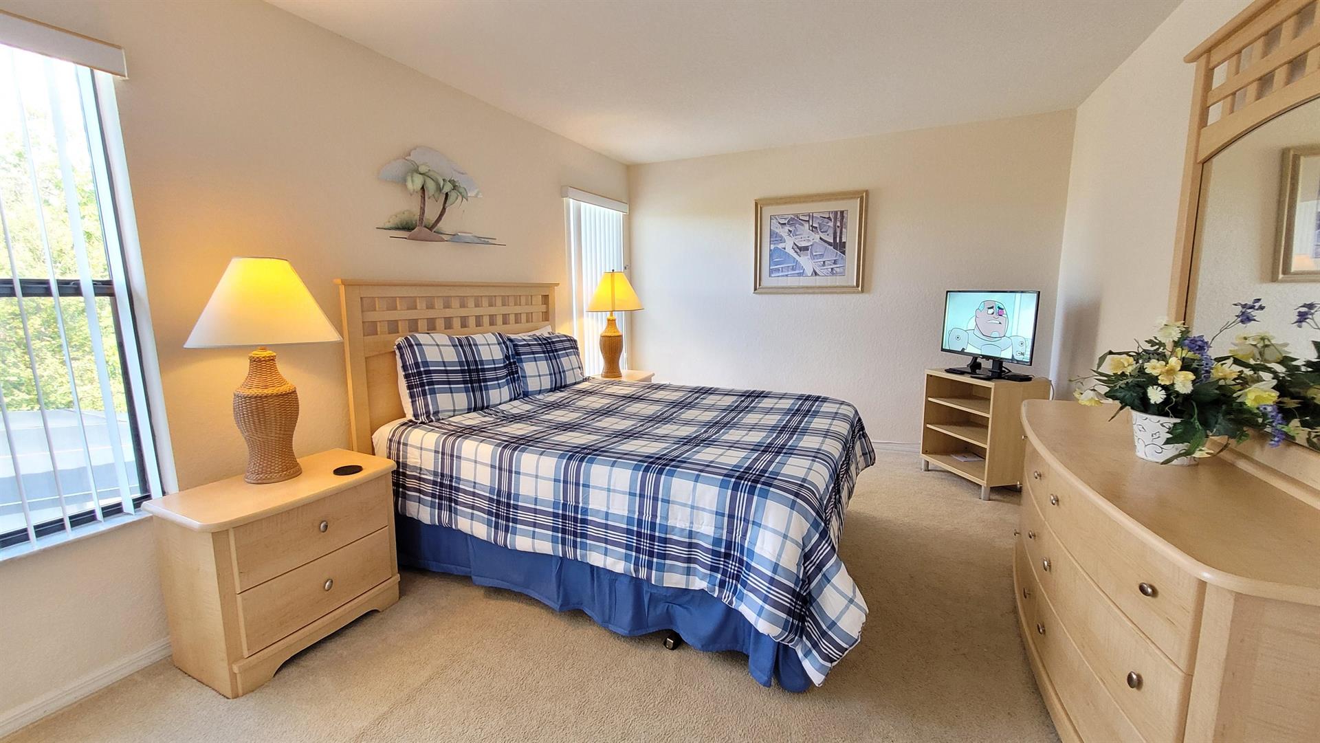 has king sized bed, ensuite bathroom and TV. The second bedroom has a new