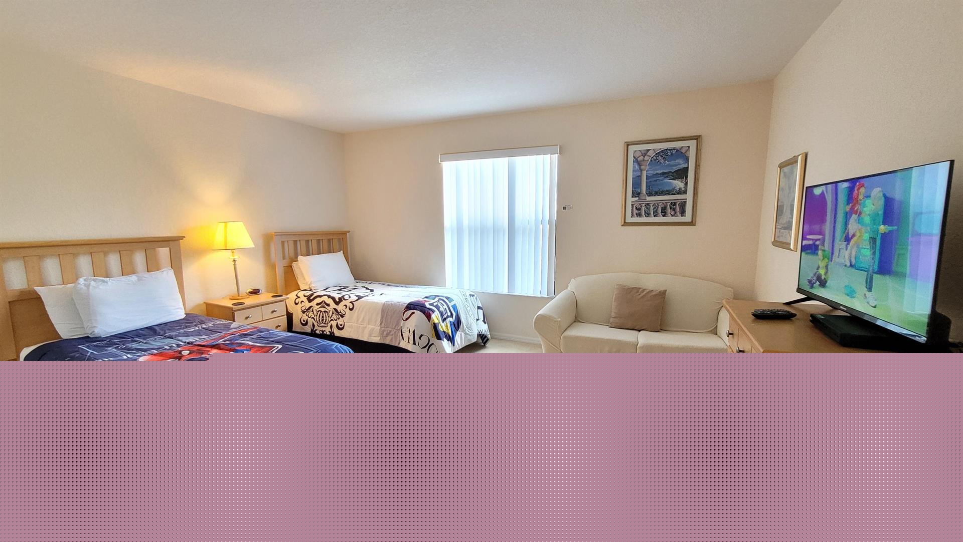 queen sized bed with TV. The further two bedrooms have two twin beds in each