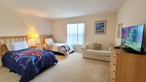 large, open plan living room with sofas TV, and DVD player. The master bedroom
