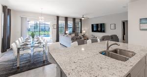 movie room, fully equipped kitchen with open living/dining area, private pool