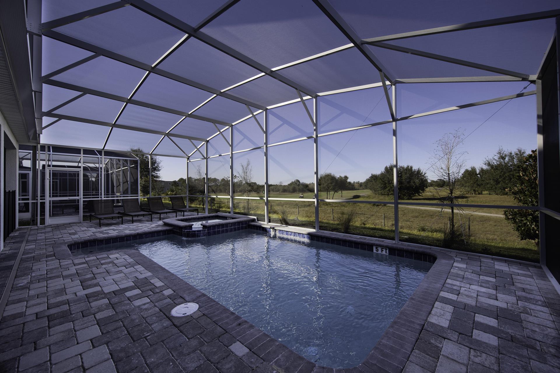 The private, screened pool is equipped with lounge chairs, patio seating, spa