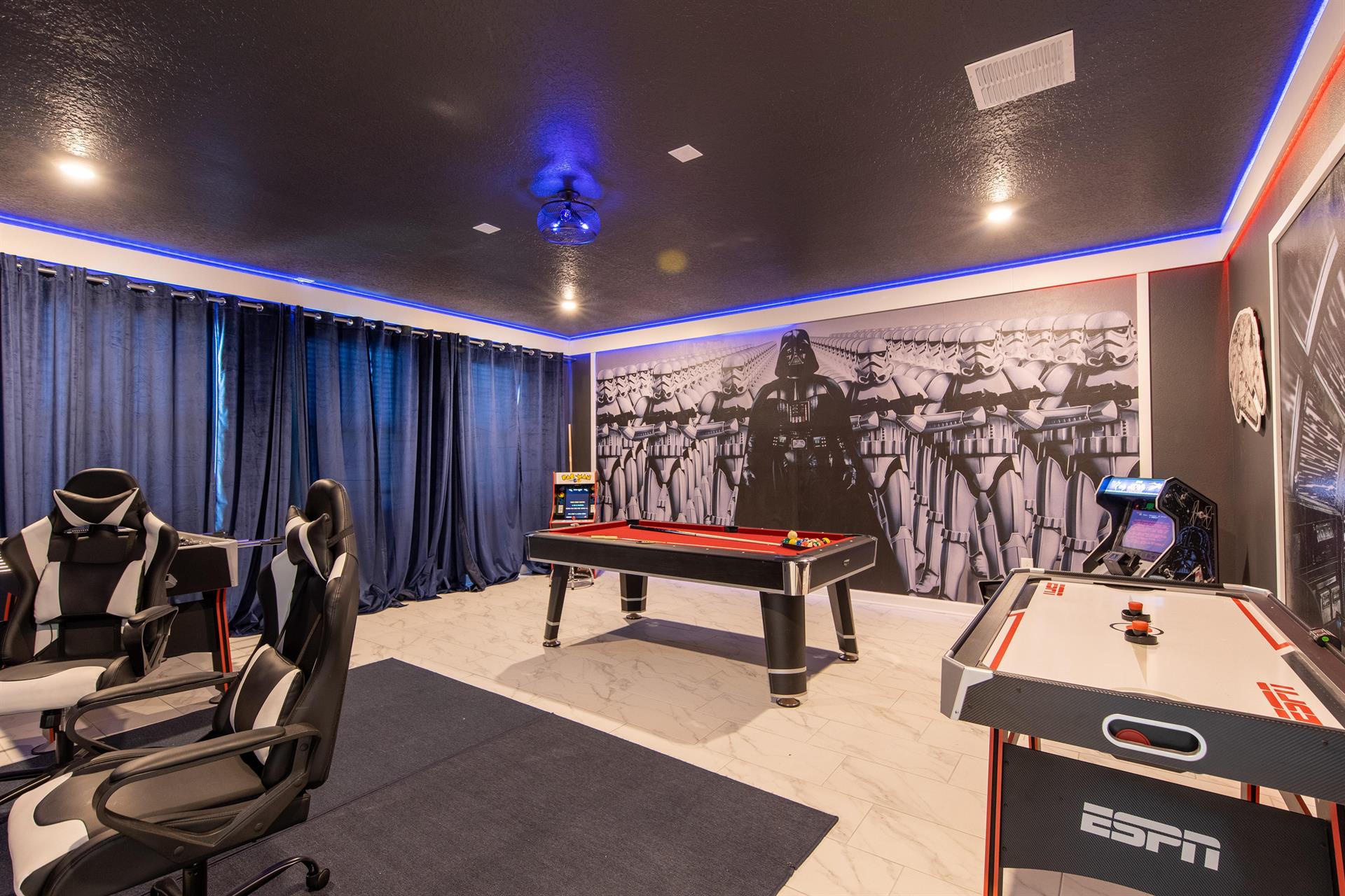 This 6 bedroom resort home includes a private pool, theater room, deluxe game