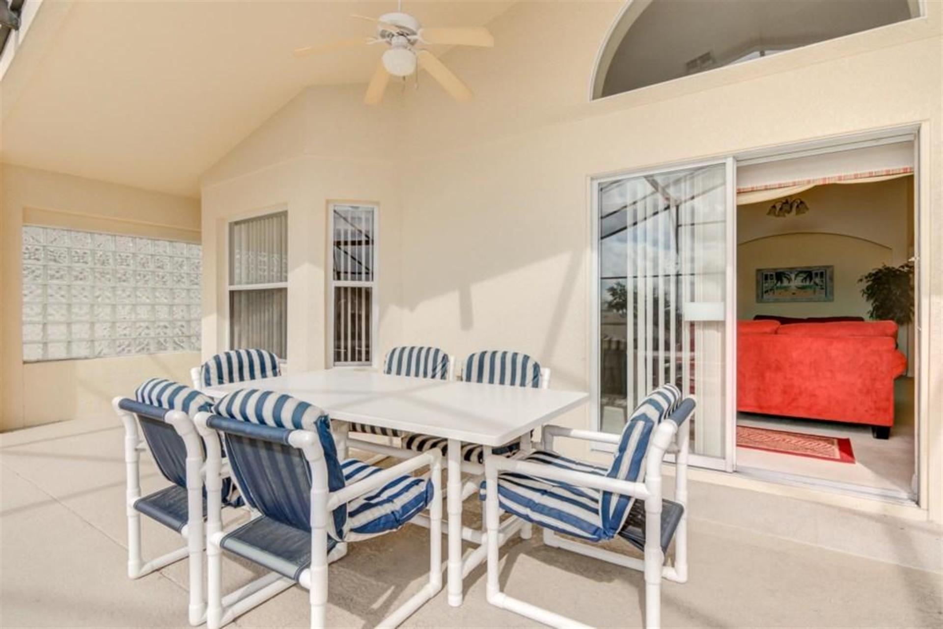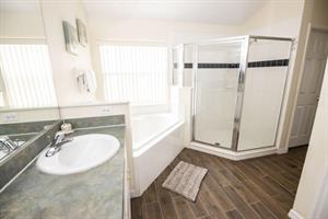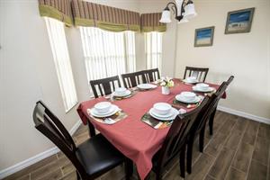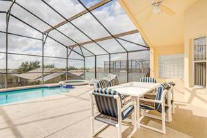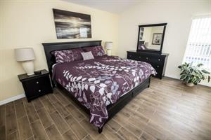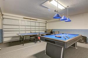 The living room, with its plush red sofas and large flat screen TV, is the ideal place to rest up and watch a movie after a long day at the parks. You’ll be pleased with the large, fully-equipped kitchen. It has ample countertop space, and it overlooks the living room. It’s the perfect place to prepare a meal and socialize with everyone at the same time. Just off the kitchen is the dining area, which has seating for up to 6 people. Incase you need to do some laundry during your stay, there’s a laundry room with a washer and dryer. Bedroom 1, the master bedroom, has a large king-size bed and en-suite bathroom. Bedroom 2 has a queen-size bed and en-suite bathroom. Have younger children? Bedrooms 3 and 4 both have two single beds. All bedrooms come their own TV, so there shouldn’t be any fighting over the living room TV remote. Want something fun to do while inside? Try out the games room. With a professional pool table and ping pong table, you’re bound to spend hours in there. Alternatively, if you want something to do outside, head to the screened-in patio and go for a dip in the pool and jacuzzi. If you want to work on your tan, there are sun loungers placed around the pool. If the sun gets to be a little too much, there’s a covered lanai for you sit under.
