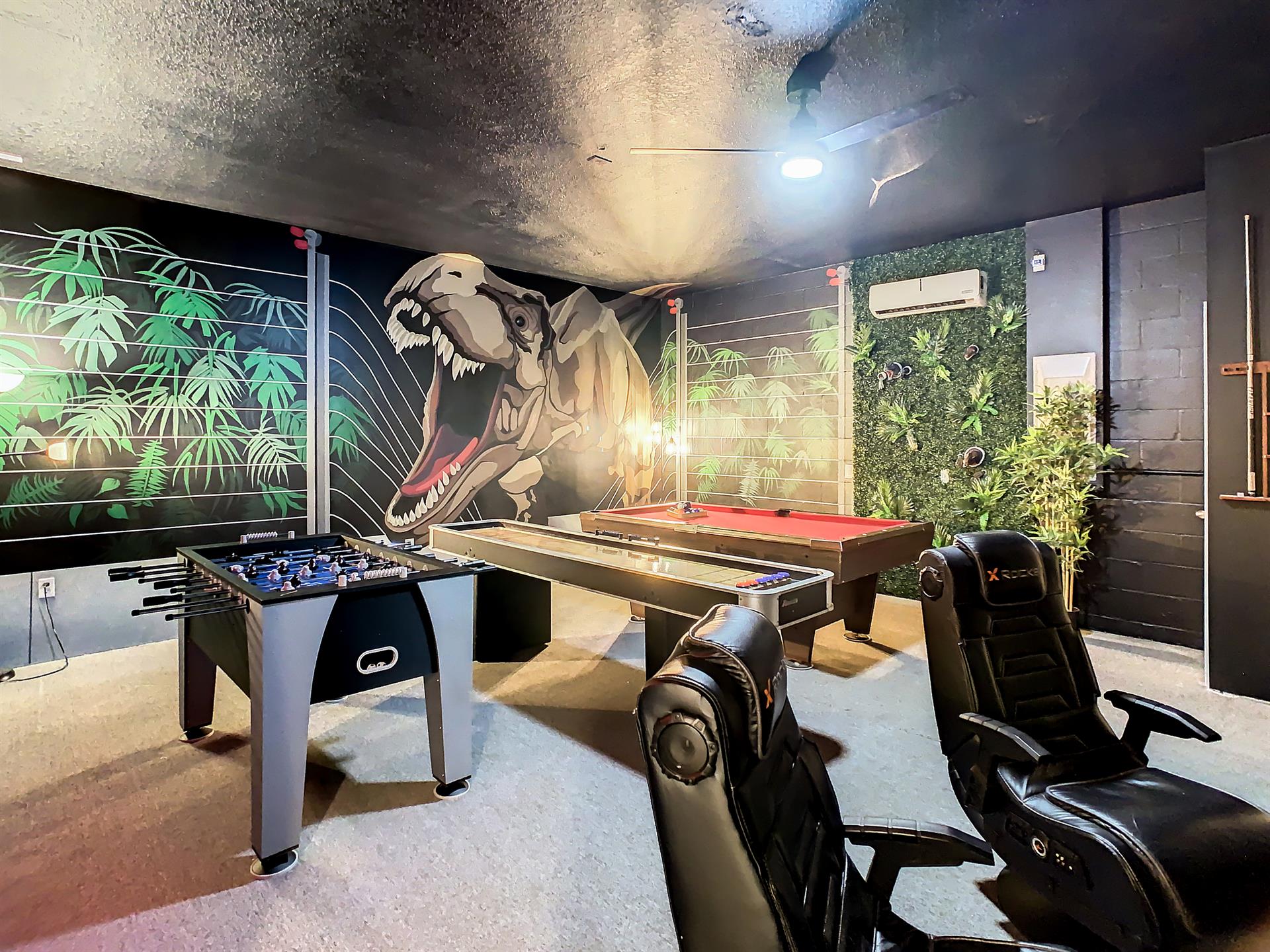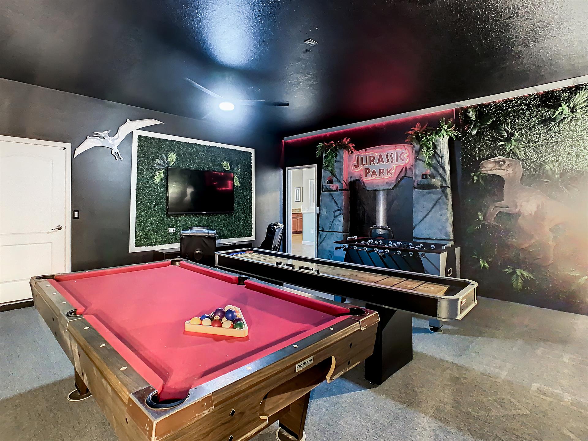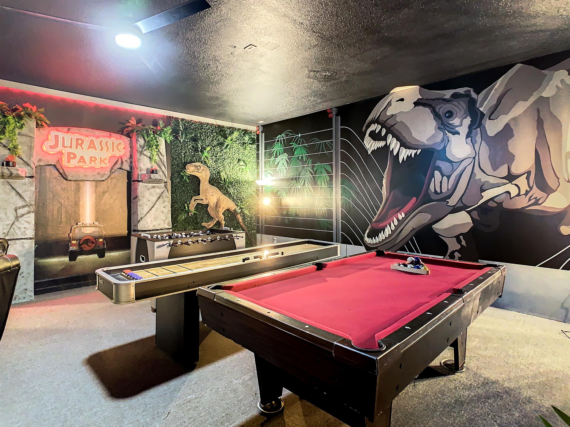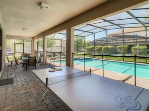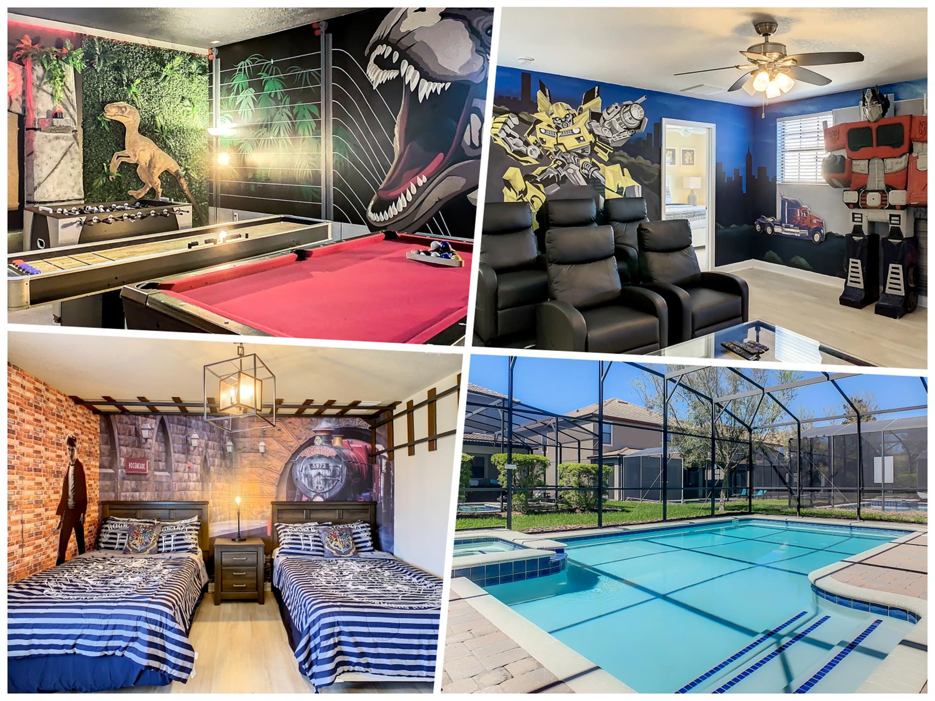 Located in the highly sought-after resort of Champions Gate is this themed 9-bedroom retreat. The living room, dining room, and kitchen all share the same area, making this place awesome for socializing. The living room has plenty of seating, modern furnishings, and a large flat screen TV mounted to the wall. Overlooking the living room area is the kitchen, which anyone would be thrilled to cook food in. It has plenty of workspace, granite countertops, stainless-steel appliances, and it comes with all the pots, pans, utensils, and small kitchen appliances that you would need to put together tasty home-cooked meals. When it’s time to eat, there’s seating for five at the breakfast bar, and there is also seating for eight around the large dining table. Want fun things to do while staying here? Look no further! For starters, head to the converted garage, and you’ll find a Jurassic-Park-themed games room, complete with pool table, shuffleboard, and a foosball table. Want somewhere to cool off in after a long day out in the Florida sun? Head to the private pool and spa at the back of the house! The whole pool area is screened in to keep those pesky Florida bugs out, and there is a large lanai, with outdoor seating. For those who want to work on their tan, there are some sunbeds dotted around the pool area. There’s even an outdoor table tennis table! How about a movie night in the Transformers-themed movie room/area upstairs. Here, you’ll find five comfortable reclining theater seats and a large flat screen TV for watching all your favorite Disney movies on.