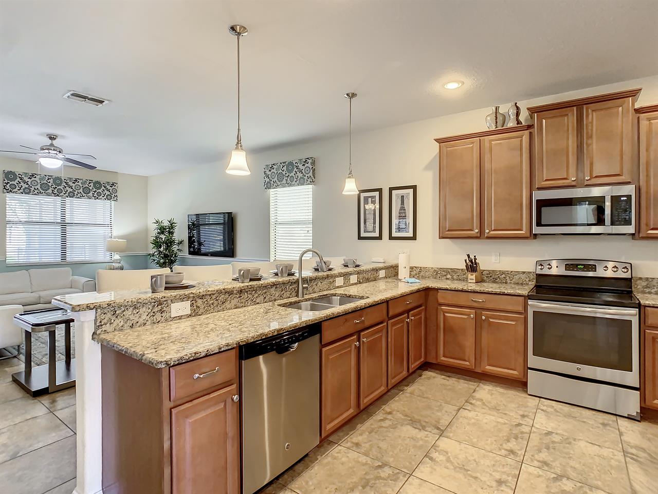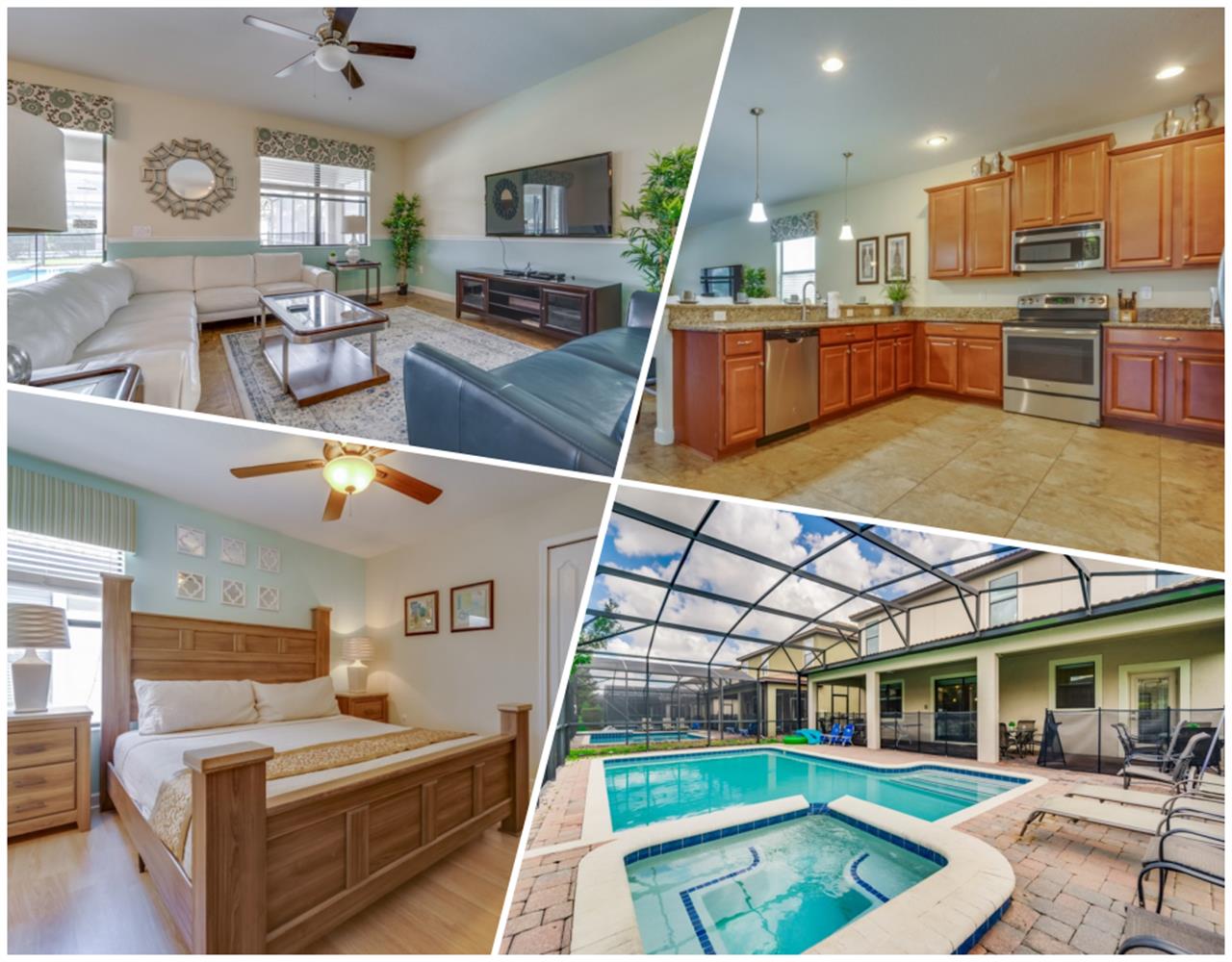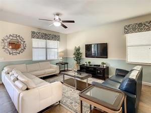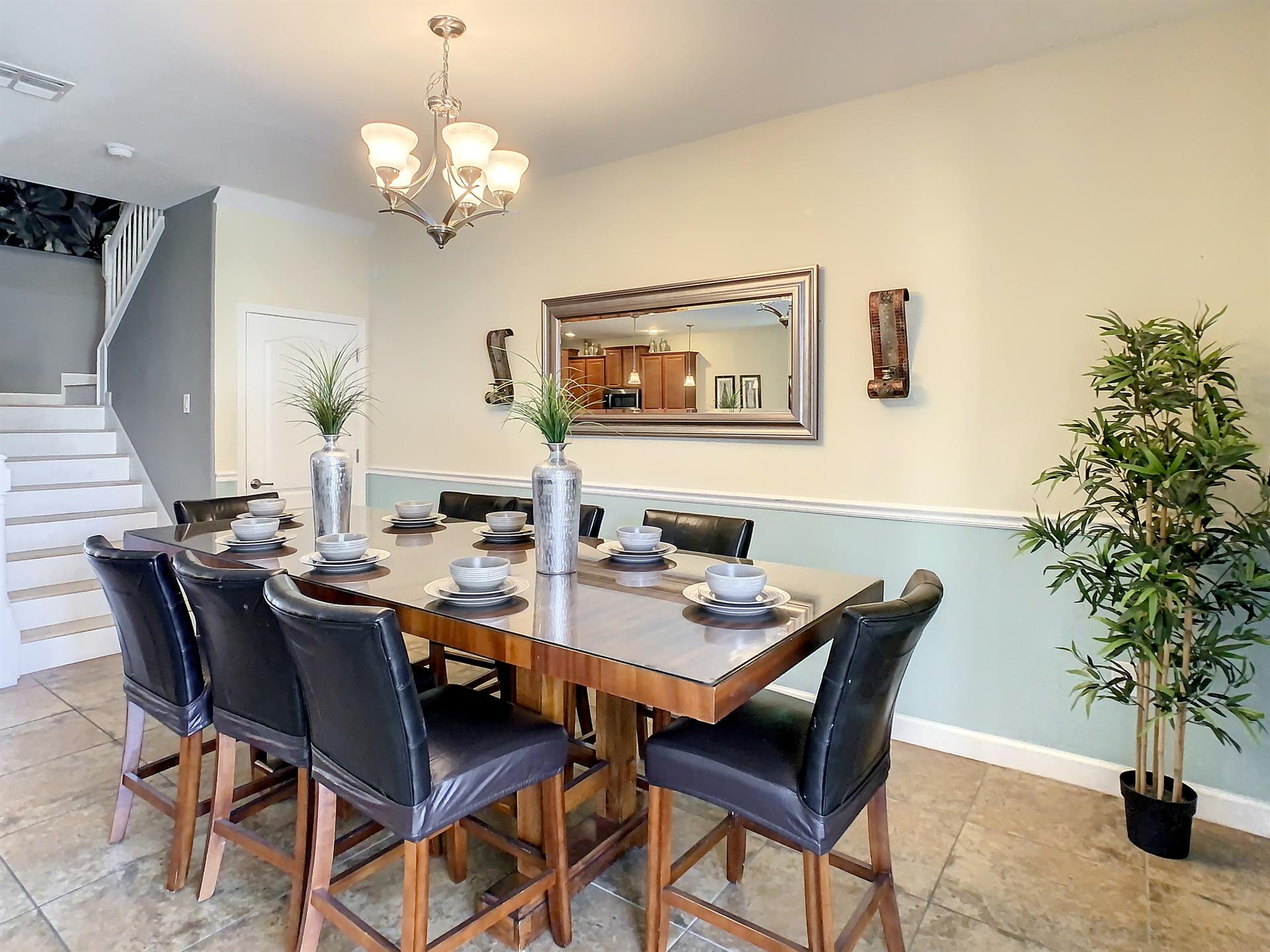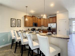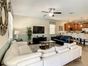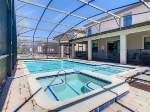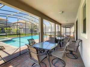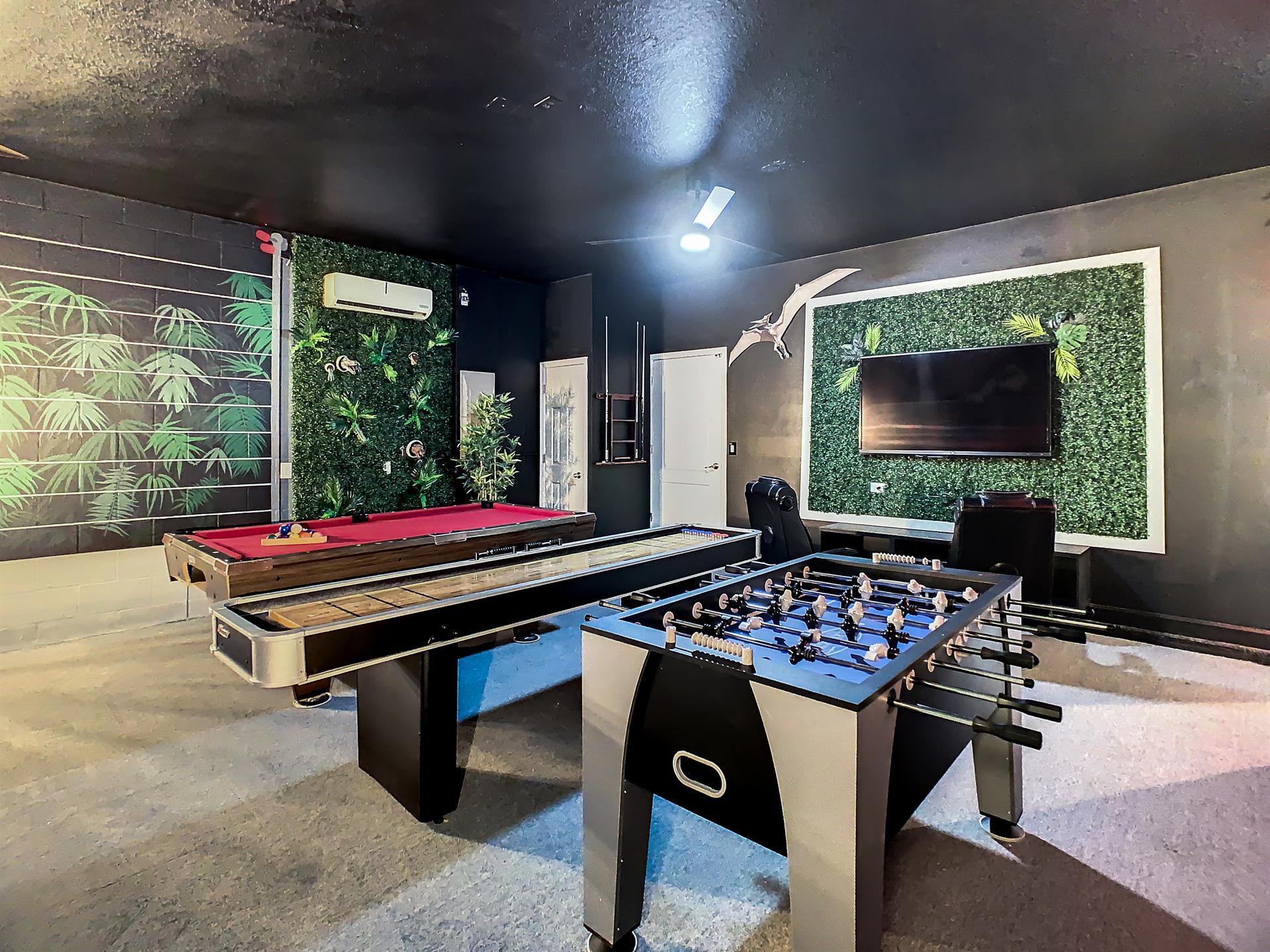 Located in the highly sought-after resort of Champions Gate is this themed 9-bedroom retreat. The living room, dining room, and kitchen all share the same area, making this place awesome for socializing. The living room has plenty of seating, modern furnishings, and a large flat screen TV mounted to the wall. Overlooking the living room area is the kitchen, which anyone would be thrilled to cook food in. It has plenty of workspace, granite countertops, stainless-steel appliances, and it comes with all the pots, pans, utensils, and small kitchen appliances that you would need to put together tasty home-cooked meals. When it’s time to eat, there’s seating for five at the breakfast bar, and there is also seating for eight around the large dining table. Want fun things to do while staying here? Look no further! For starters, head to the converted garage, and you’ll find a Jurassic-Park-themed games room, complete with pool table, shuffleboard, and a foosball table. Want somewhere to cool off in after a long day out in the Florida sun? Head to the private pool and spa at the back of the house! The whole pool area is screened in to keep those pesky Florida bugs out, and there is a large lanai, with outdoor seating. For those who want to work on their tan, there are some sunbeds dotted around the pool area. There’s even an outdoor table tennis table! How about a movie night in the Transformers-themed movie room/area upstairs. Here, you’ll find five comfortable reclining theater seats and a large flat screen TV for watching all your favorite Disney movies on.