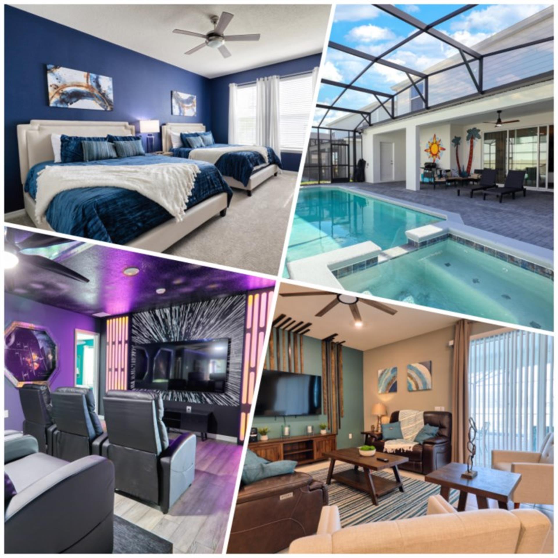 Located in the highly sought-after resort community of Windsor Island is this 10-bedroom, 8-bathroom luxury, warm, and inviting holiday home. The living room, dining area, and kitchen all share the same space, making it perfect for entertaining. The living room has a large, comfortable L-shaped sofa, modern art, and a large flat screen TV mounted to the wall, which is perfect for watching all your favorite Disney movies on the night before heading out to the parks. If you enjoy cooking, you certainly won’t be disappointed with this kitchen. It has granite countertops, plenty of workspace, and stainless-steel appliances. It also comes fully equipped with all the pots, pans, utensils, and small kitchen appliances that you would need to put together tasty home cooked meals. And when it’s time to eat, you can do so at either the breakfast bar/kitchen island, which seats four, or around the large, stylish dining table, which seats up to ten people. If you’re looking for fun things to do in this house, you have options. Firstly, why not head to the games room in the converted garage. Here, you’ll find a foosball table, table tennis table, and a standup Indiana Jones arcade machine. Secondly, head upstairs, and you’ll find a pool table. Thirdly, in the same space as the pool table is an awesome six-seater theater room themed to Star Wars. There is simply no better place to sit back, relax, and watch your favorite Star Wars movies on before heading out to Disney’s Galaxy’s Edge. Finally, if you want to cool off after a long day out at the parks, then head to the large and refreshing swimming pool at the back. The pool area is screened in to keep those pesky Florida bugs out. There is also a spa to relax in. For those who want to work on their tan, there are some sunbeds. And for those who want to enjoy the Florida weather, but in the shade, there is a large lanai with an outdoor lounge area and dining area, complete with outdoor TV. There are ten bedrooms. The first bedroom has two queen beds. The second bedroom has a king bed. The third bedroom has a king bed. The fourth bedroom has a king bed. The fifth bedroom has a king bed and is tastefully themed to Disney’s Mickey and Minnie Mouse. The sixth bedroom is themed to LEGO and Star Wars and has two twin/single beds. The seventh bedroom is themed to Harry Potter and has two single/twin beds. The eighth bedroom has two single/twin beds and is themed to Monsters Inc. The ninth bedroom is themed to Disney’s Cinderella and has a single-over-single bunkbed. The closet in this room is also a small TV room. And the tenth bedroom has two twin/single beds and is safari themed. This home also has in-unit laundry facilities and free Wi-Fi Internet access.