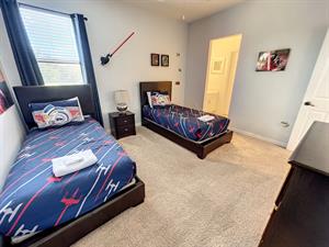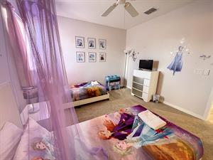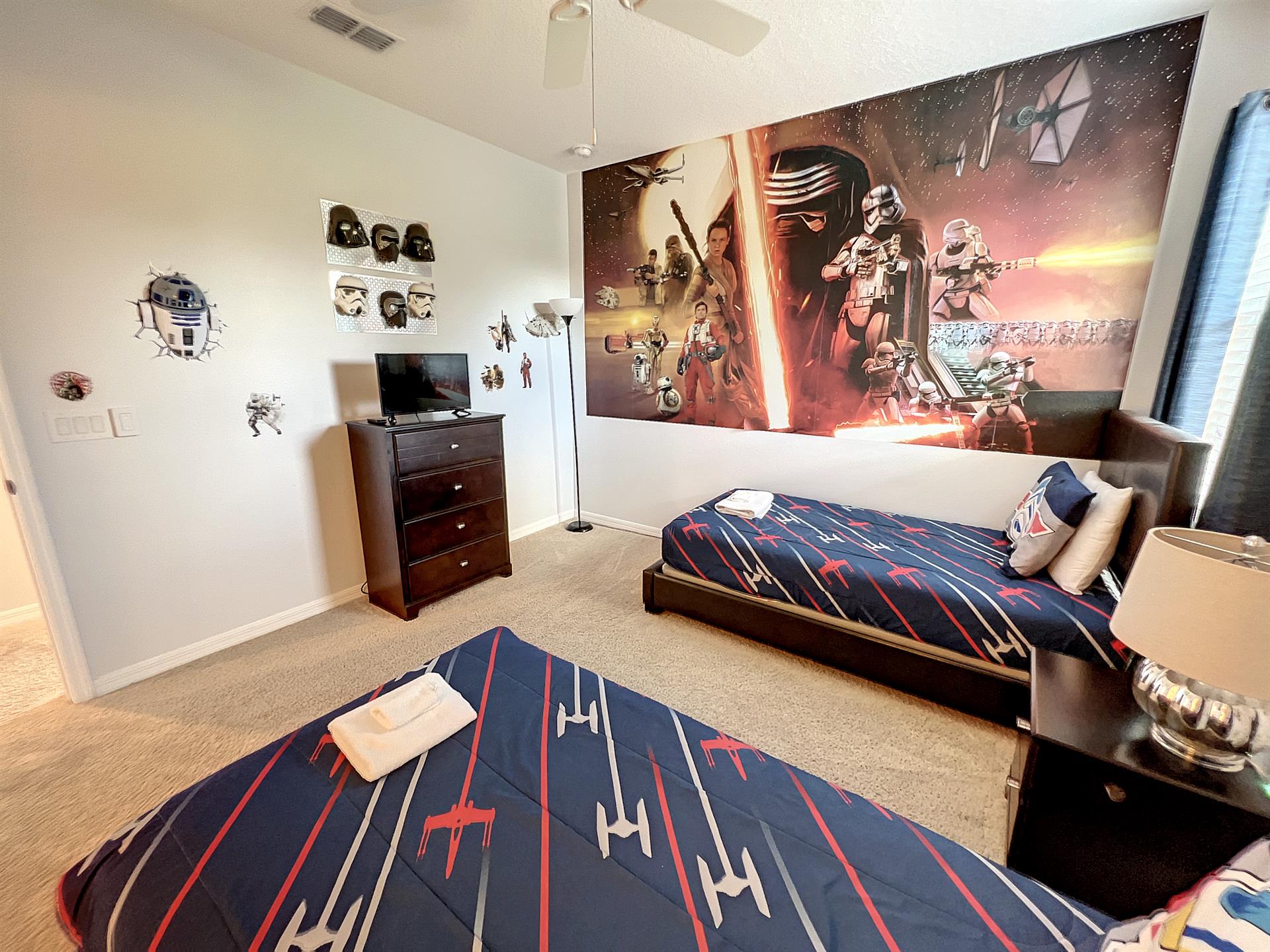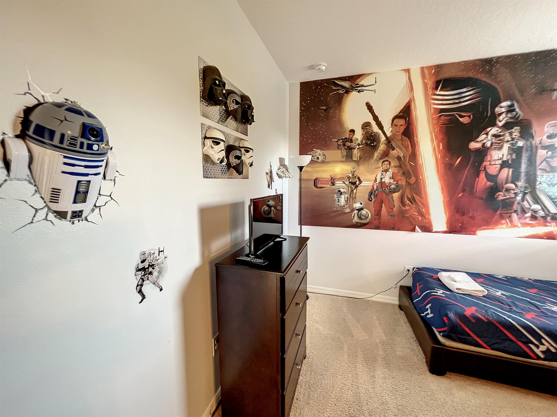 On the lower level you will find a bedroom with a Queen sized bed and connection to the lower level bathroom. On the second level of the home lies the two master en suite bedrooms both with King sized beds. The final upstairs bathroom is nestled between the two themed kid's rooms. The glow of a light saber fills this Star Wars themed room while on the wall lies the masks of the Darth Side. The other room transports princesses to an imaginary palace in the sky. Beaming with color and full of fun.