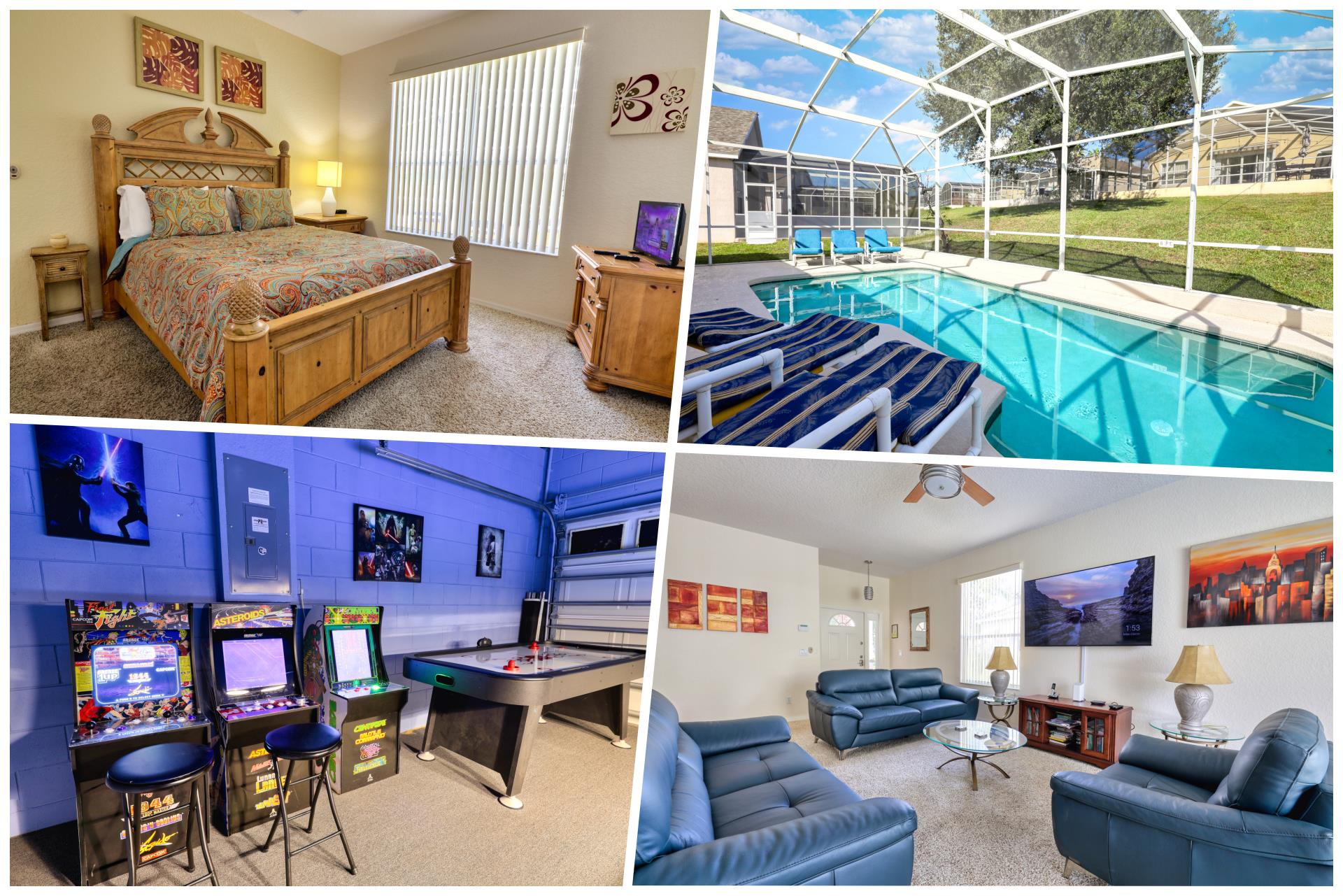 Head through the glass patio doors in the living room, and you’ll step foot into the screened-in pool area. Here, you’ll find a large pool to cool off in, sun beds for working on your tan, and a lanai with patio furniture underneath for those who want to enjoy the Florida weather, but out of the direct sunlight. If you want some indoor entertainment, head the Star-Wars-themed games room in the converted garage. Here, you’ll find a pool table, arcade games machines, and a shuffleboard table.