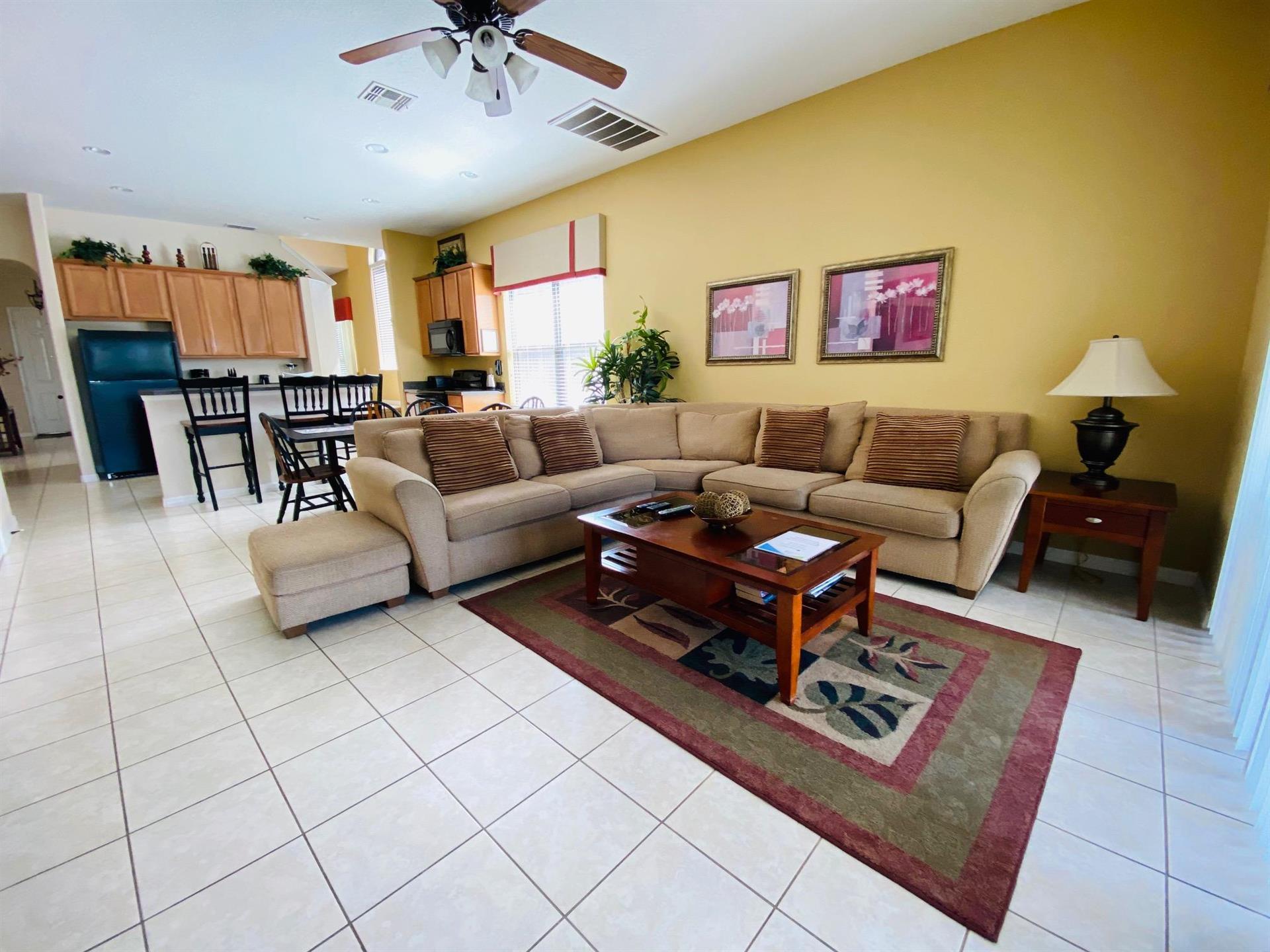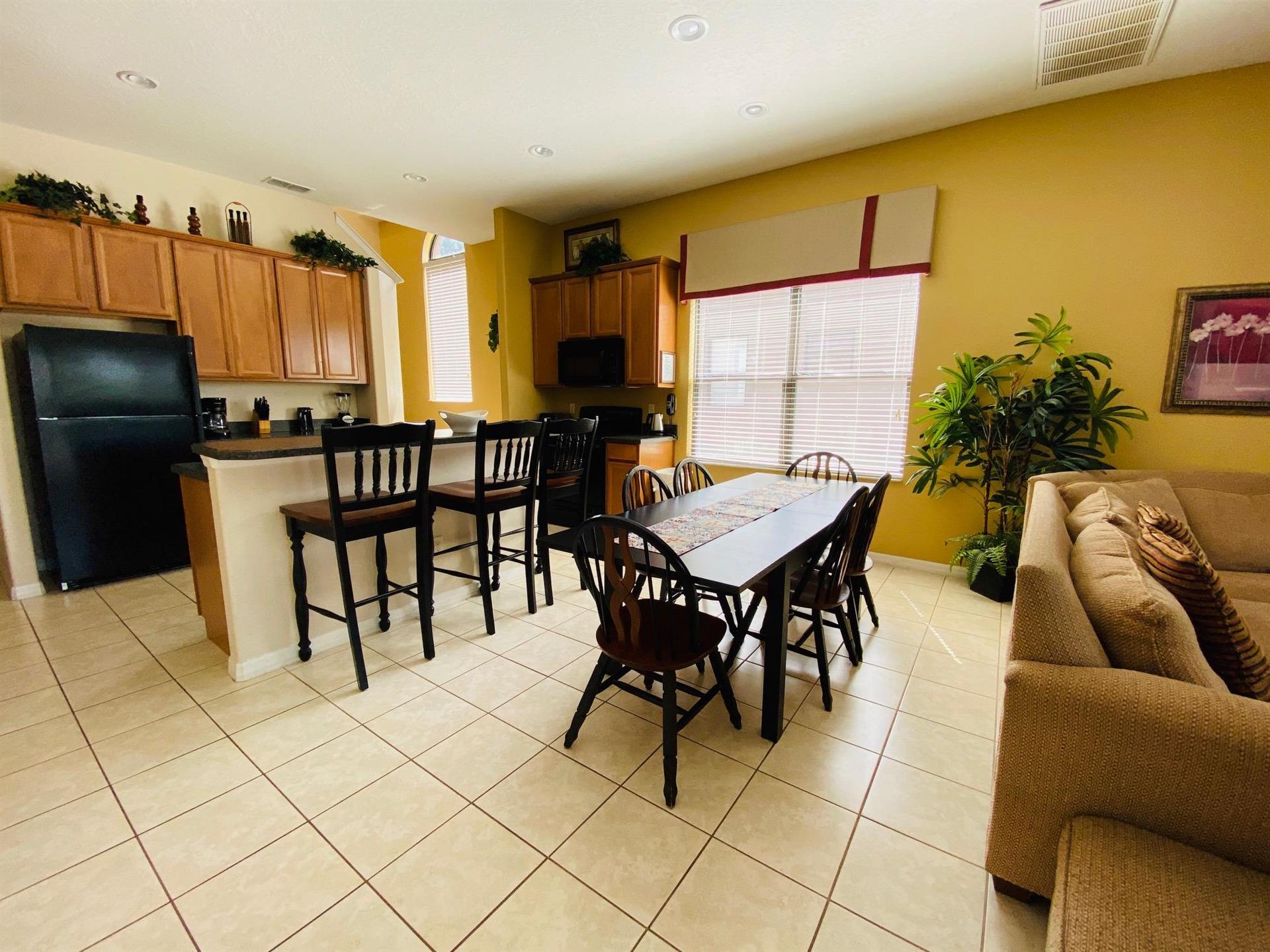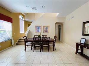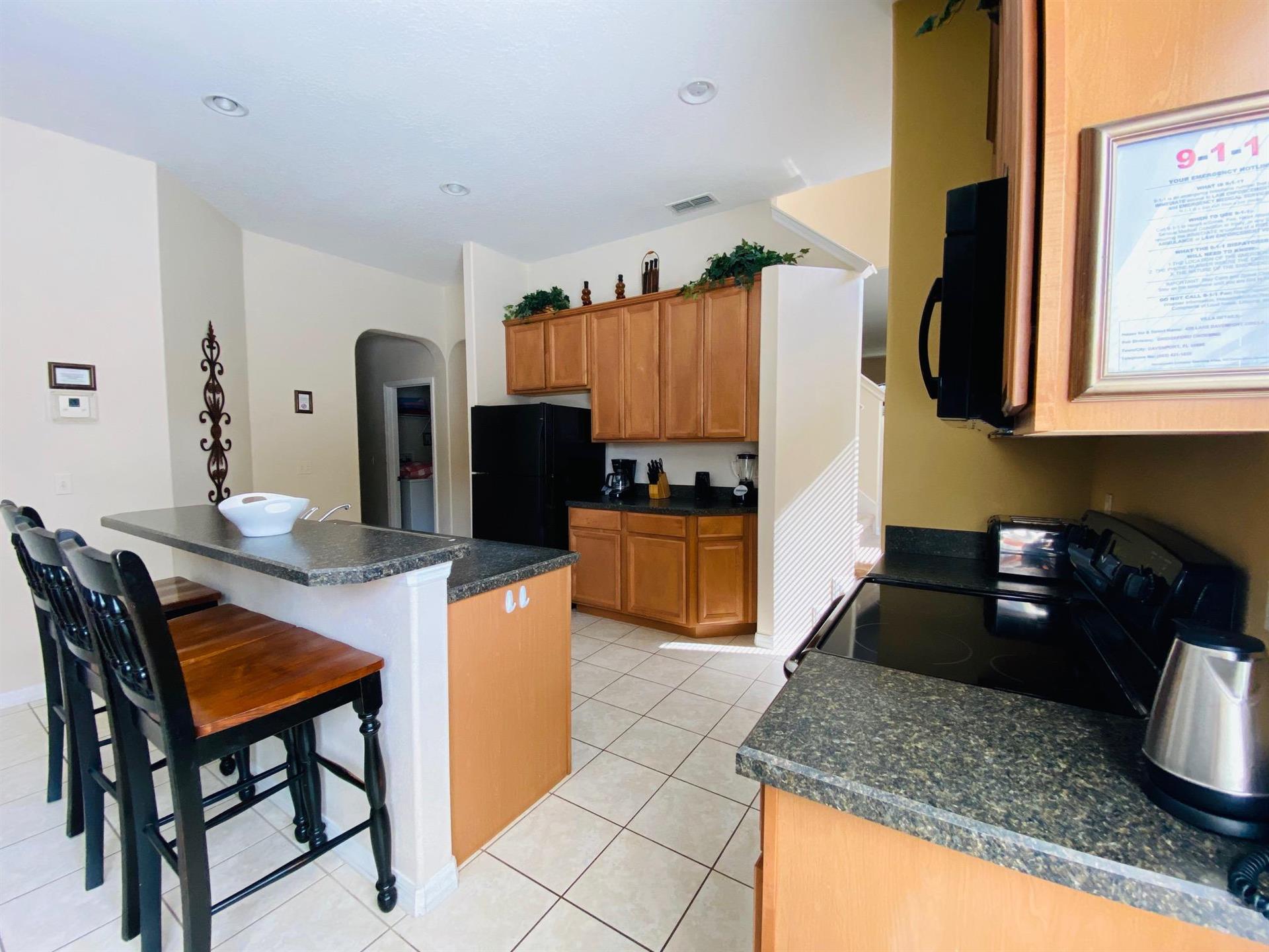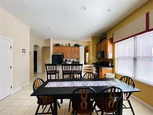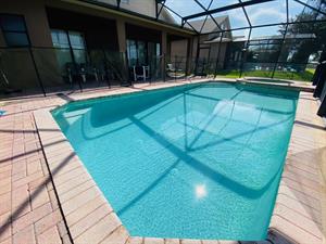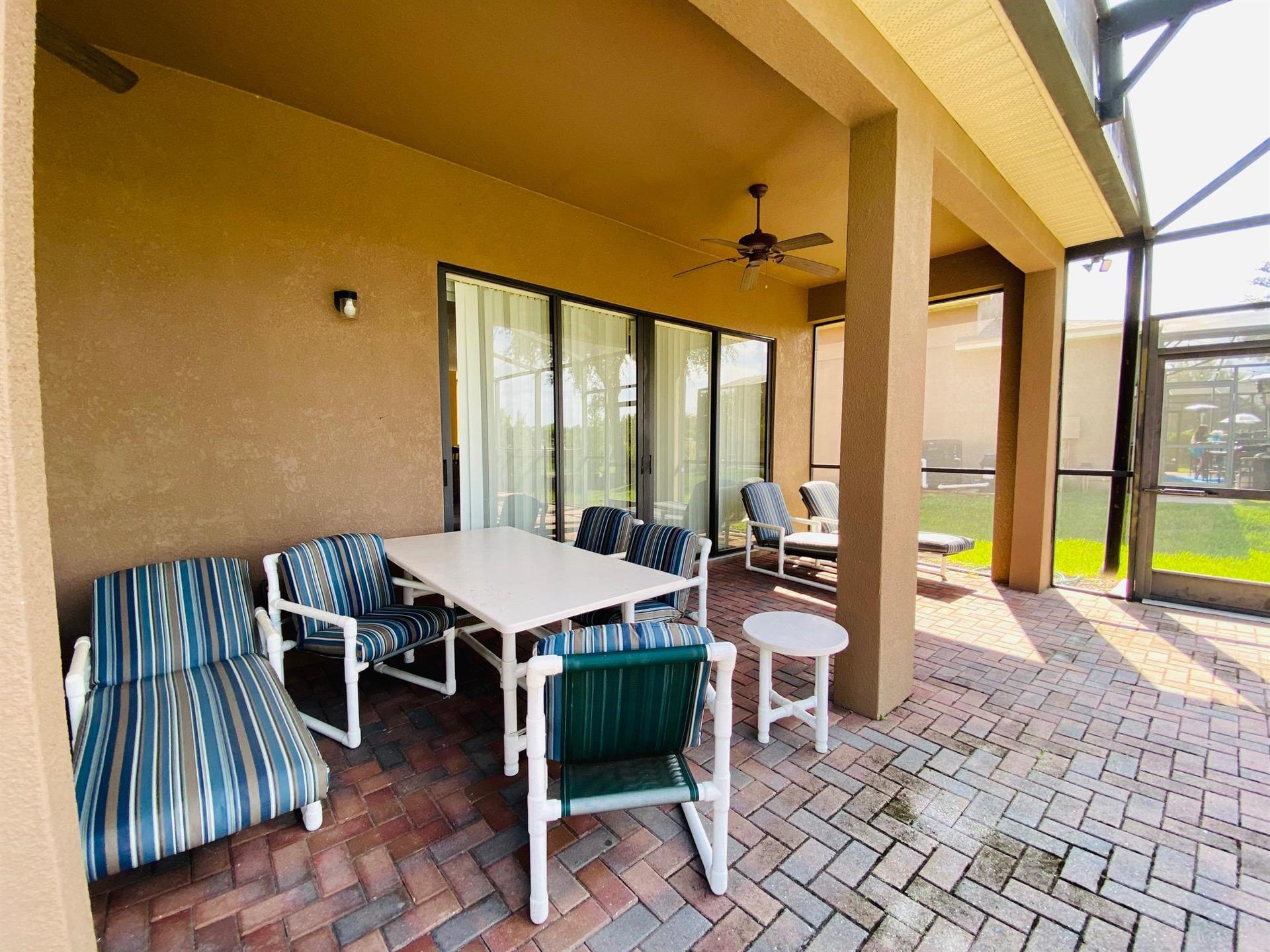 Looking for a 5-bedroom, 4.5-bathroom vacation villa with private pool that sleeps up to 10 people? Keep on reading. This place is great for two families traveling together or one large family because of the bedrooms. The first bedroom, the master bedroom, has a king-size bed and en-suite bathroom. The second bedroom also has a king-size bed. The third bedroom has a queen-size bed. And the fourth and fifth bedrooms both have two single beds, which are great for the younger members of the family. The kitchen is a modest size and has black appliances, black countertops, it comes fully equipped, and it has a breakfast bar with seating for up to 3. If you need somewhere to eat that has more than 3 seats, just behind the breakfast bar is a dining area that has a black rectangular table and six chairs. There’s an additional dining area that also seats up to 6 people. The living room has two comfortable sofas and a large flat screen TV. There are hours upon hours of fun to be had here. If you’d rather have some fun outside, head to the pool. The pool area is screened in and has a large lagoon-shaped pool with spa. There are sun loungers for those who want to work on their tans, and there is a large patio table and six chairs under a covered lanai for those who want to relax in the shade.
