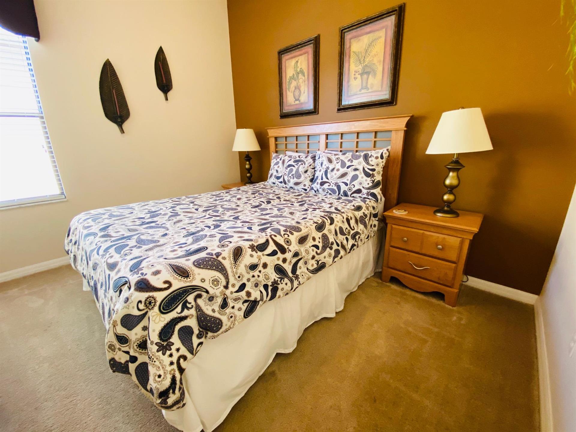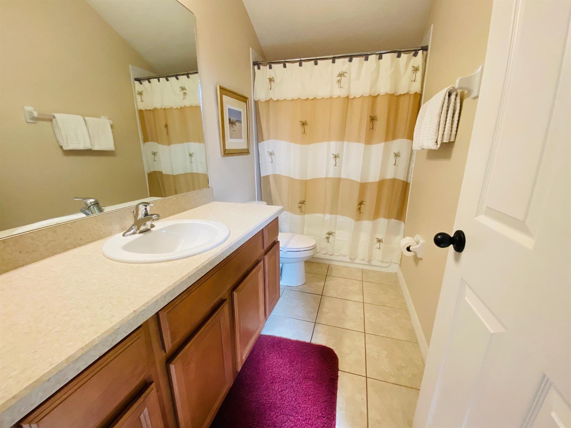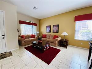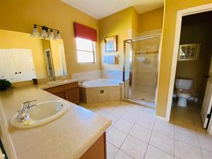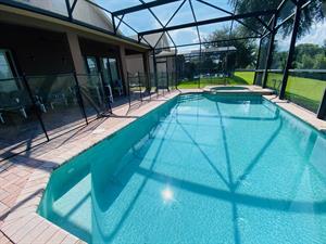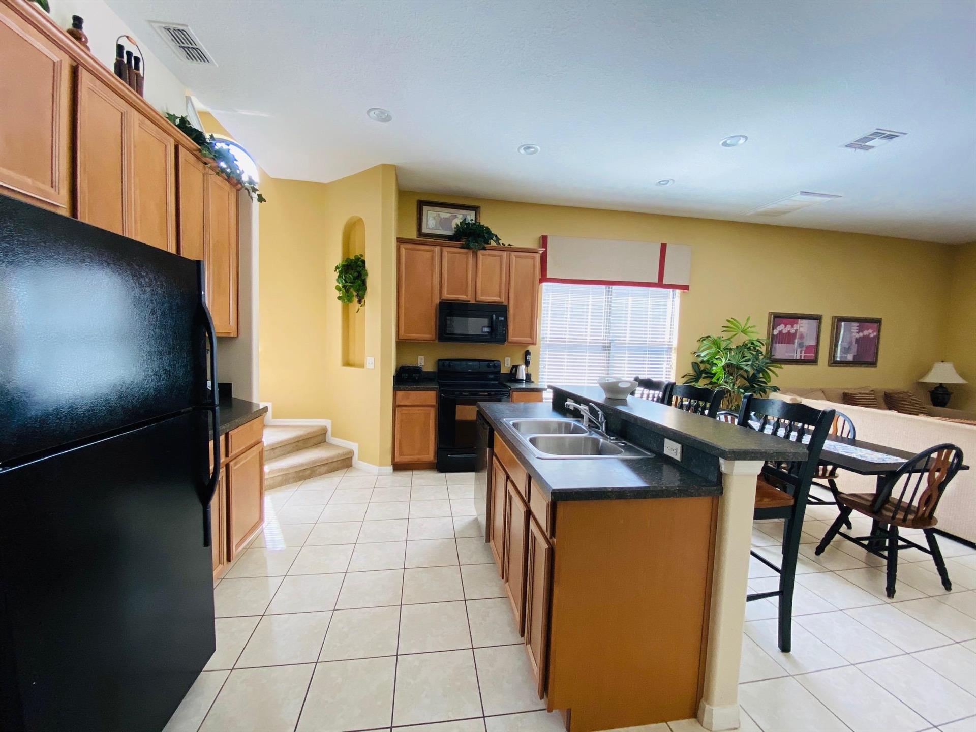 Looking for a 5-bedroom, 4.5-bathroom vacation villa with private pool that sleeps up to 10 people? Keep on reading. This place is great for two families traveling together or one large family because of the bedrooms. The first bedroom, the master bedroom, has a king-size bed and en-suite bathroom. The second bedroom also has a king-size bed. The third bedroom has a queen-size bed. And the fourth and fifth bedrooms both have two single beds, which are great for the younger members of the family. The kitchen is a modest size and has black appliances, black countertops, it comes fully equipped, and it has a breakfast bar with seating for up to 3. If you need somewhere to eat that has more than 3 seats, just behind the breakfast bar is a dining area that has a black rectangular table and six chairs. There’s an additional dining area that also seats up to 6 people. The living room has two comfortable sofas and a large flat screen TV. There are hours upon hours of fun to be had here. If you’d rather have some fun outside, head to the pool. The pool area is screened in and has a large lagoon-shaped pool with spa. There are sun loungers for those who want to work on their tans, and there is a large patio table and six chairs under a covered lanai for those who want to relax in the shade.