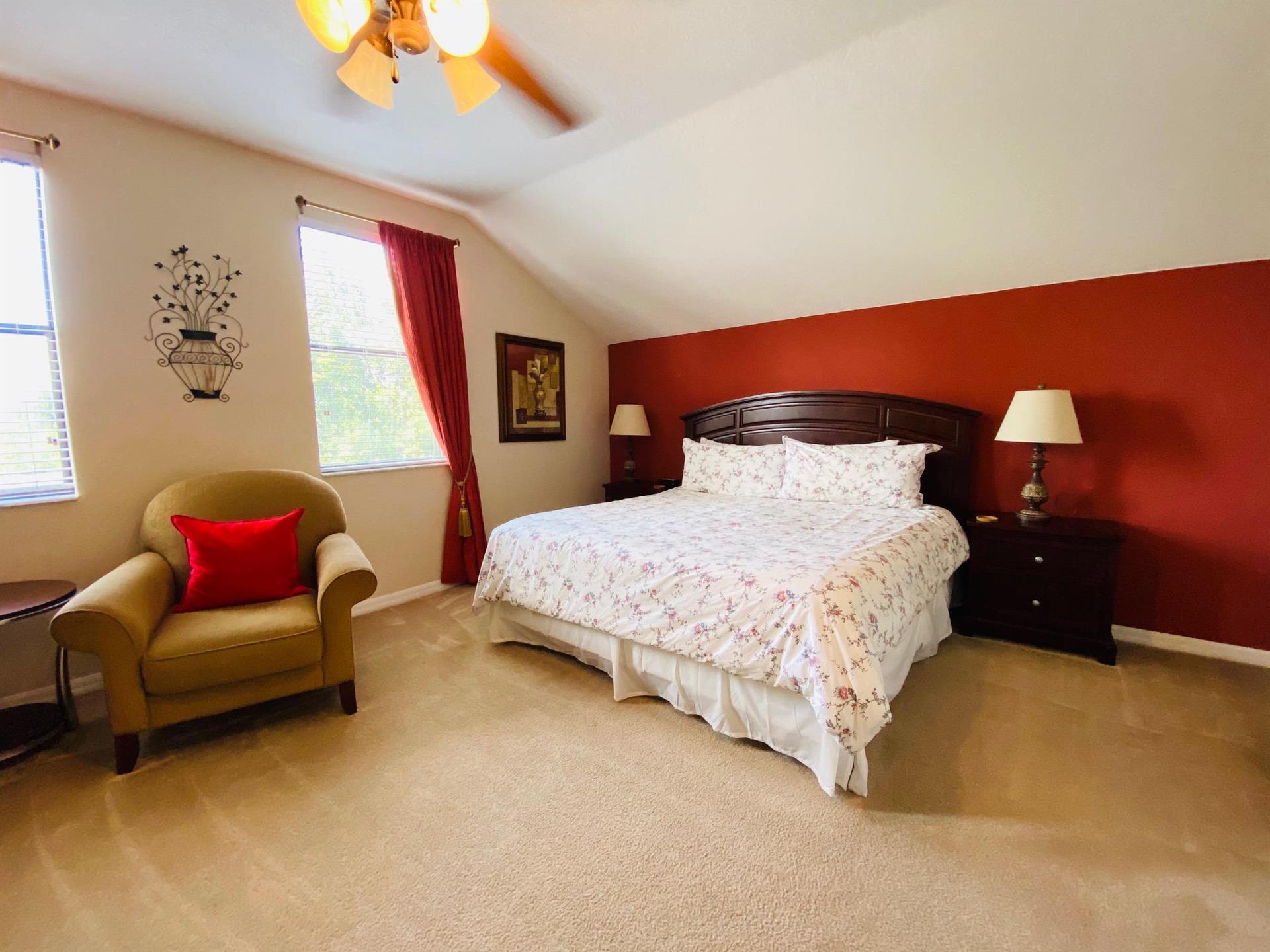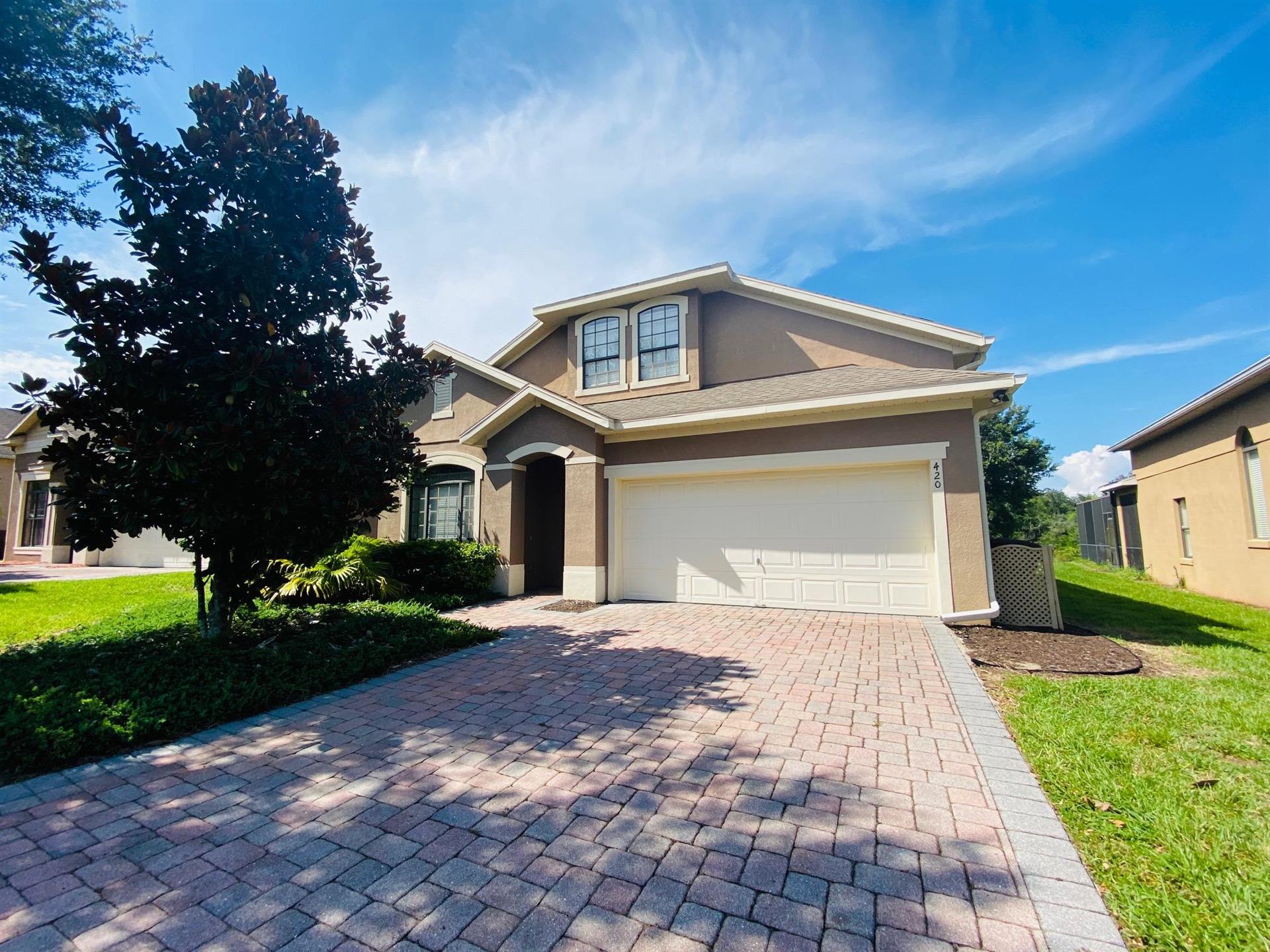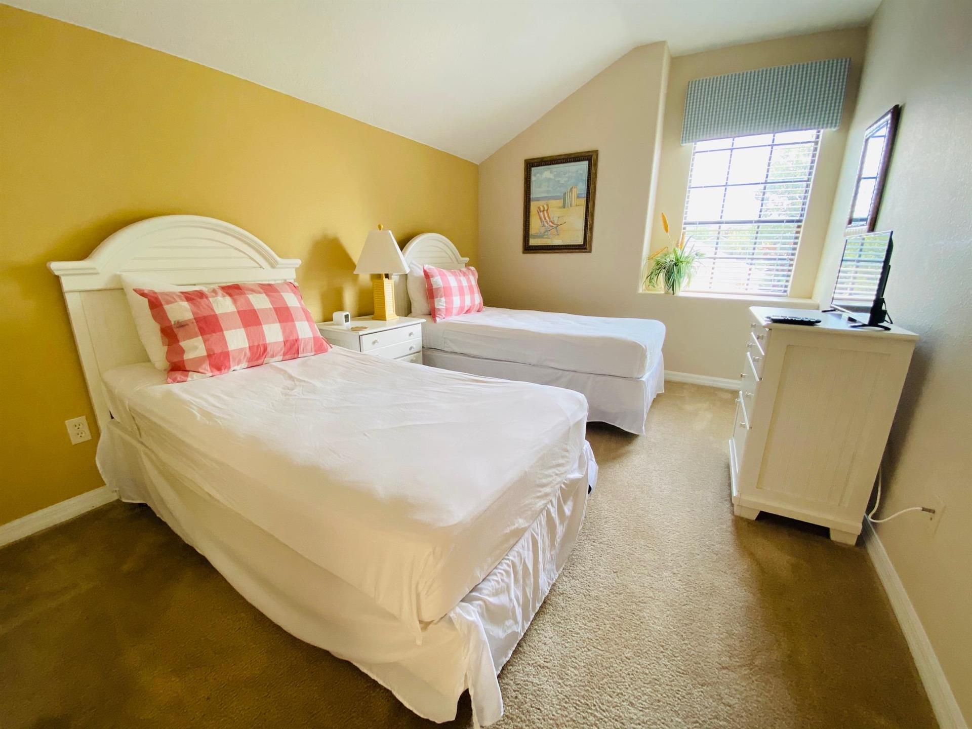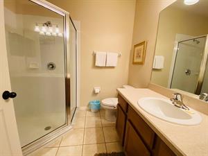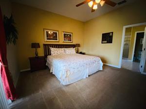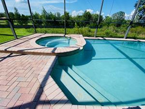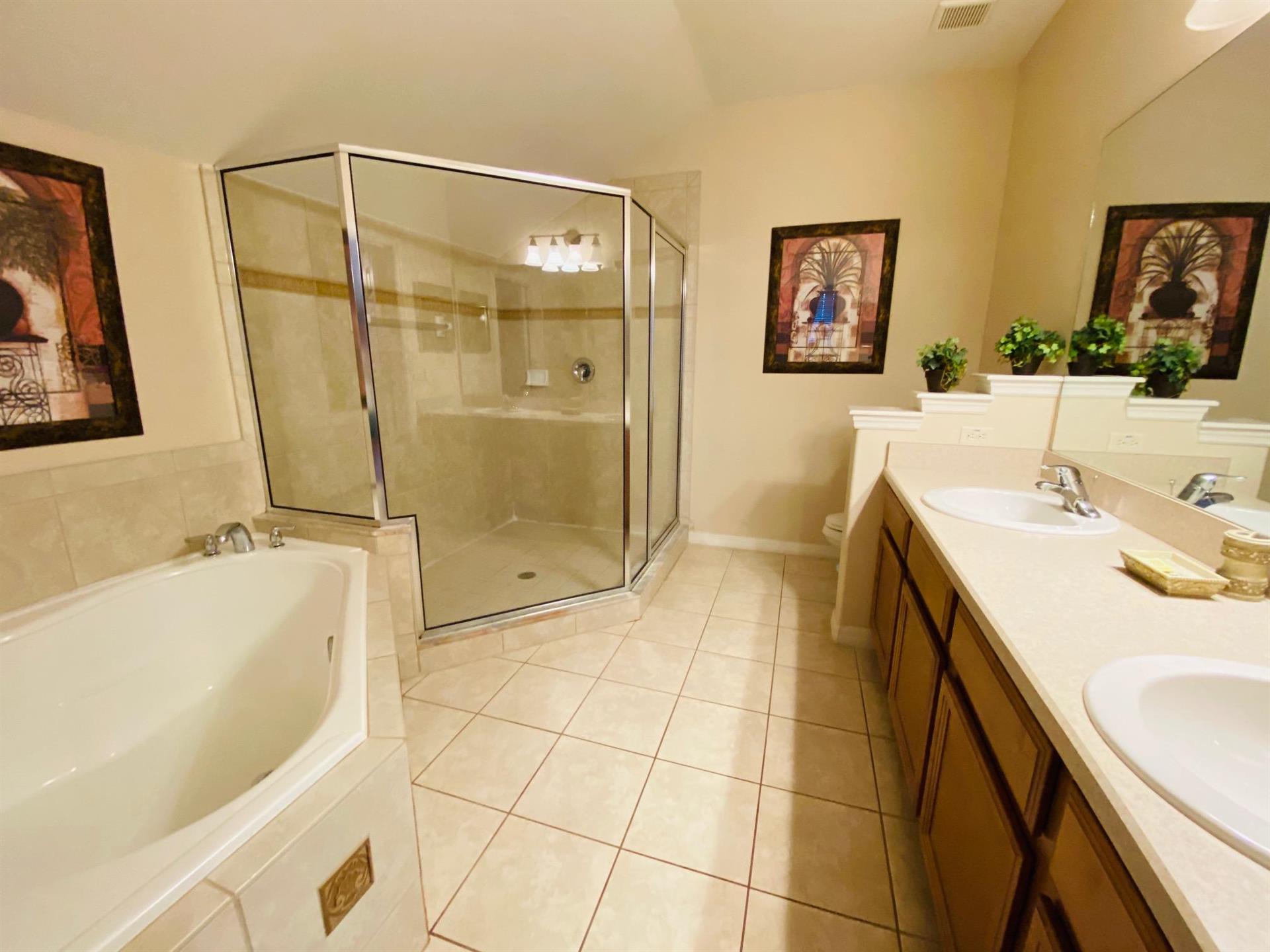 Looking for a 5-bedroom, 4.5-bathroom vacation villa with private pool that sleeps up to 10 people? Keep on reading. This place is great for two families traveling together or one large family because of the bedrooms. The first bedroom, the master bedroom, has a king-size bed and en-suite bathroom. The second bedroom also has a king-size bed. The third bedroom has a queen-size bed. And the fourth and fifth bedrooms both have two single beds, which are great for the younger members of the family. The kitchen is a modest size and has black appliances, black countertops, it comes fully equipped, and it has a breakfast bar with seating for up to 3. If you need somewhere to eat that has more than 3 seats, just behind the breakfast bar is a dining area that has a black rectangular table and six chairs. There’s an additional dining area that also seats up to 6 people. The living room has two comfortable sofas and a large flat screen TV. There are hours upon hours of fun to be had here. If you’d rather have some fun outside, head to the pool. The pool area is screened in and has a large lagoon-shaped pool with spa. There are sun loungers for those who want to work on their tans, and there is a large patio table and six chairs under a covered lanai for those who want to relax in the shade.