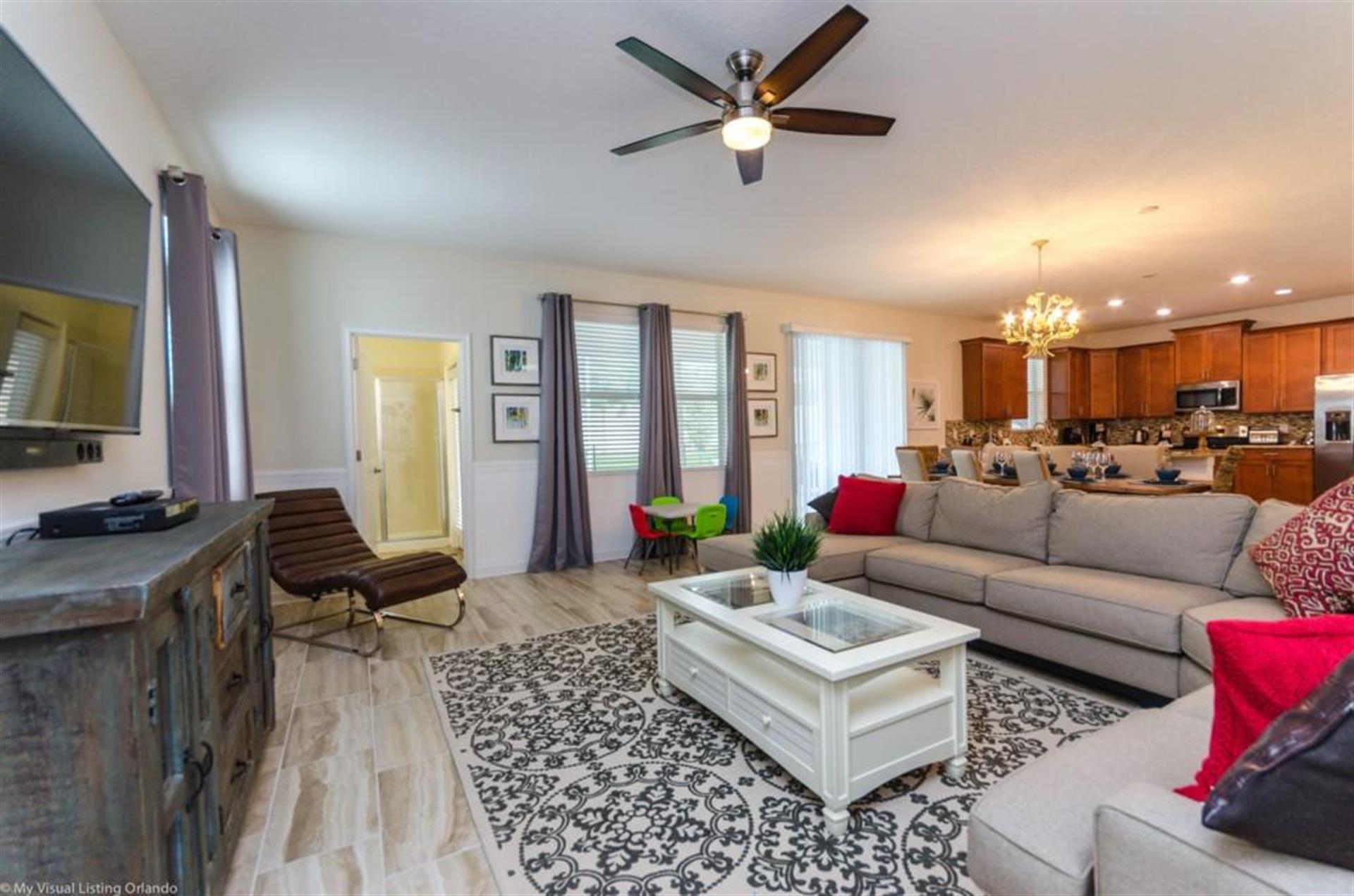 Living room has comfortable sectional sofa with additional Lounge chair a Huge