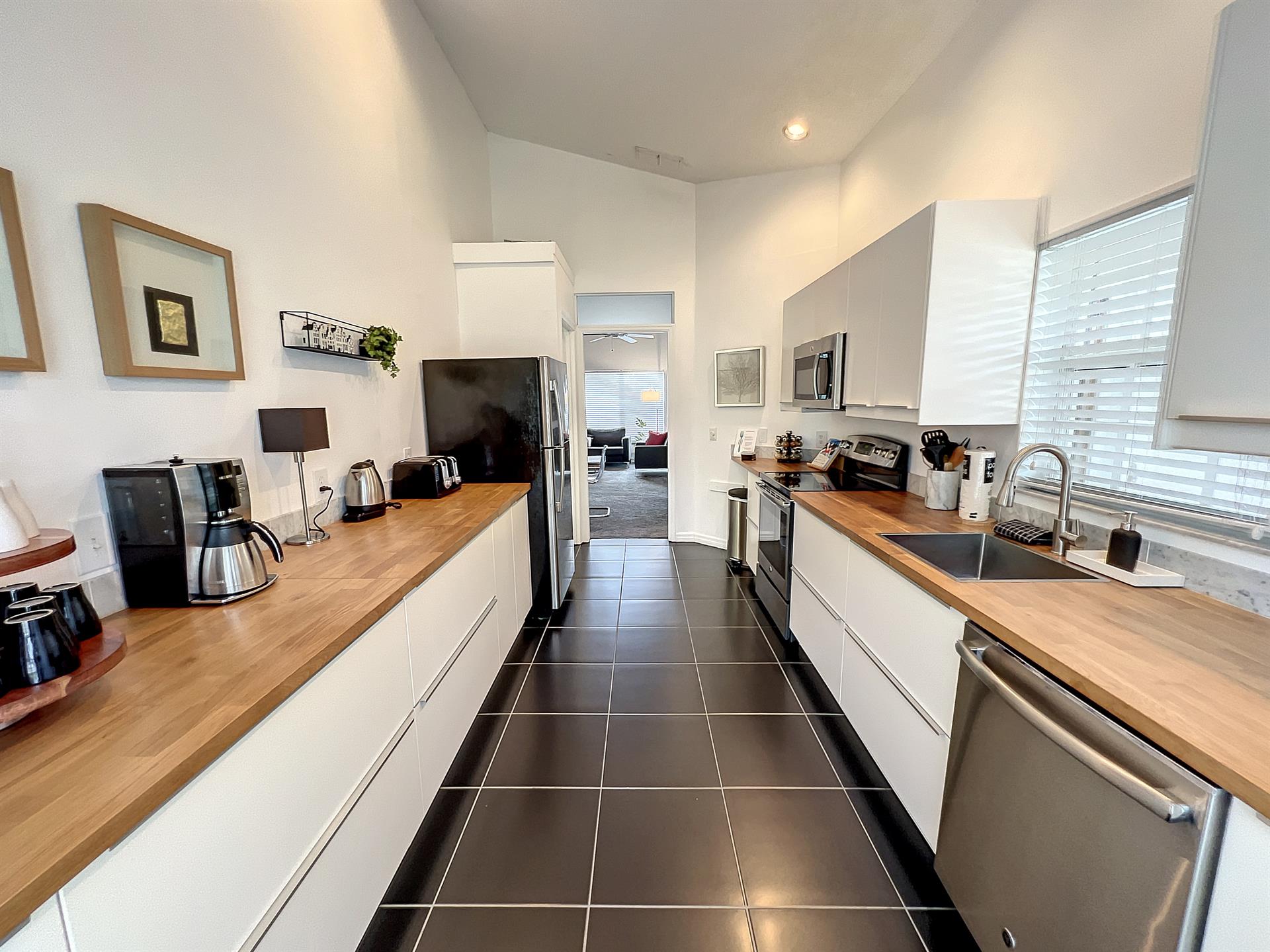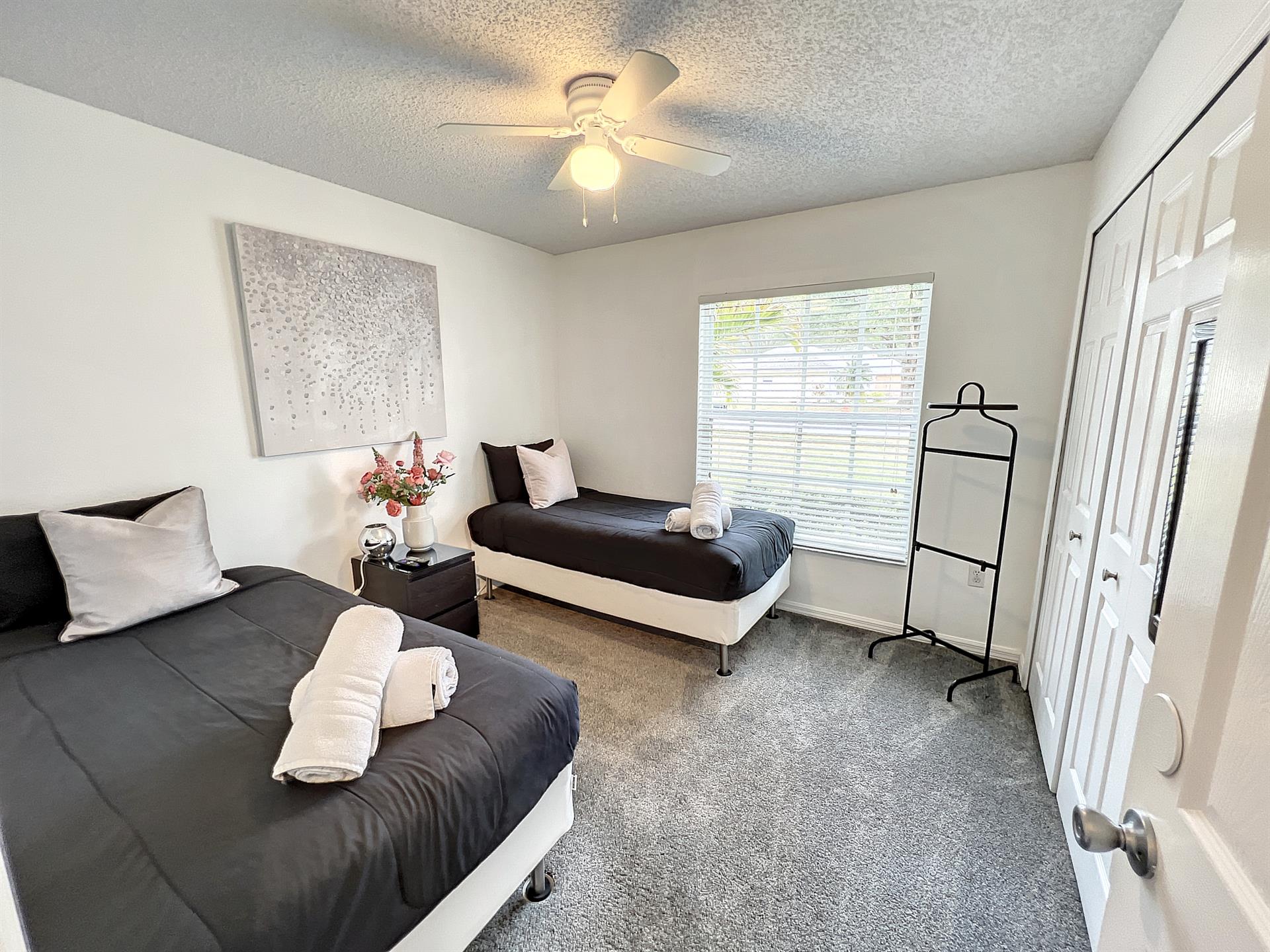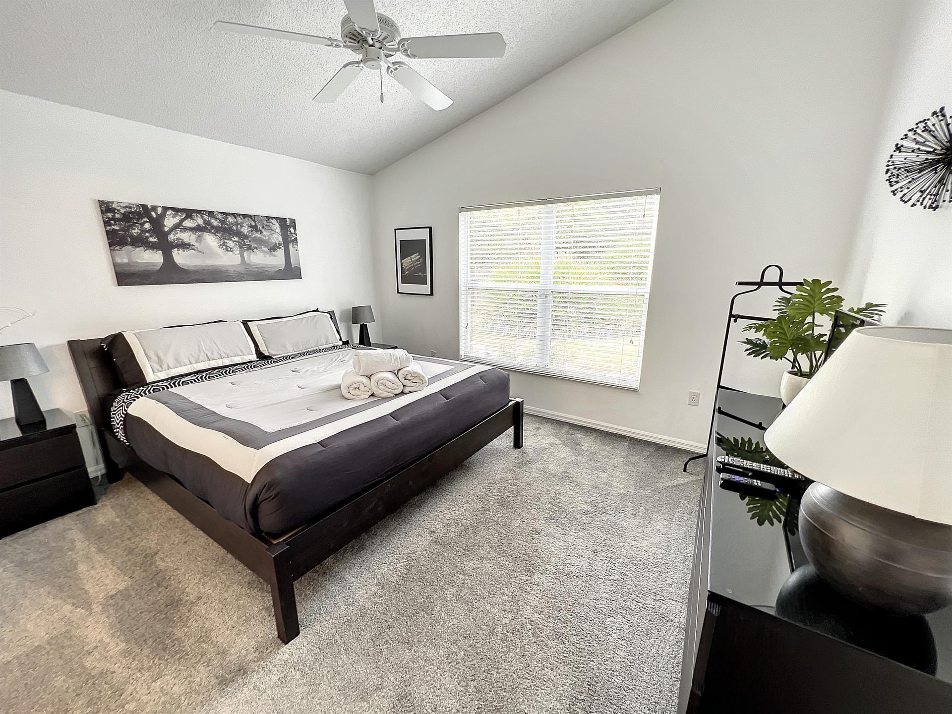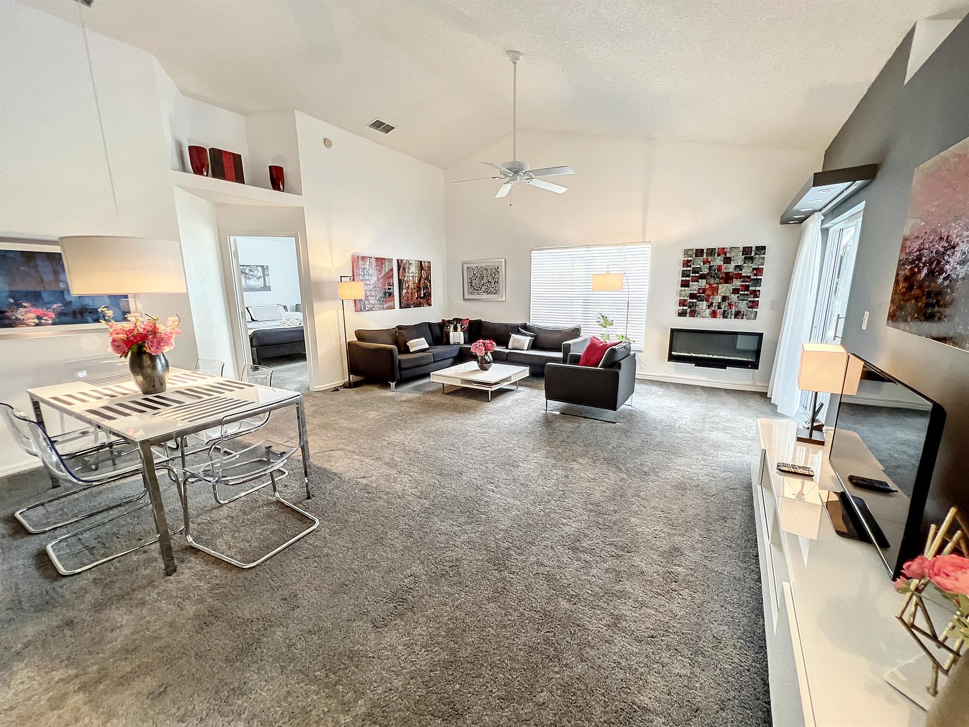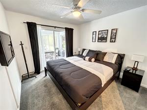This single story home offers a large master suite with a king size bed. The second bedroom also has a king size bed and large tv. The third bedroom has two twin beds.