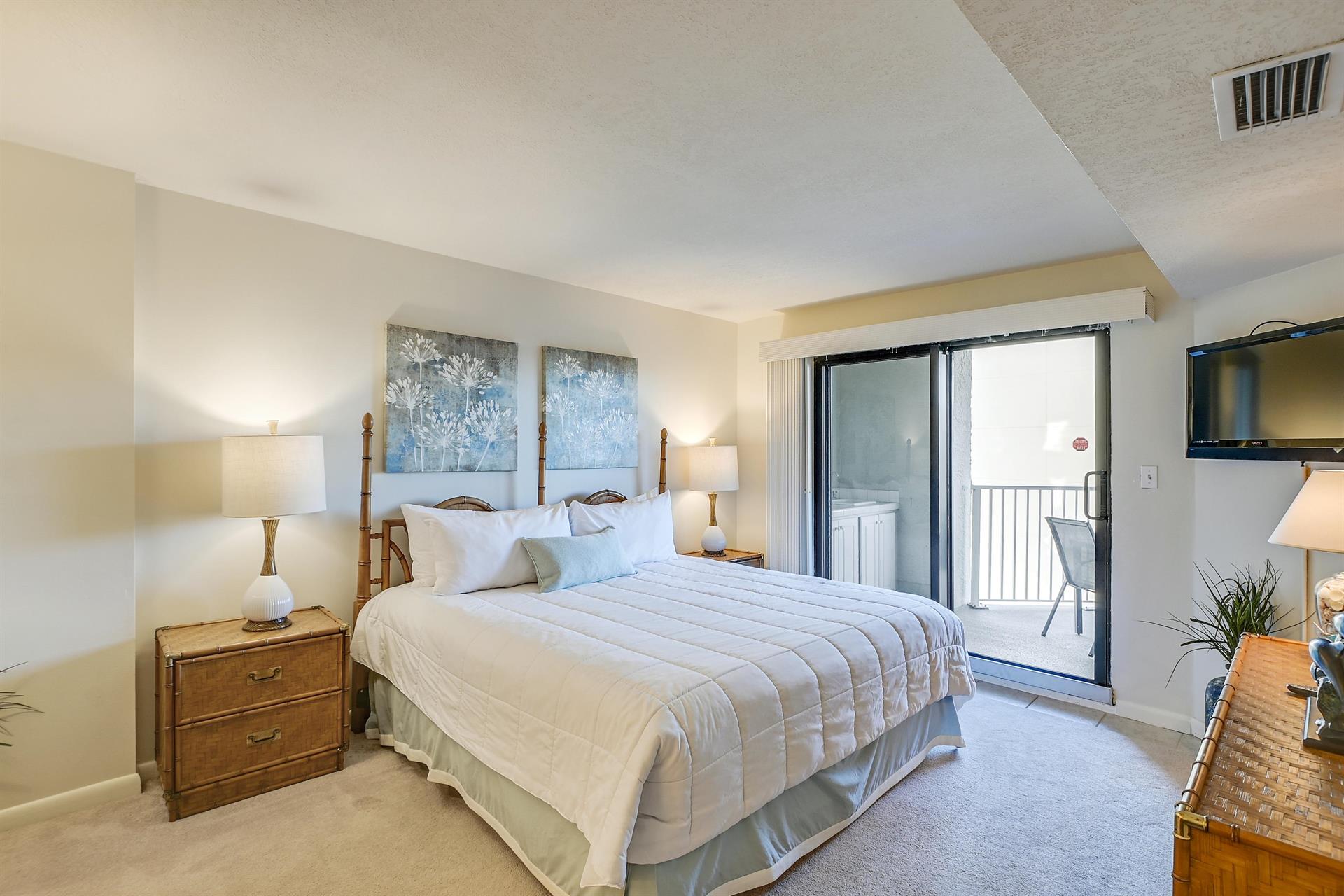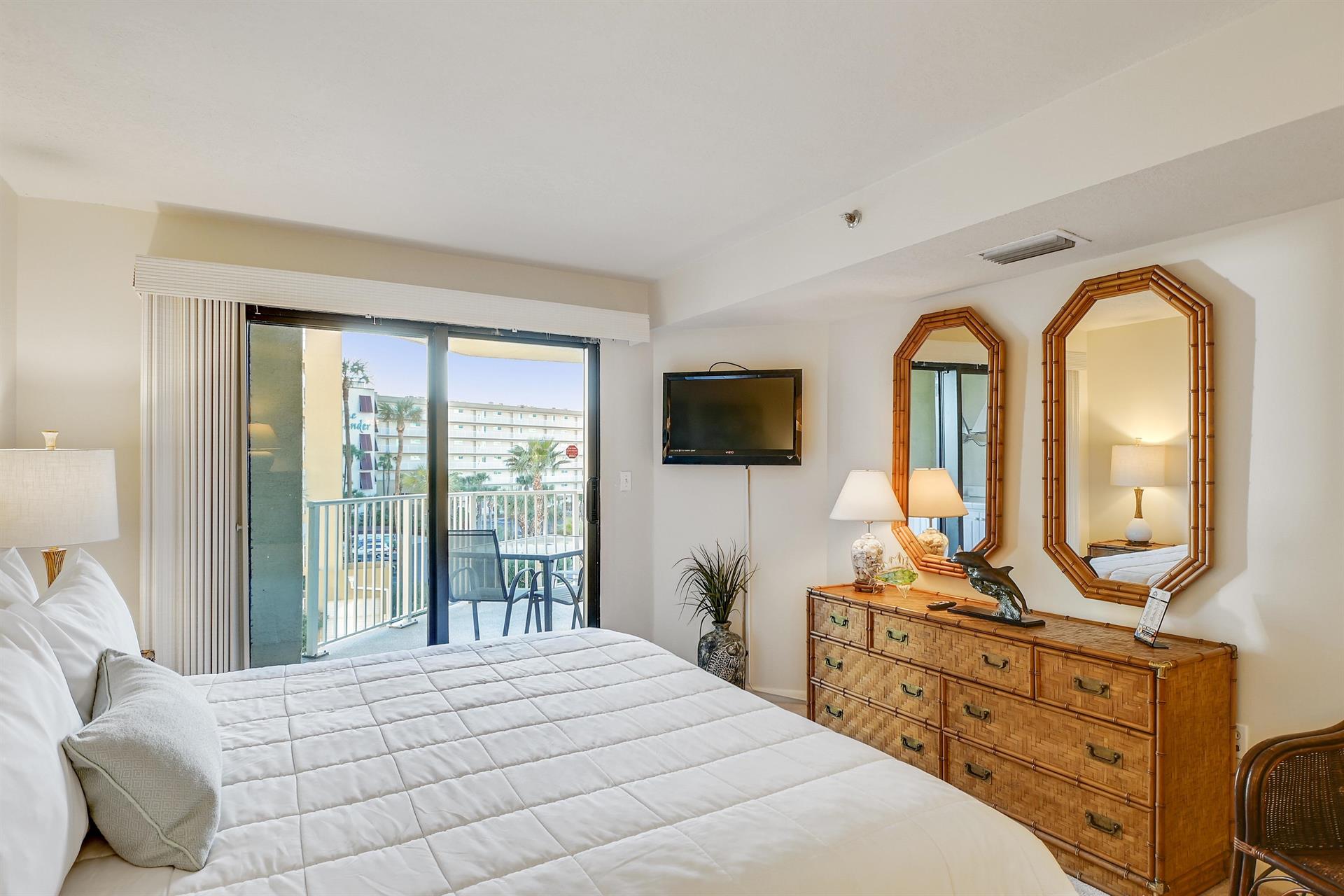 The Master bedroom has a King bed, a wall mounted HDTV, and balcony access.
