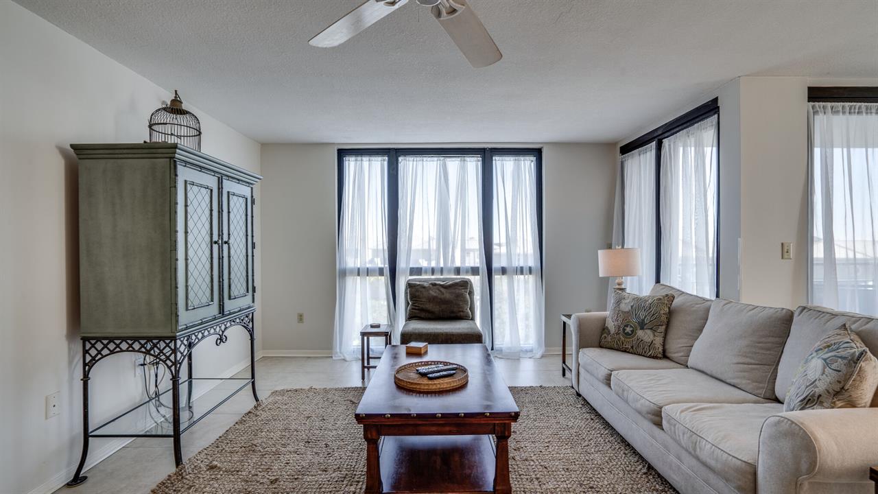 Beautifully decorated 4th floor 3BR, 2BA condo, directly across the street from the beach and within walking distance to Capt Dave's and other fantastic restaurants. This gorgeous three bedroom over-sized condo has floor to ceiling windows in the den and dining area which makes for great views! there is also a balcony off the dining area for your morning coffee. Scenic Gulf Drive is the place to be!