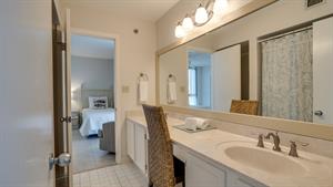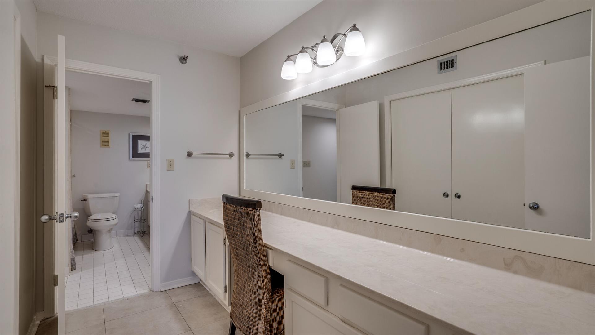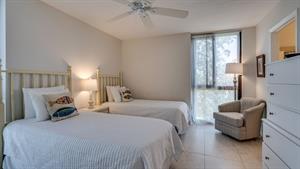 This 3 bedroom condo is perfect for a family and comfortably sleeps 8. Nice view of the pool and grill area from the balcony. The primary bedroom offers a mid-century King bed and bath with walk in shower and open closet. The second bedroom has a Queen bed and two twin beds are in the third bedroom. There is also a sleeper sofa in the den.