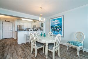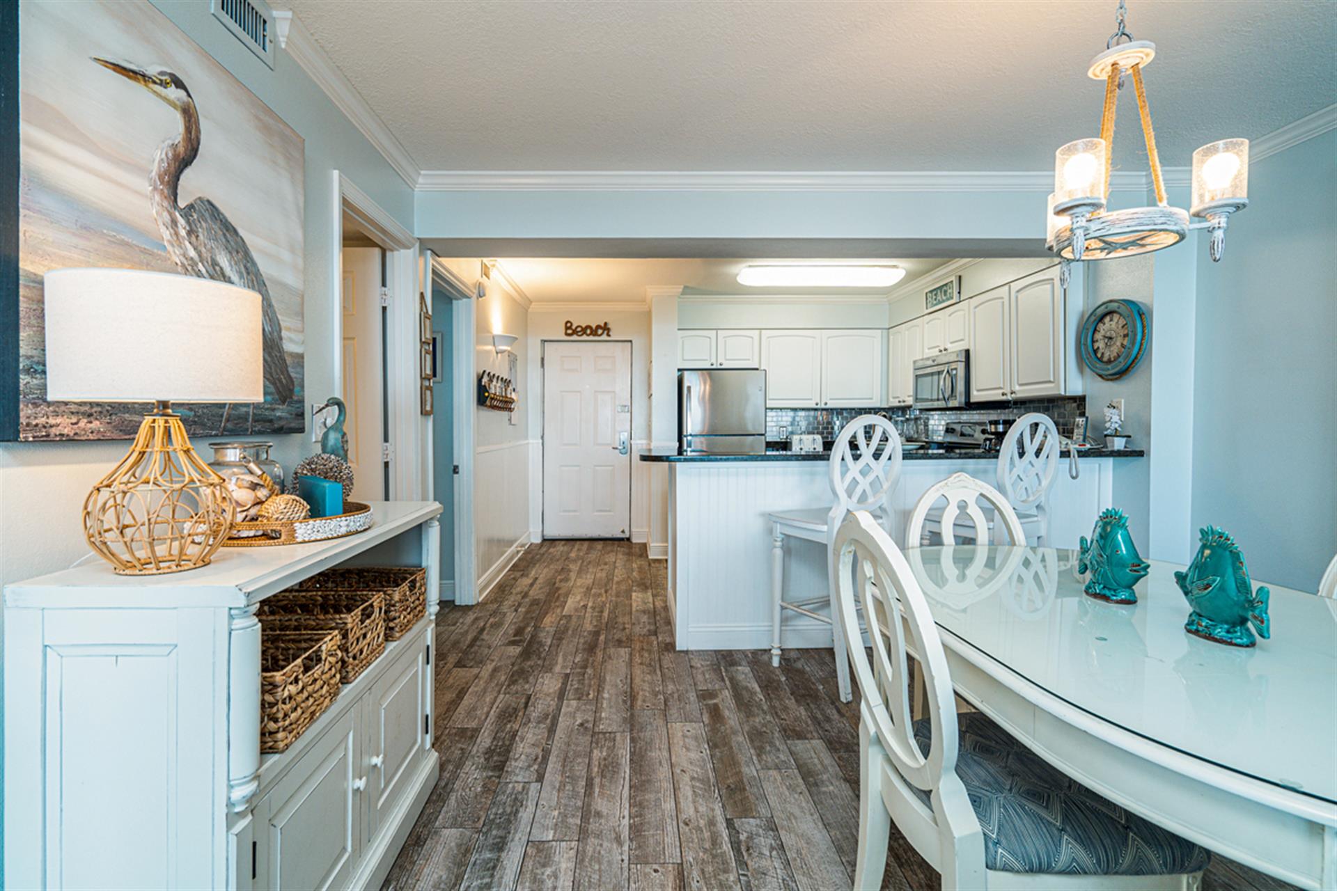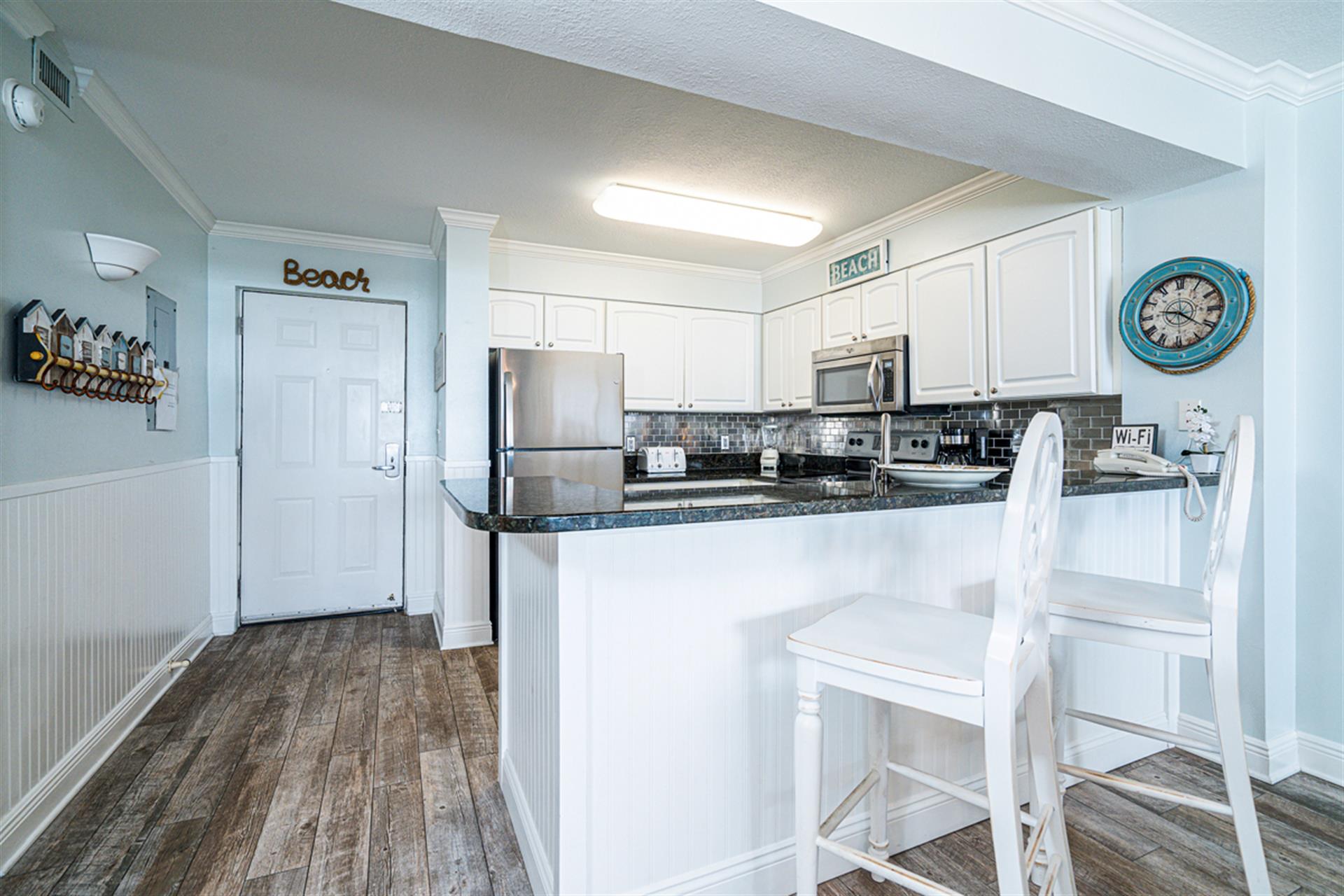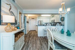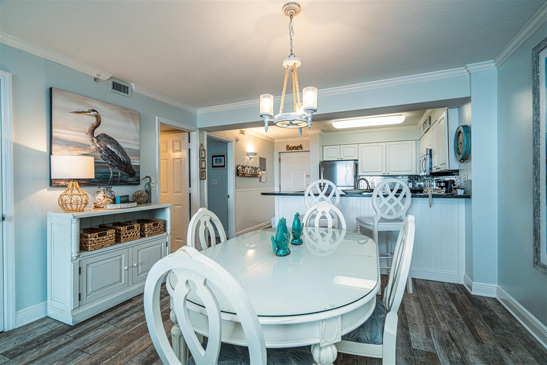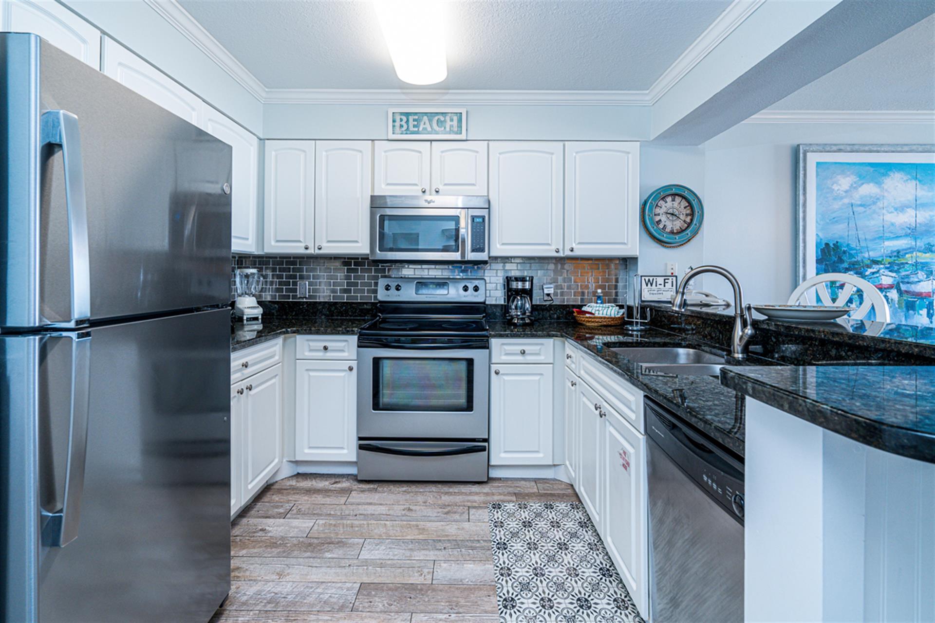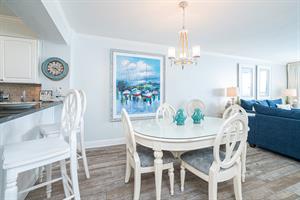 Our condominium offers guests the convenience and flexibility of having a full kitchen and dining area. You will want to cook in this gorgeous well appointed kitchen. The fully appointed kitchen provides the opportunity to wake up each morning and prepare a homemade breakfast before heading downstairs for a swim in one of the pools, a soak in the hot tub, or a workout in one of the resort's two fitness centers. The condominium’s dining area offers the perfect gathering place to enjoy a family meal featuring one of the local fresh catches cooked in the well-stocked full kitchen or on the grilling station poolside. The kitchen is fully equipped with a full-sized range, refrigerator, dishwasher, microwave, coffeemaker, and blender, ensuring that guests have everything they need to prepare their meals.