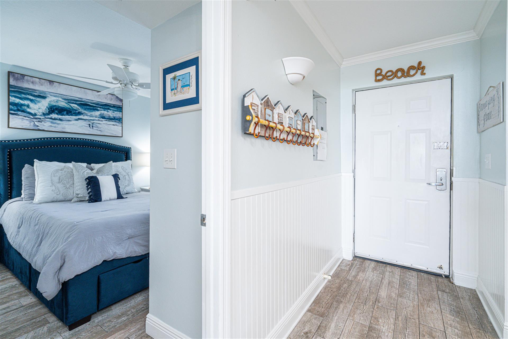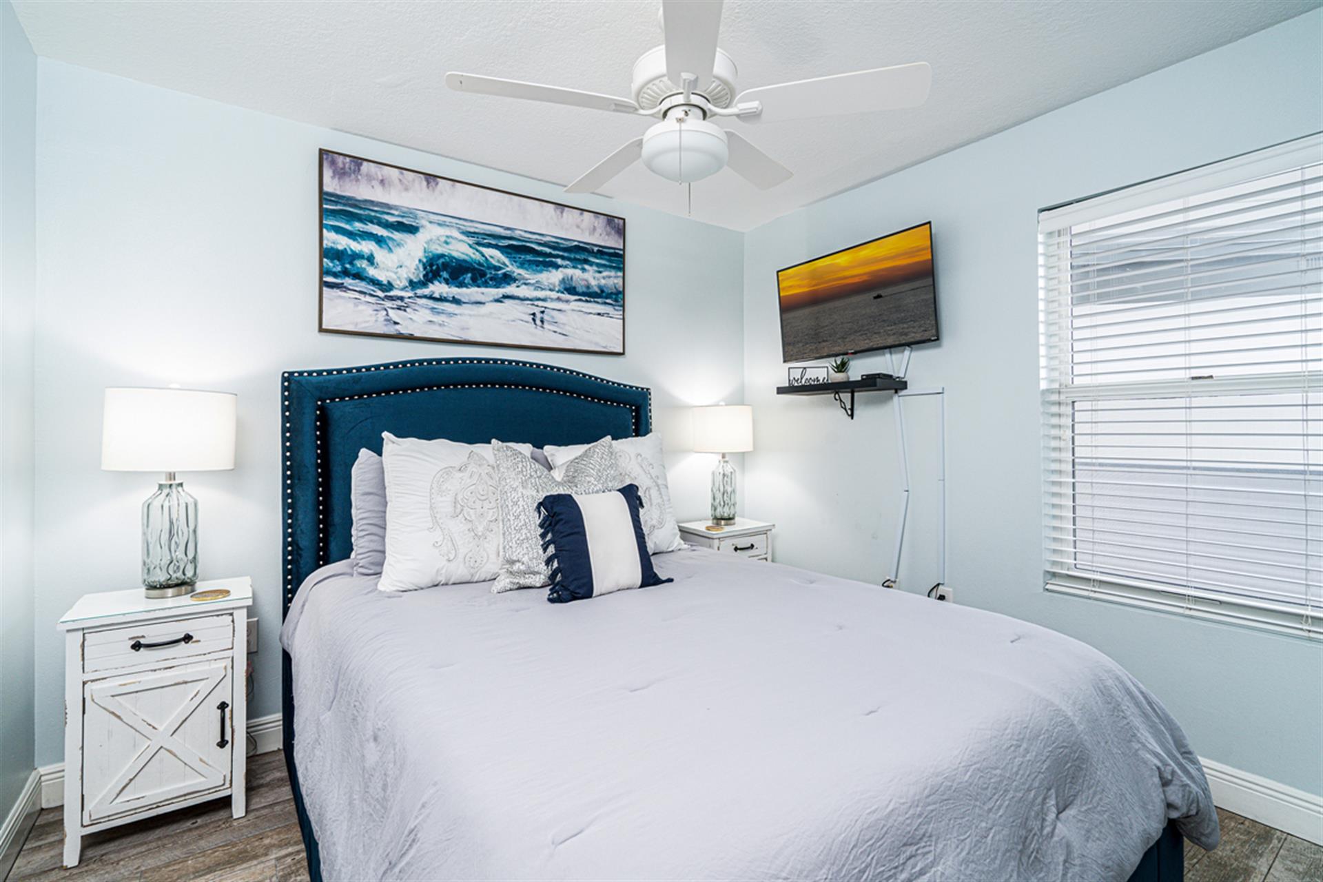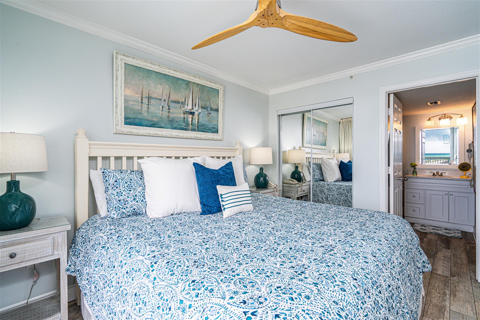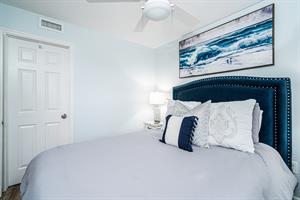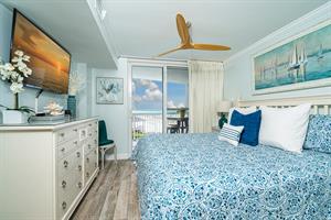 The condo features a spacious layout with a comfortable primary bedroom that includes a plush king-size bed, en-suite bathroom and cable TV. The primary bedroom offers direct access to the balcony via sliding glass door and beautiful eastward views of the Gulf of Mexico. The guest bedroom features a queen bed. The living room also includes a pull-out queen-size sofa bed and a love seat that opens into a smaller bed for additional sleeping options for guests.