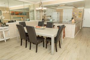 dining table seats six guests comfortably, while the bar seating in the