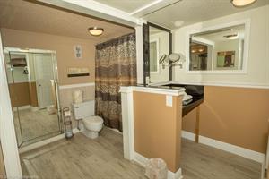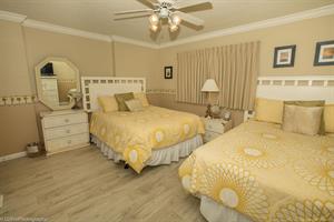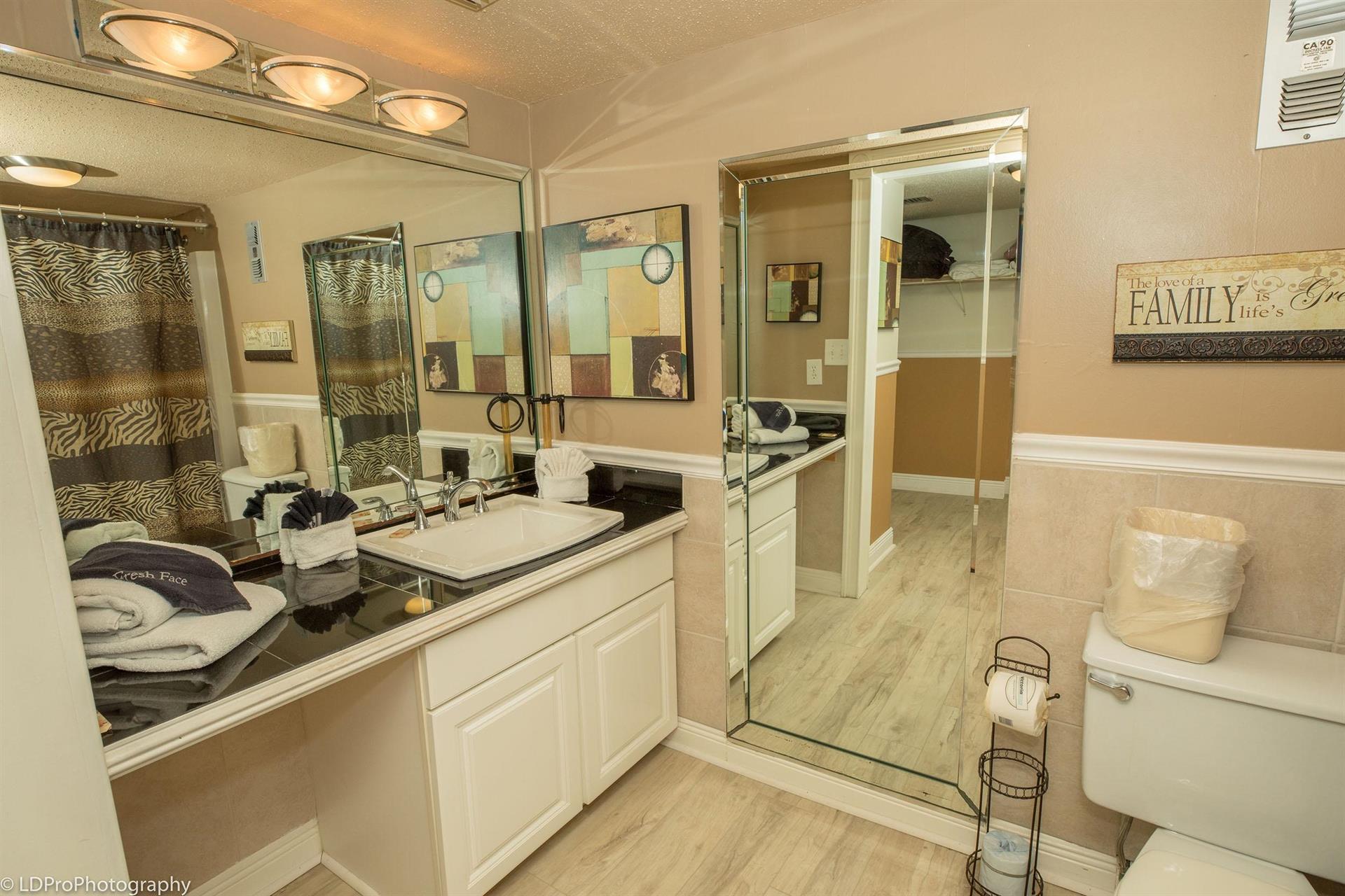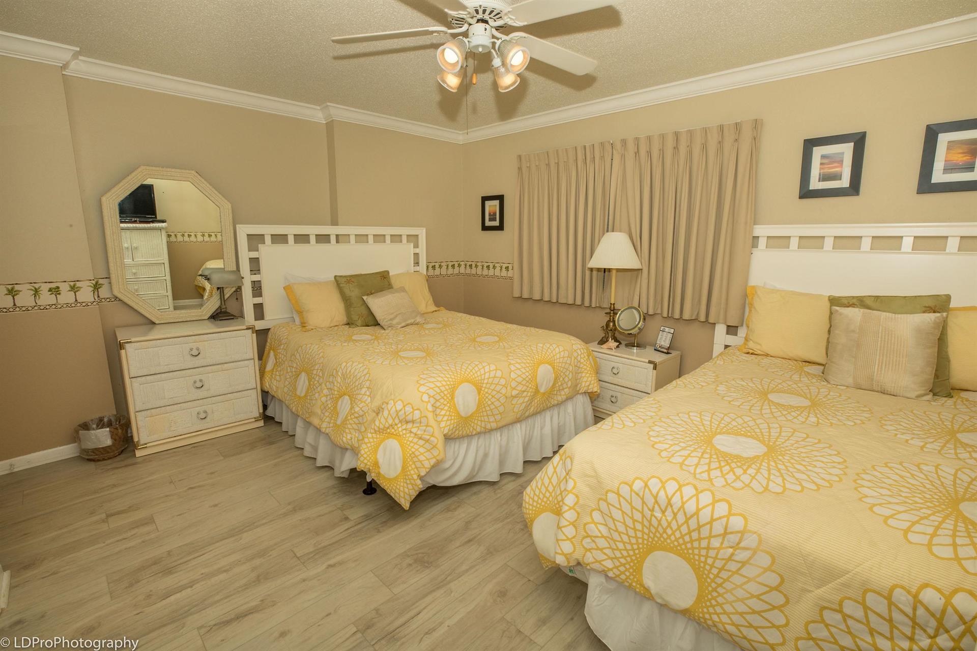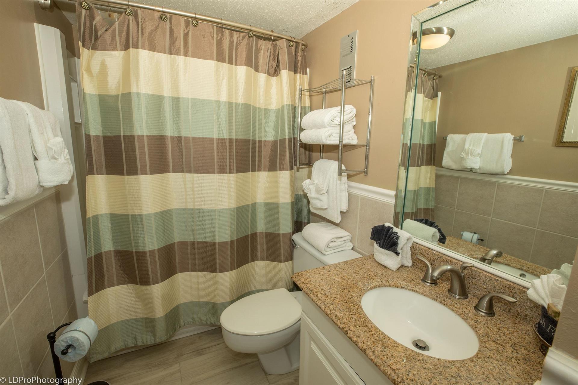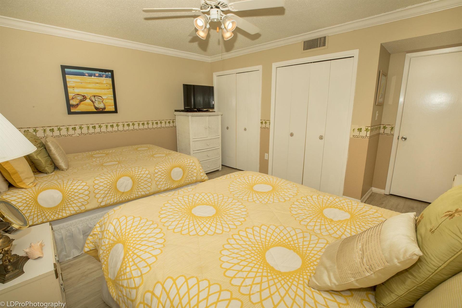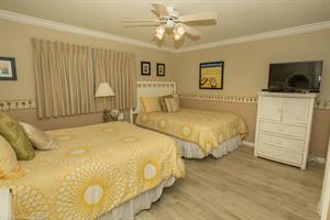 Guest Bedroom has two Queen beds and a TV. The Guest Bathroom has a granite