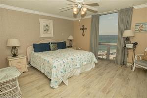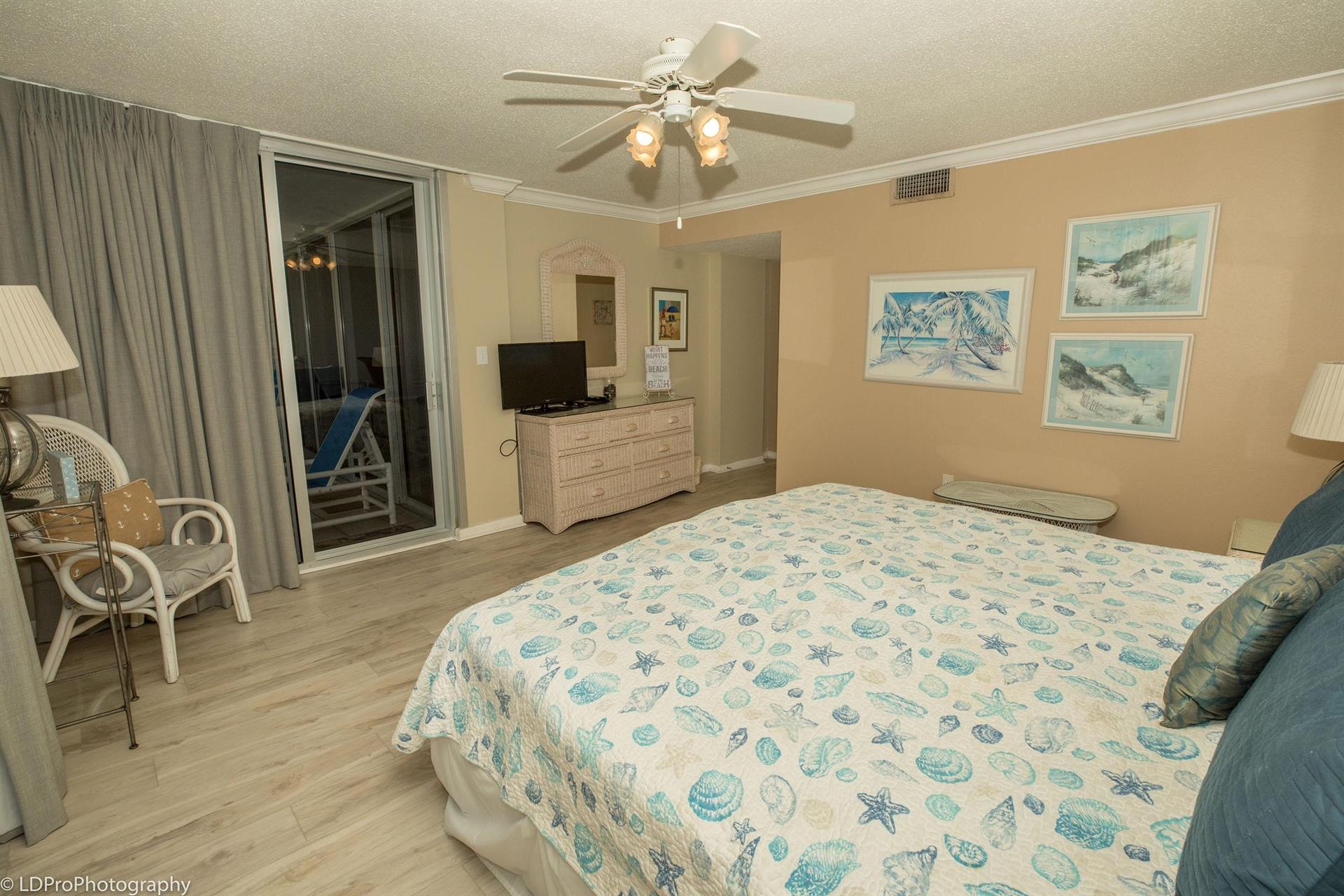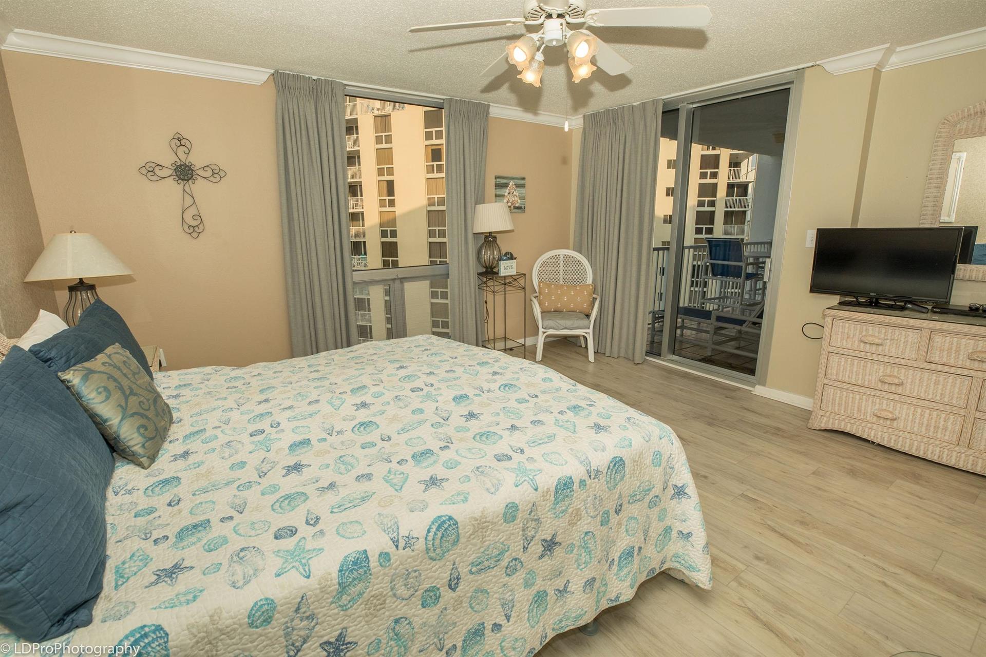 carpeted Master Bedroom boasts a large King bed, a flat screen HDTV, balcony