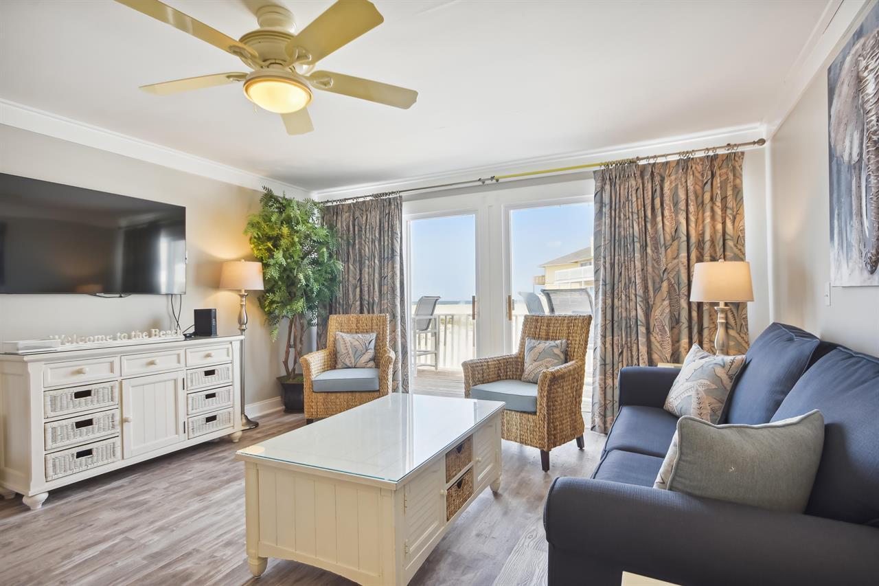 living room with a sofa bed, large flat screen TV and a balcony that looks out