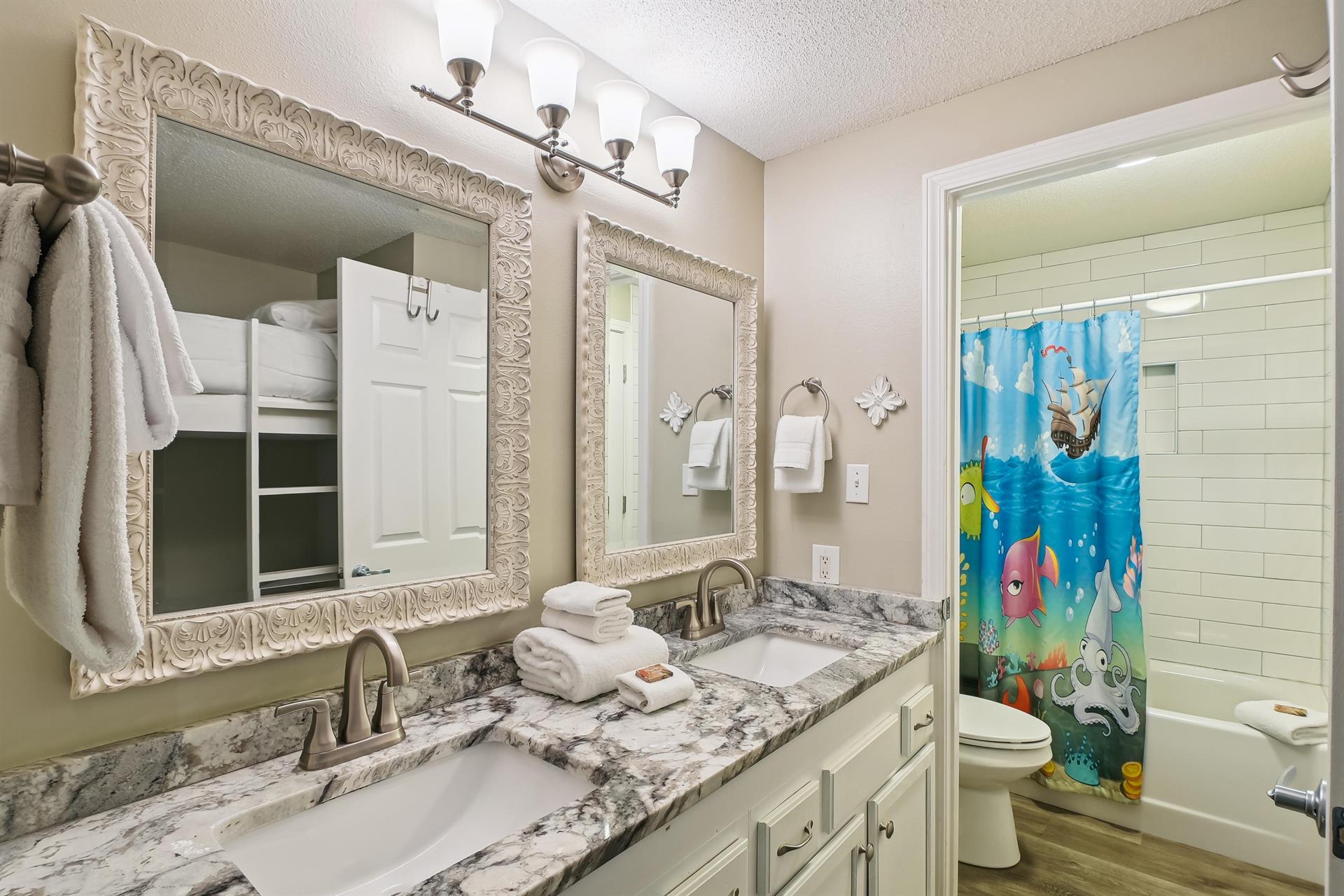 bathroom. New flooring and interior paint. King size bed, bunk beds in hallway