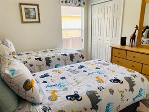 Located in the Southern Dunes Golf & Country Club, this 4-bedroom,2-bathroom vacation villa sleeps up to 8 people and is sure to impress anyone who stays here. Let’s find out a little more about what’s going on under the roof. The first bedroom, the master bedroom, has a king-size bed and an en-suite bathroom that has walk-in shower. The second bedroom has a queen-size bed. The third bedroom is nice and has two single beds. And the fourth bedroom also has two single beds. While the queen beds are great for couples or older children, the single beds are best for young children. There are two living room areas. It has two leathers sofas and is great for having a quiet conversation with others. The second living area is with pool view. It has 2 very comfortable sofas, a flat screen TV, and access to the pool area via glass patio doors, which let in a great deal of natural light. Imagine coming home after a long day out at the parks, exhausted, and just falling backwards into the sofa where you curl up and watch a Disney movie to finish off the night. The kitchen is large and is sure to impress any cook. It comes fully equipped with granite coutertops and has modern stainless-steel appliances, tile flooring, and views of the dining area and living room. The dining area is right next to the kitchen and has a table with 6 chairs around it, meaning there’s enough space for everyone to sit down together and enjoy a meal. Ready to head outside? Great! The screened-in pool area is a great place to enjoy some swimming in the large pool, sunbathing, and relaxing. Did we mention this house has Wi-Fi access?