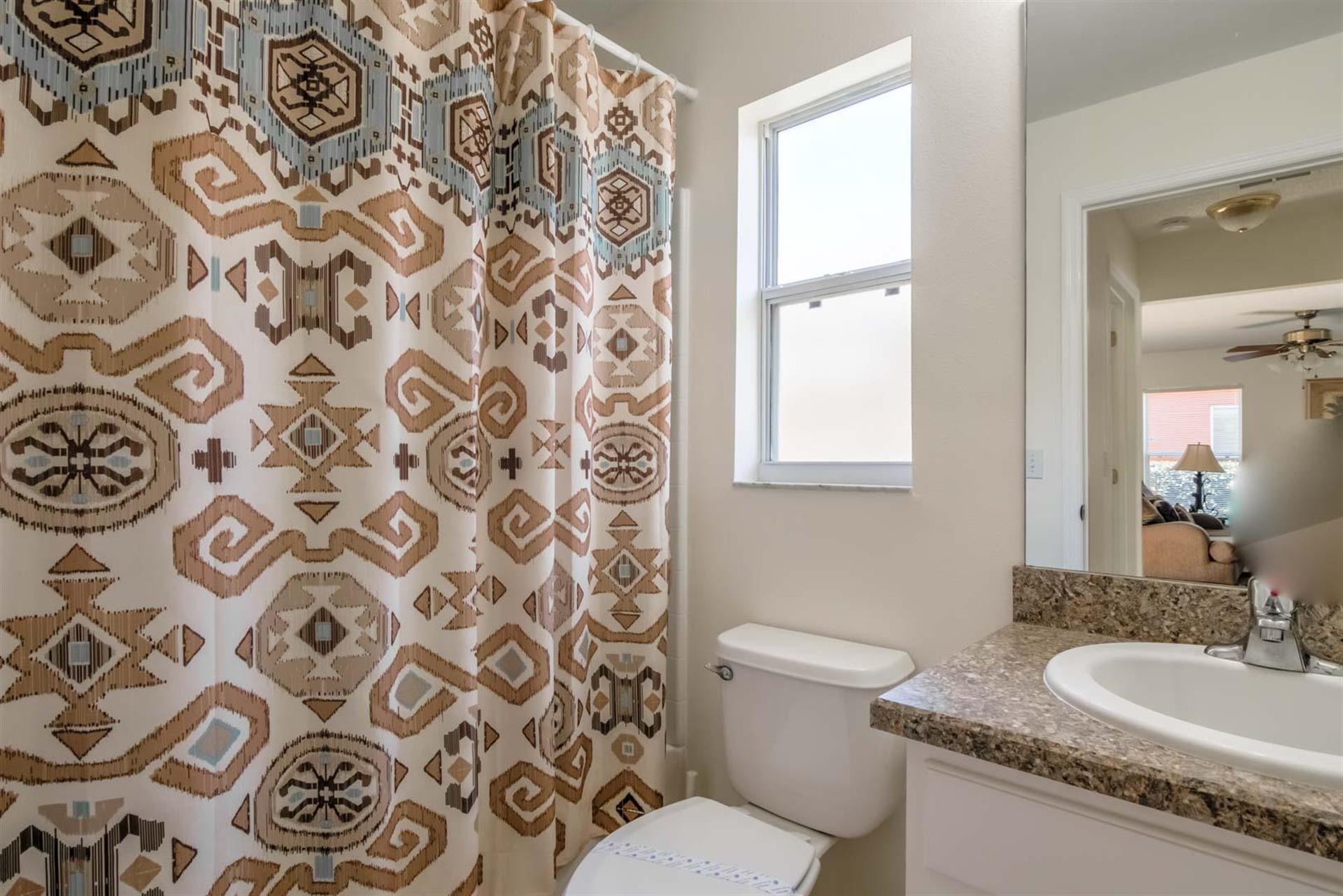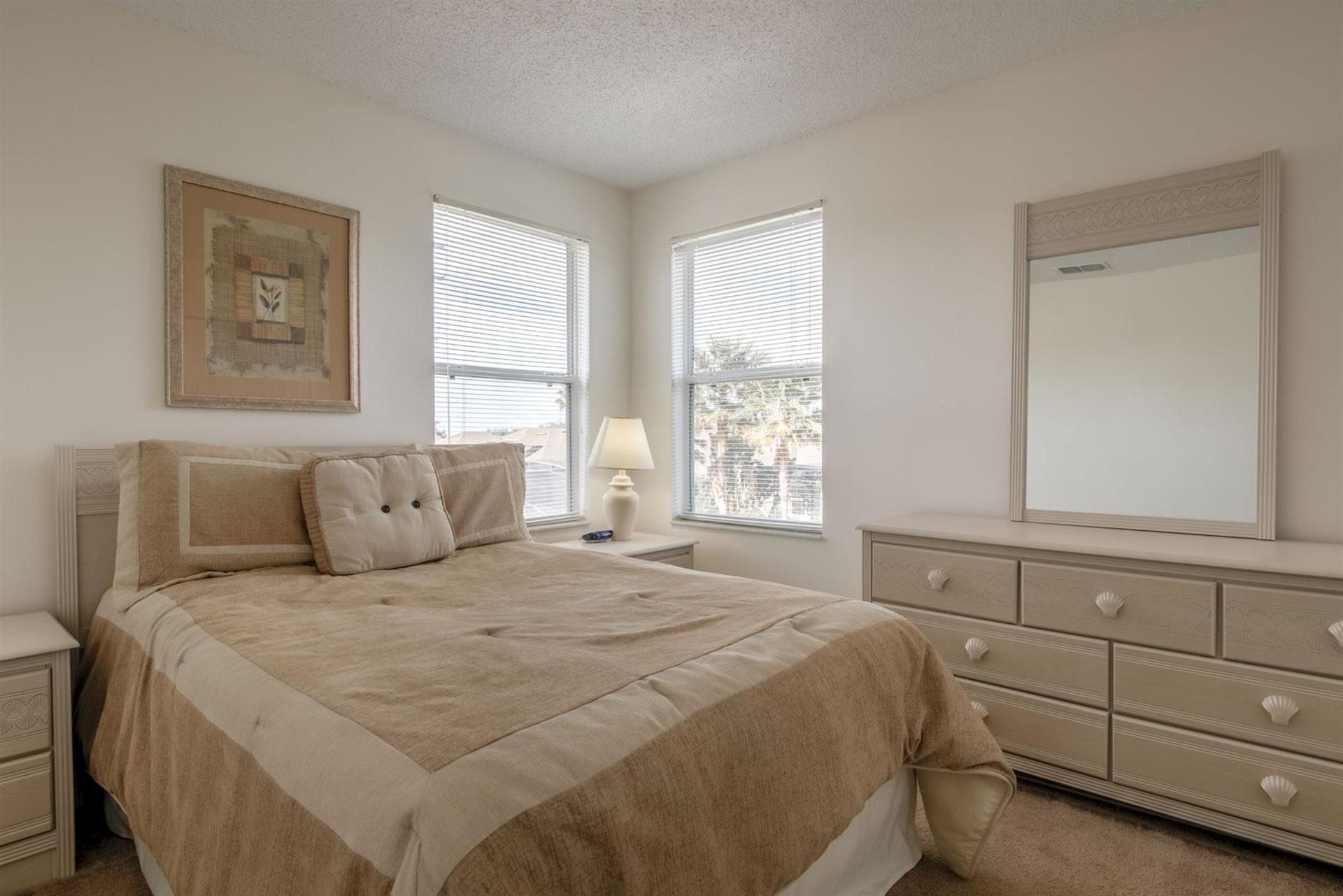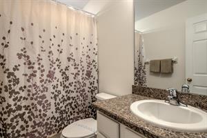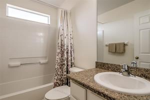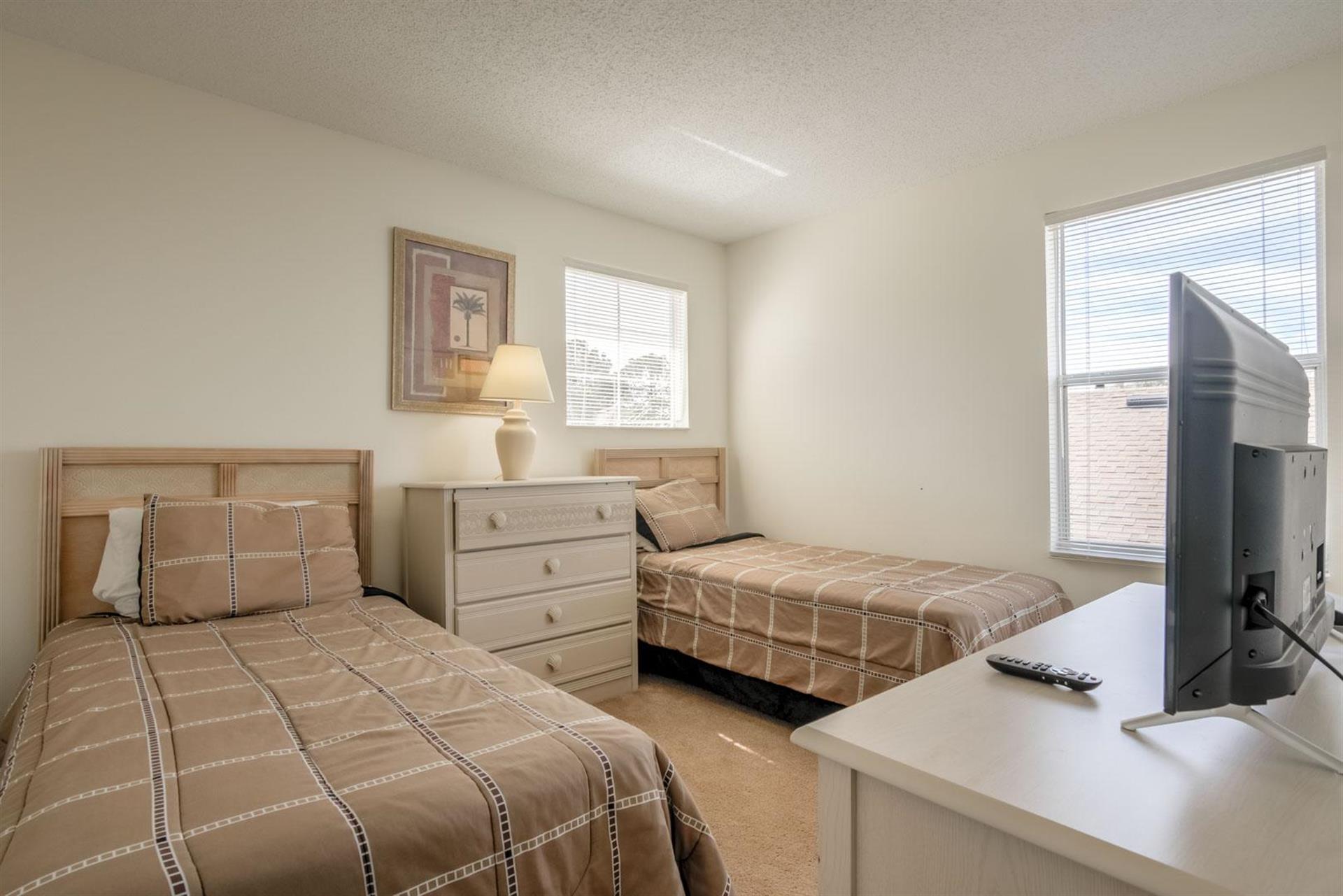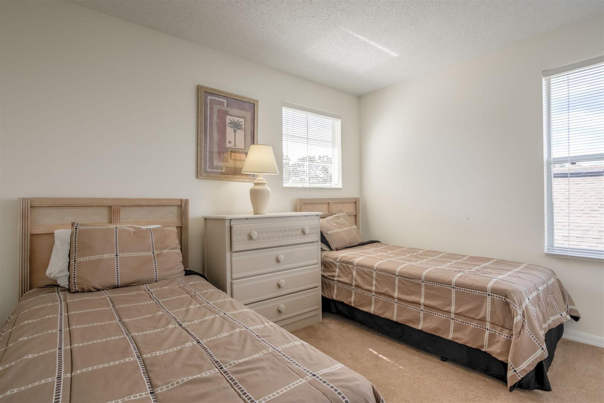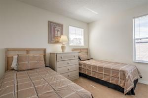 Attention all: We have a 2-storey, 4-bedroom, 3-bathroom vacation villa with a private pool up for grabs. Check out this place a little before you place a booking by reading about what this home is like inside. Let’s start with the U-shaped kitchen. It’s functional and comes fully equipped with all the small appliances, kitchen tools, bowls, forks, etc. that anyone might need when cooking. Once you’ve cooked up something great, now it’s time to find a place to eat it at. It appears we have two options: the breakfast bar or the formal dining area. The breakfast bar is a part of the kitchen and only has 2 seats, so we’ll probably going to need to head to the formal dining area where there’s seating for up to 5 (possibly 6) people. Here, everyone can gather around the table and enjoy a meal together. After enjoying such a large meal or after a long day out at the park, where better to relax than in the living room. There are two large sofas for everyone to lounge on, and there’s a large flat screen TV mounted to wall for everyone to enjoy a good Disney movie on. Let’s head to the covered pool area. It’s pretty self-explanatory. You can take a dip in the pool to cool off, lay down on a sun lounger to work on your tan, or if you just want to take it easy outside with a cold beverage, take a seat around the patio table that’s under the covered lanai. There are 4 bedrooms. The first bedroom, the master bedroom, has a king-size bed, plenty of space, and an en-suite bathroom that has dual vanities, a tub, and a shower. The second and third bedrooms both have queen-size beds, which are perfect for couples. And the fourth bedroom has two single beds in it, which are perfect for kids.