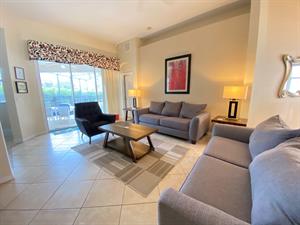 There are two living room areas. Downstairs, there is the main living area that has 2 tan leather sofas, a tan leather overstuffed armchair, a large TV, and another pair of glass patio doors that lead to the pool area.