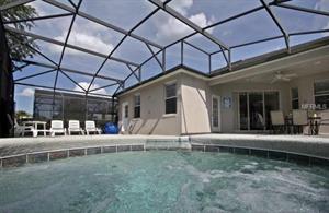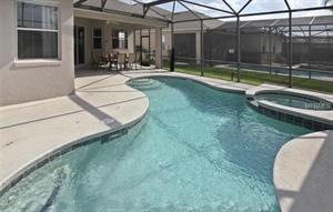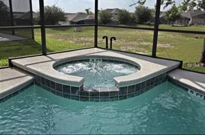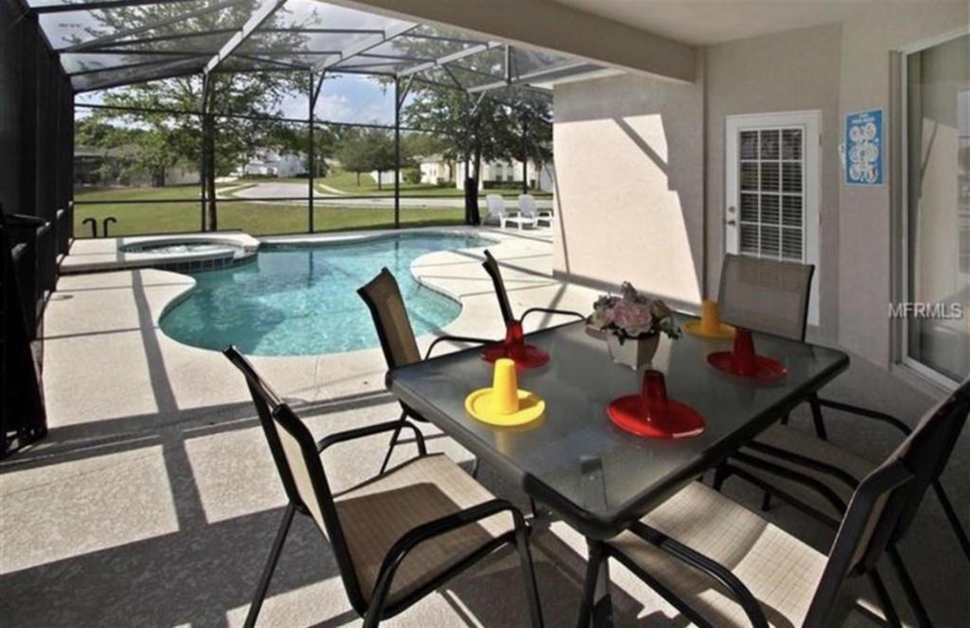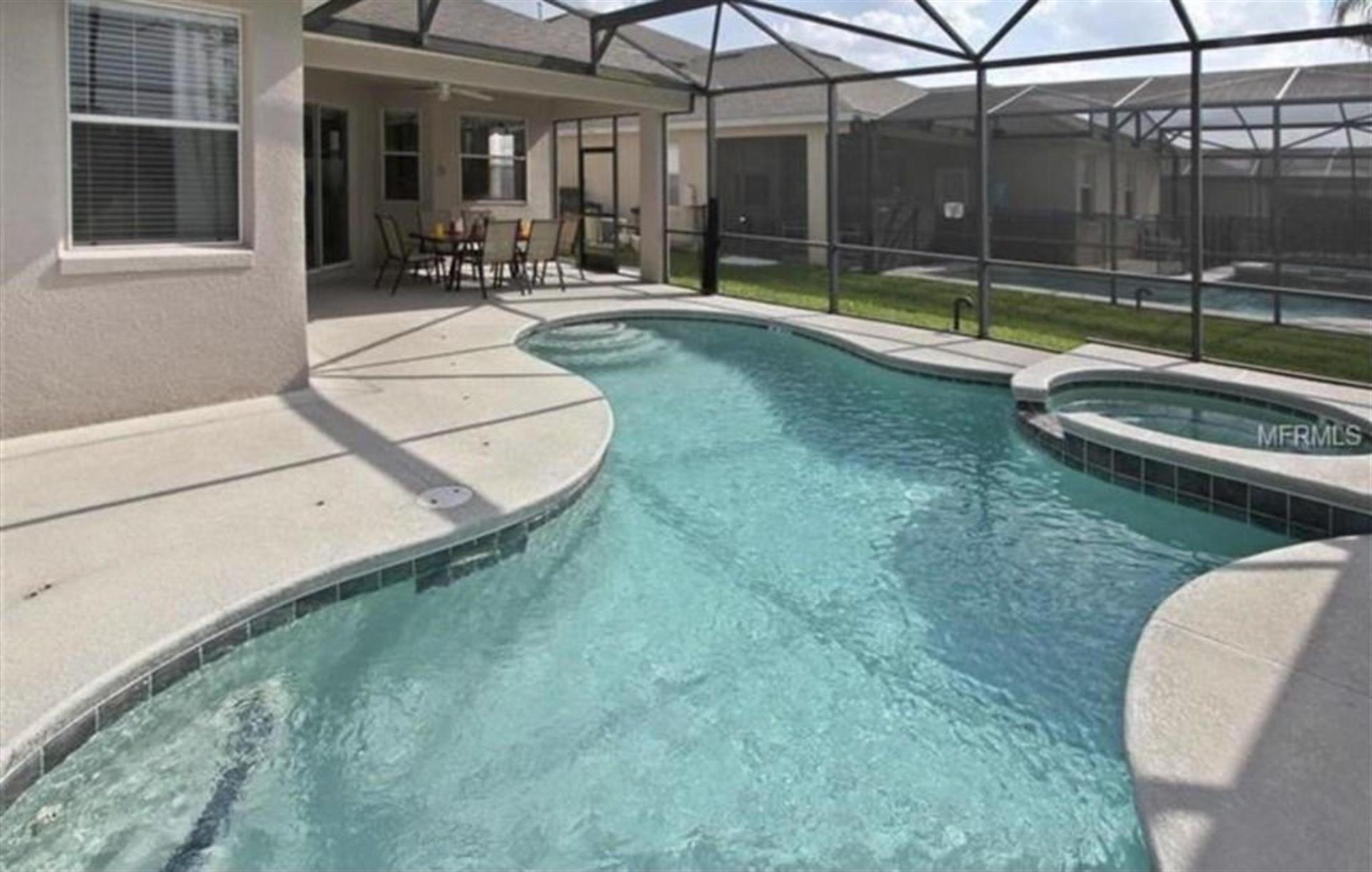 Head outside to the screened-in pool area, and you’ll find a large pool to swim in, sun loungers to sunbathe on, and a patio table and chairs to relax on with your favorite ice-cold beverage. Along with the pool, there's a spa, which is a resting area of the pool (not a hot-tub or Jacuzzi). If pool heating is added (at extra cost), spa can be heated at the same time and temperature as the pool.
