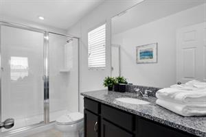 It has a monstrous, walk in shower with a large vanity that has dual sinks.