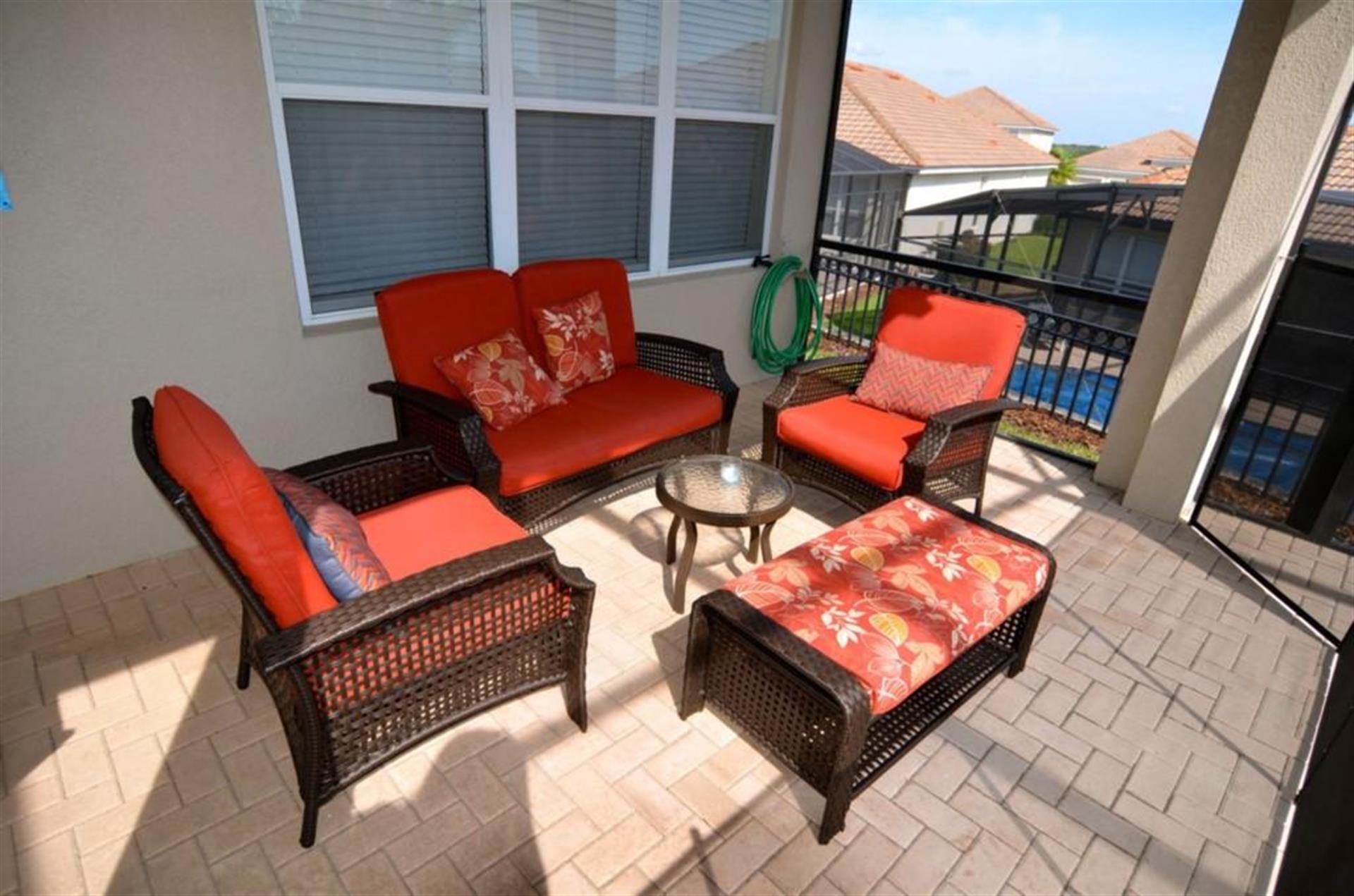 loungers and a comfortable sofa set. The pool looks out over an attractive